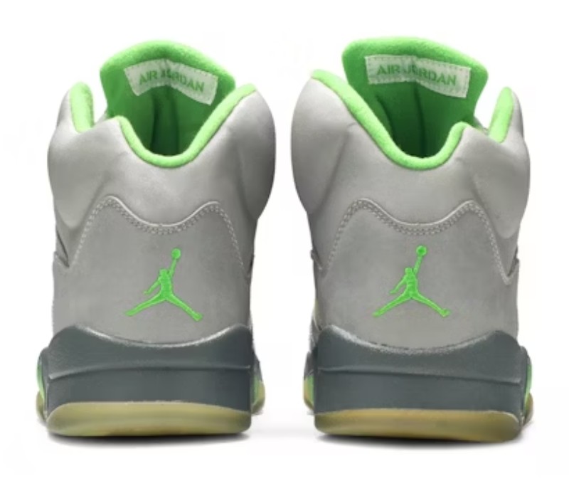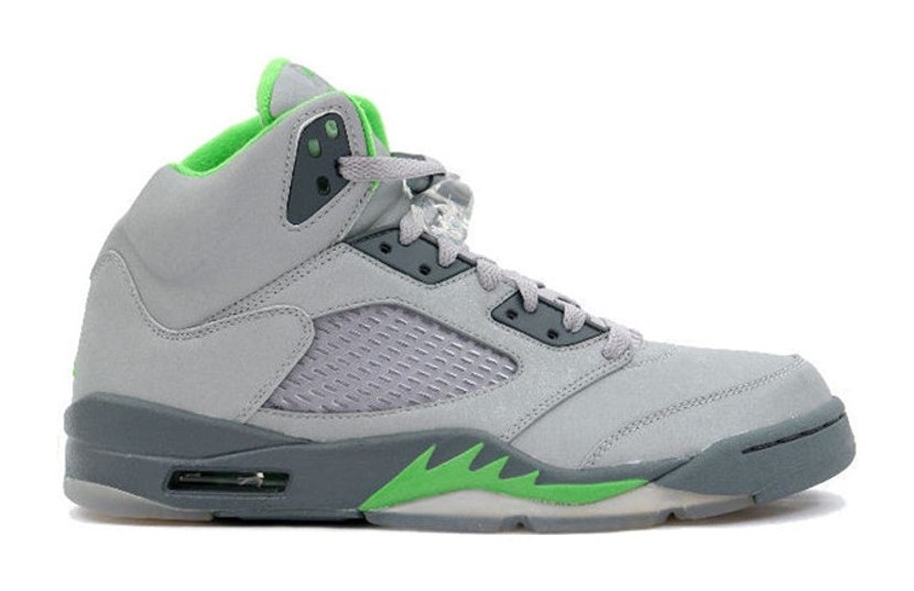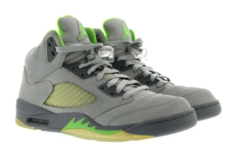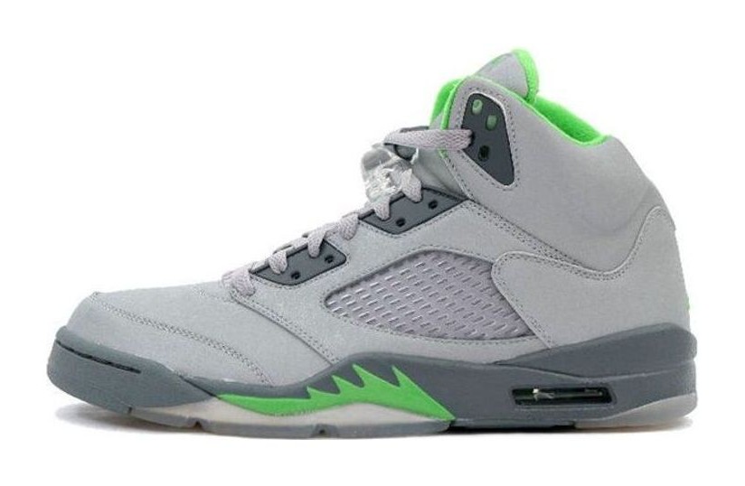 This model is the original 2006 retro release of the Air Jordan 5 in the 'Green Bean' colorway. It is famous for its completely reflective silver upper (which shines brightly when hit by light), giving it a distinctive look that was new to the Air Jordan 5 silhouette. The main accents are the bright Green Bean color on the inner lining, the Jumpman logos on the tongue and heel, and the signature shark teeth on the Flint Grey midsole. The shoe sits atop a translucent outsole.