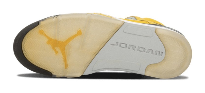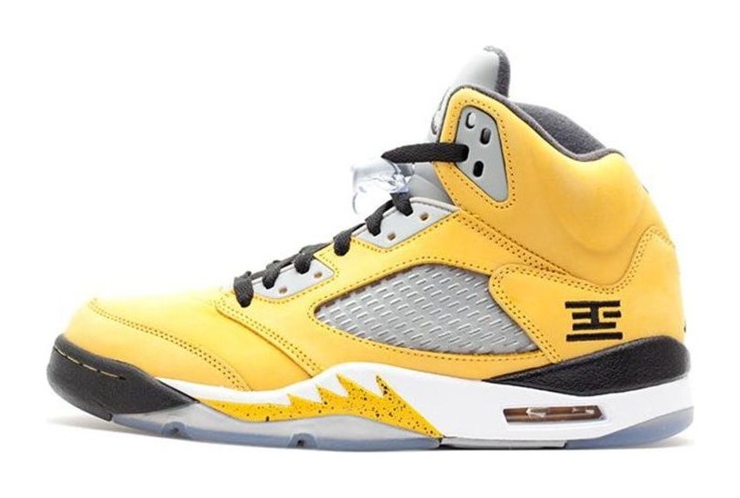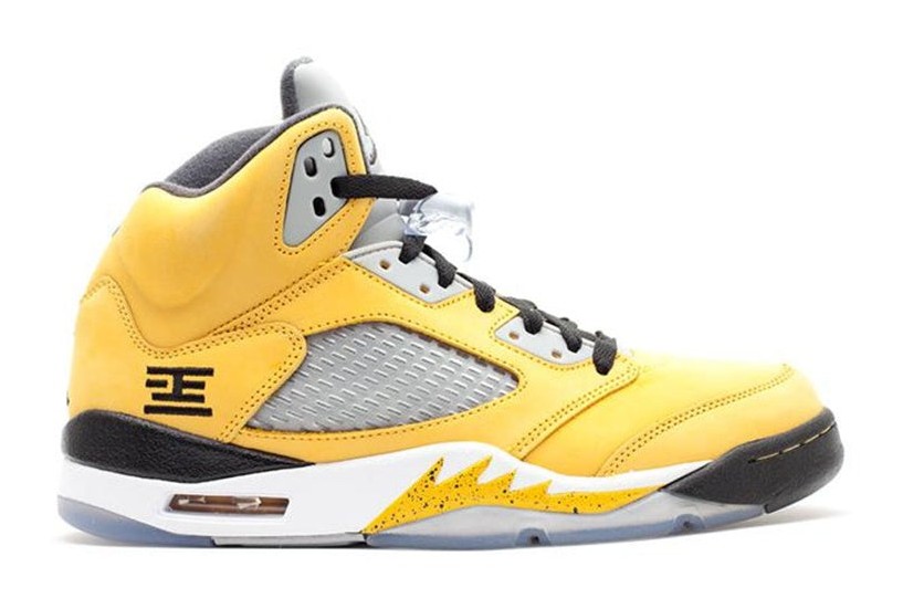 The Air Jordan 5 Retro T23 'Tokyo' was an extremely limited and highly coveted regional exclusive release to celebrate the opening of the Jordan Tokyo 23 store in Japan. The sneaker features a bright Varsity Maize (yellow) suede upper, which is contrasted with Anthracite and Wolf Grey accents on the tongue, eyelets, and side mesh panels. Black detailing is found on the laces, midsole, and the "23" branding on the heel, which is styled to look like a Japanese character. The shoe also includes a distinctive yellow and black tongue with a special "23" logo unique to this release. The color scheme is a direct nod to the colors of the Japan national basketball team.