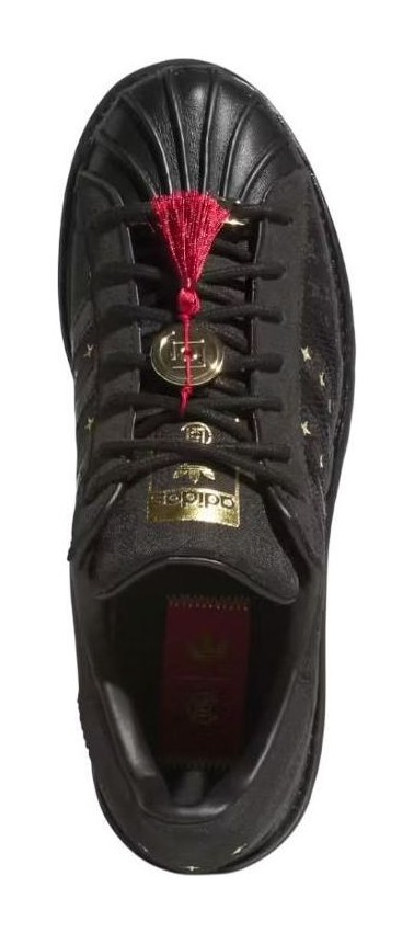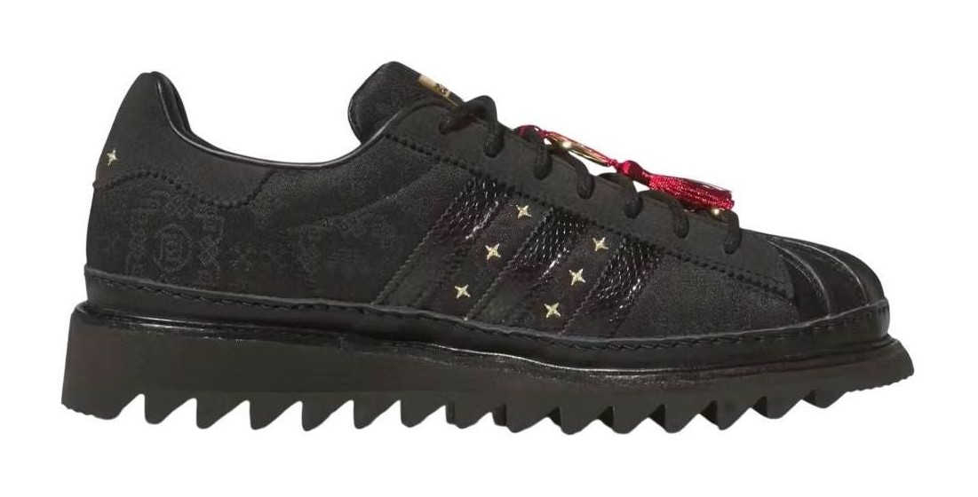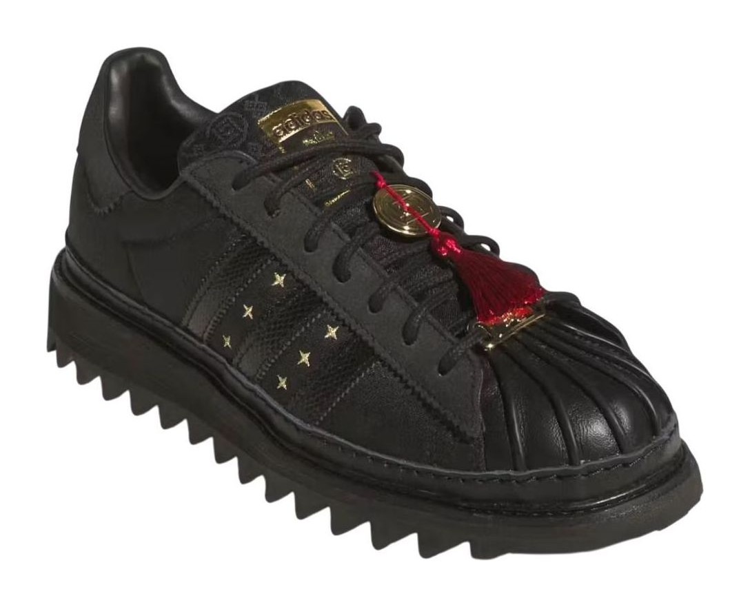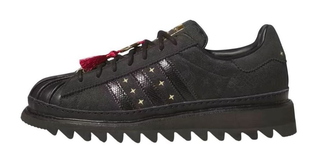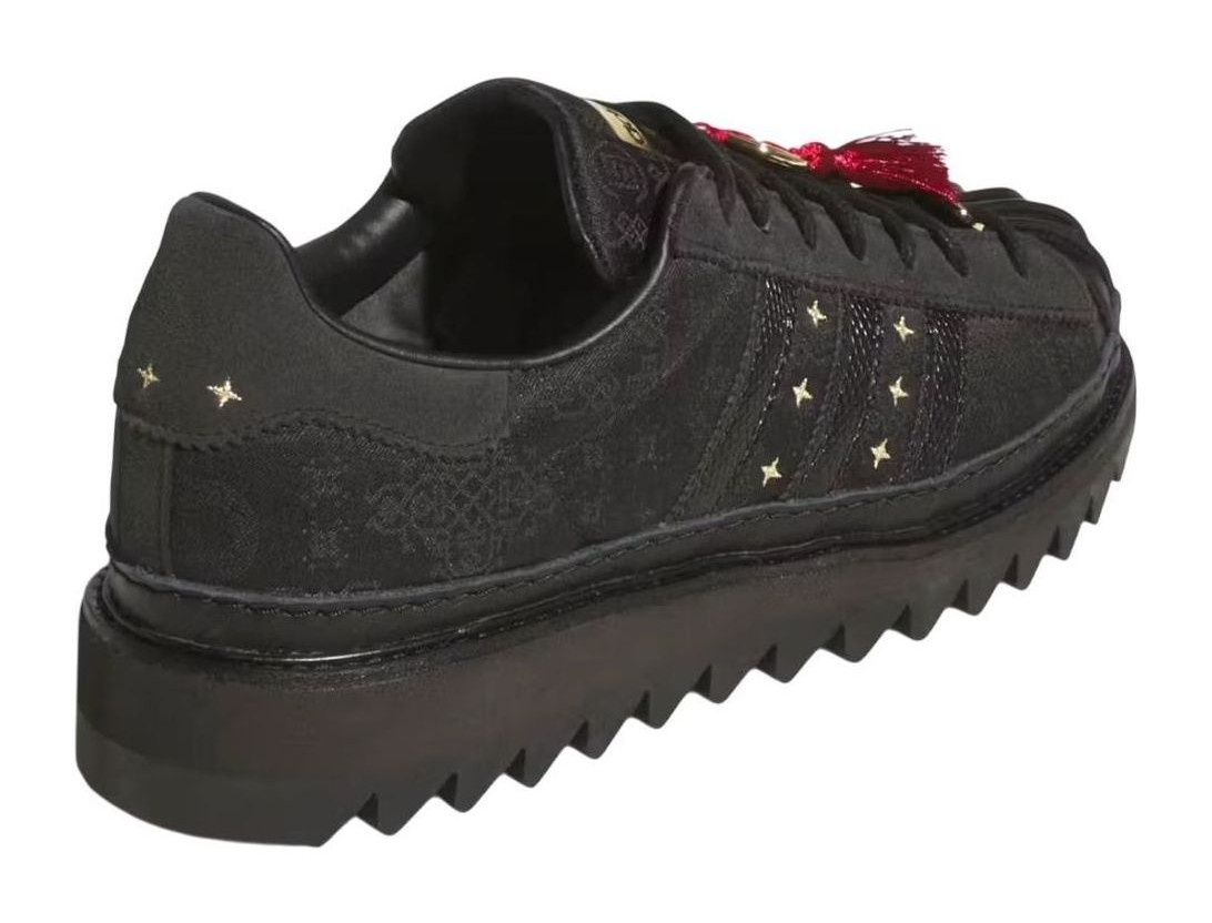 This limited-edition Superstar, a collaboration with CLOT, features a black textile upper with a subtle "Silk Royale" woven pattern. Gold embroidered stars decorate the sides, complemented by gold co-branding on the tongue and a red envelope graphic on the footbed. Snakeskin-textured 3-Stripes and a chunky ripple outsole add to the unique design.