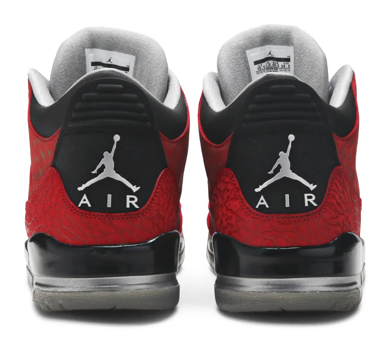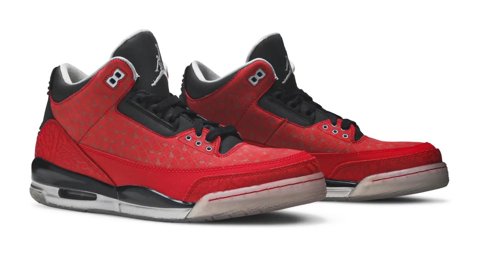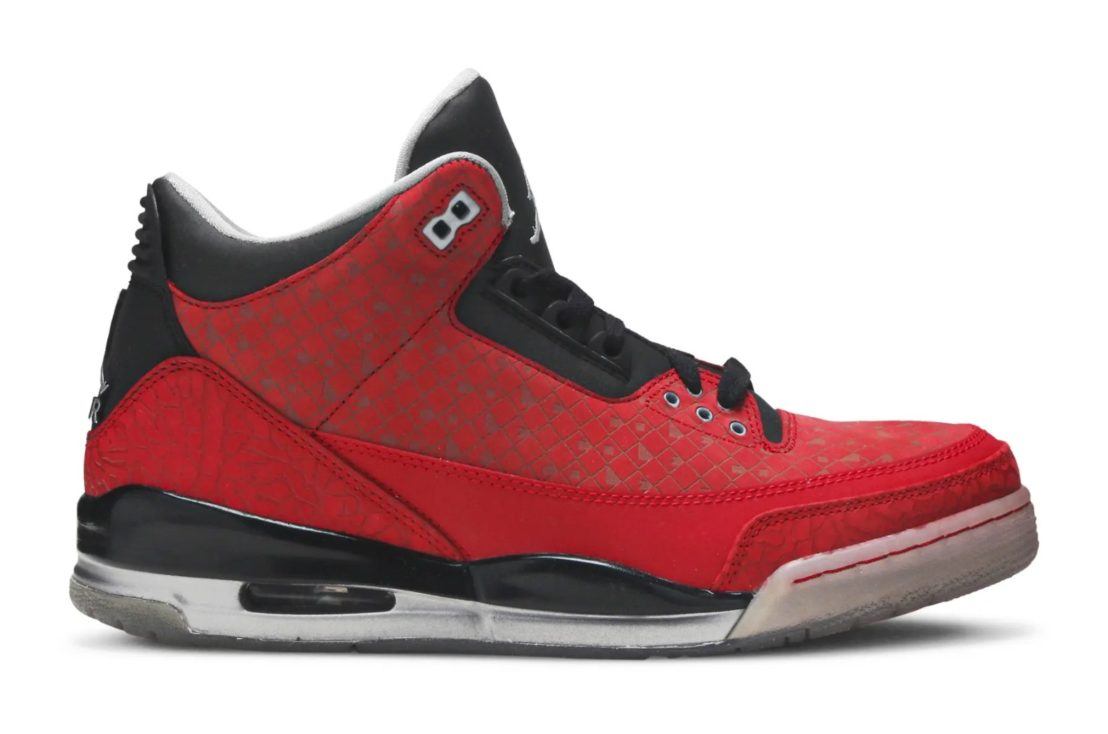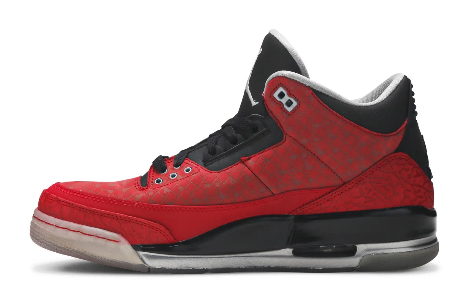 The Air Jordan 3 Retro "Doernbecher" was designed by Cole Johanson as part of the OHSU Doernbecher Freestyle program, which allows young patients to design Nike footwear. This version features a striking Varsity Red upper with a subtle, tonal diamond grid pattern embossed throughout, which actually spells out the designer's name, "Cole." Metallic Silver appears on the elephant print overlays and the Jumpman logos. The most personal details are found on the shoe's heel tabs, where Cole's two favorite foods, spaghetti and chocolate, are written. The insoles also feature the words "Strength" and "Courage," reflecting his fight against Lymphoma. The shoe was originally released in 2010 and then re-released in 2013, with the SKU 437536-600 applying to both adult-sized releases.