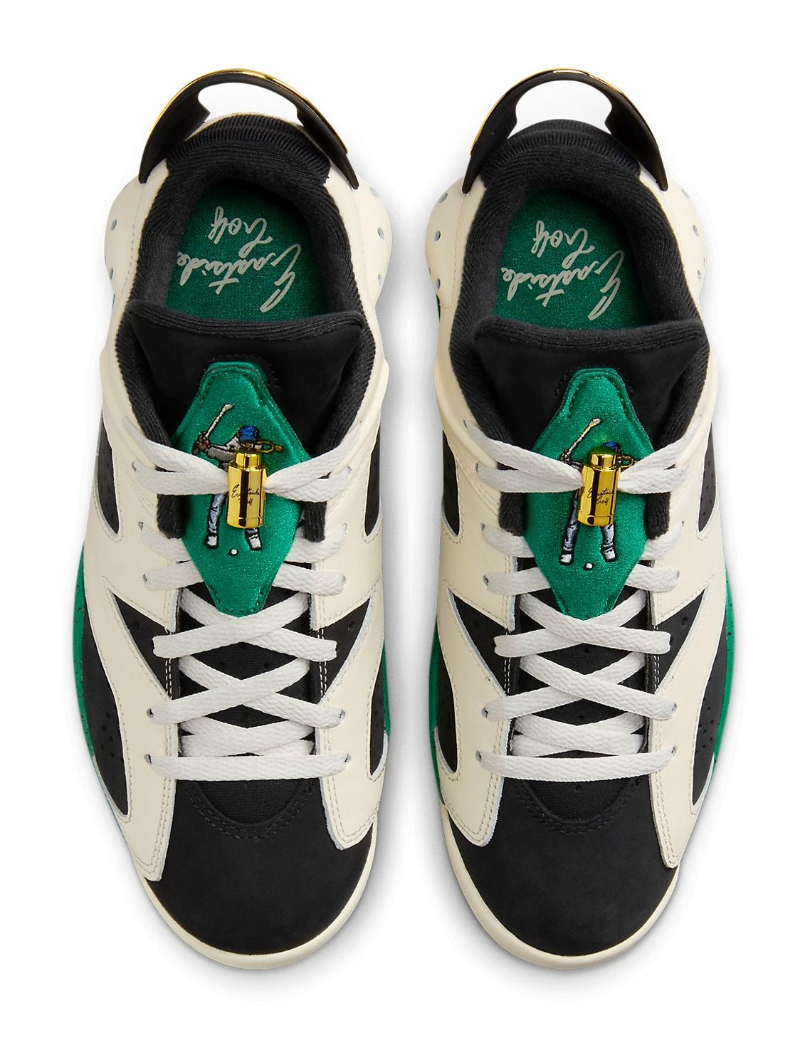 The Air Jordan 6 Retro Low Golf NRG "Eastside Golf 1961" is a golf shoe released as part of a collaboration with Eastside Golf. The sneaker features a water-resistant synthetic upper, primarily in black with contrasting off-white (or white) leather overlays. The design is a tribute to the year 1961, when the PGA Tour lifted its ban on non-white players, with the number "1961" and the word "CHANGE" visible through the translucent green-tinted outsole. A standout feature is the vibrant "Malachite" green found on the tongue overlay, midsole accents, and the custom outsole. The shoe includes a custom lace dubrae and a gold-embroidered Jumpman on the heel, which matches the metallic gold molded heel tab. The Eastside Golf brand's "Change" message and the iconic golfer logo are featured prominently on the shoe and packaging.