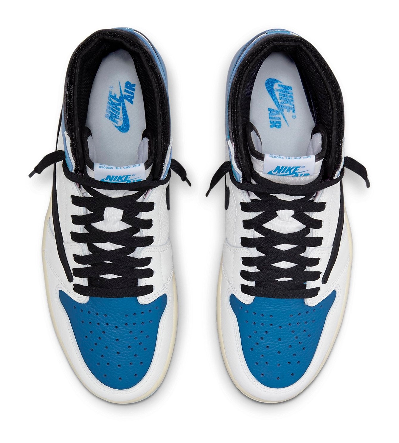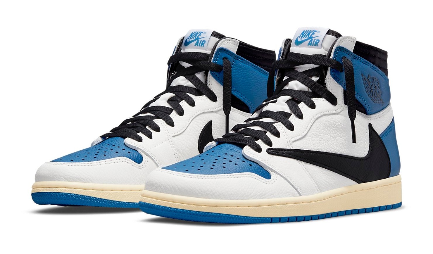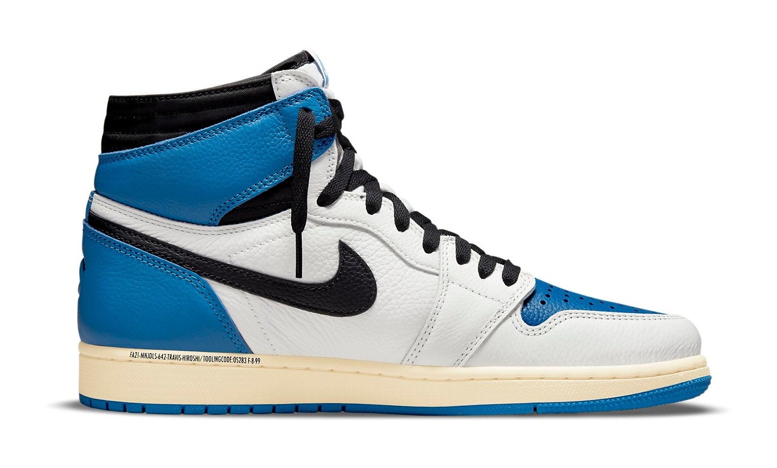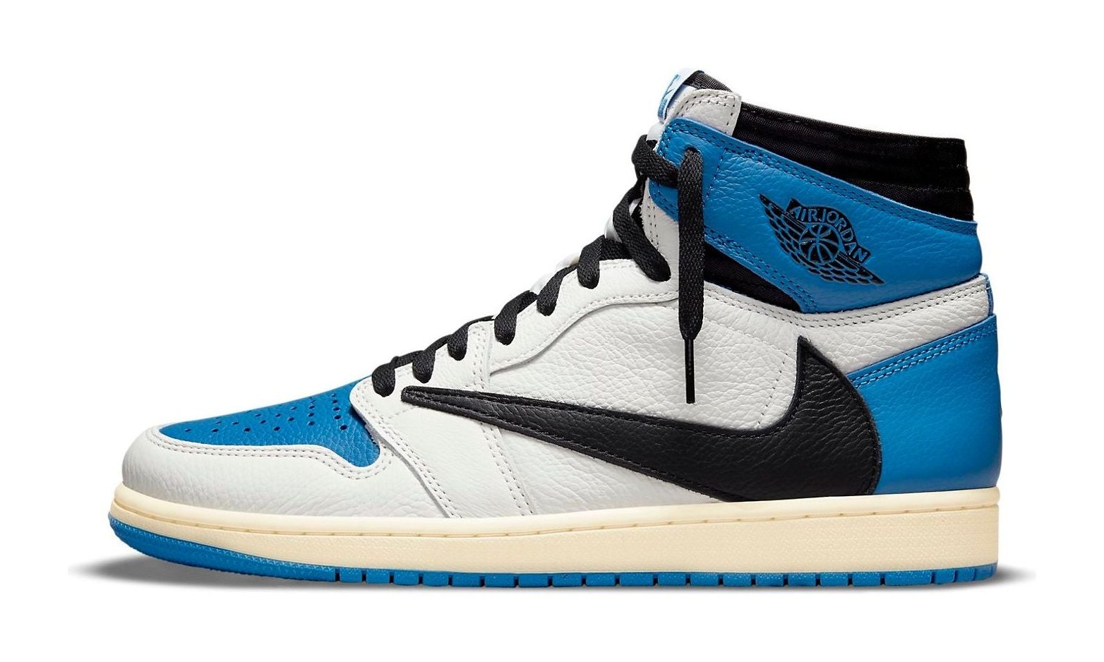 This sneaker is an unprecedented three-way collaboration between the Jordan Brand, Japanese designer Hiroshi Fujiwara's Fragment Design, and Houston rapper Travis Scott. The design blends the signature aesthetics of both collaborators onto the classic Air Jordan 1 silhouette. The color blocking combines a Sail (off-white) base with black on the forefoot overlays and Swoosh, and Military Blue on the toe box, ankle collar, and heel. It features two key Travis Scott design elements: the oversized, inverted Swoosh on the lateral side, and a hidden stash pocket in the collar. Co-branding is debossed on the heel, with Fragment's lightning bolt on one shoe and Travis Scott's Cactus Jack face logo on the other. The off-white midsole gives the shoe a vintage aesthetic.