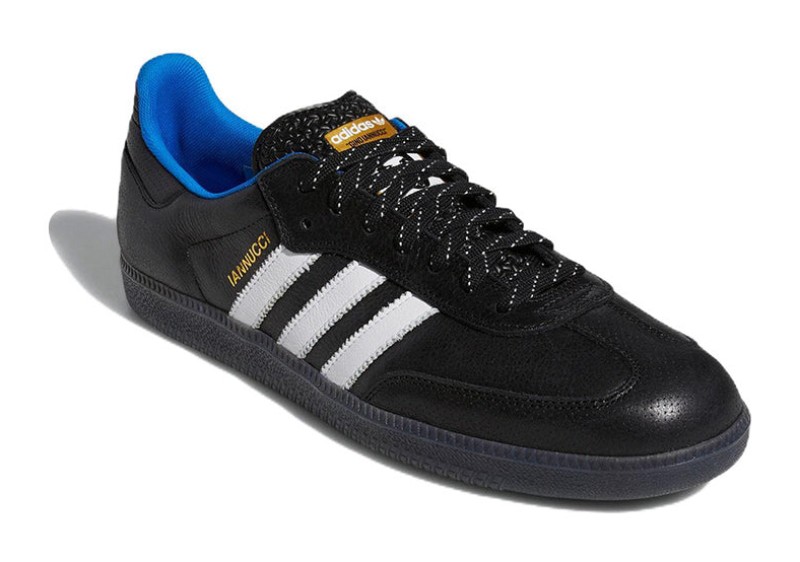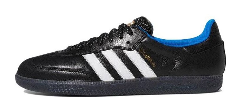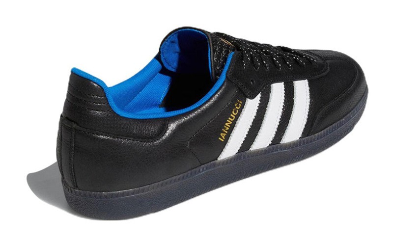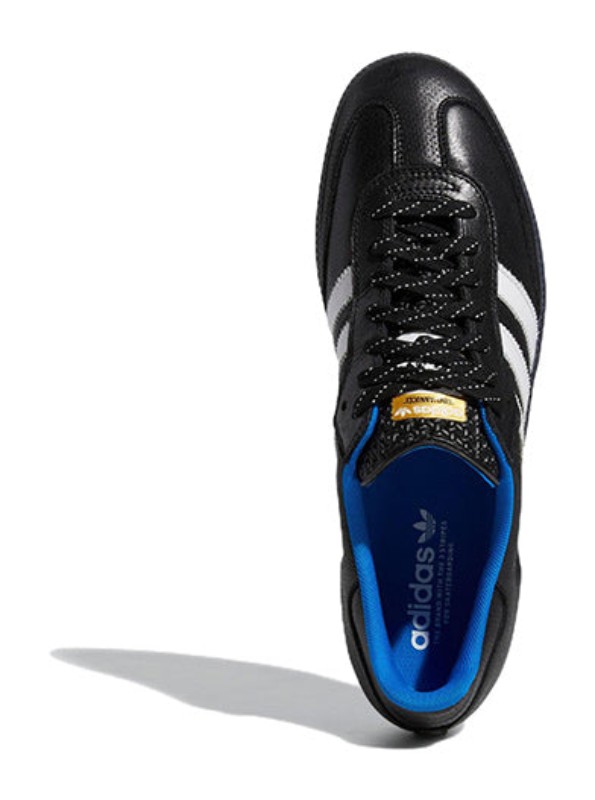 A collaborative edition of the Samba adapted for skateboarding, featuring a Core Black leather upper contrasted by Cloud White leather 3-Stripes. The design includes subtle Blue Bird (light blue) accents on the inside. The shoe utilizes a durable construction for skateboarding (ADV) and is part of the "Respect Your Roots" (RYR) series honoring skate legends.