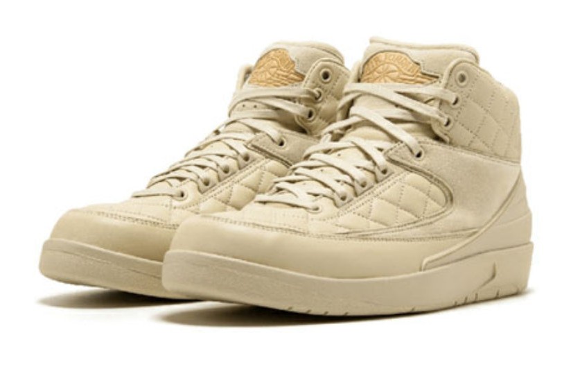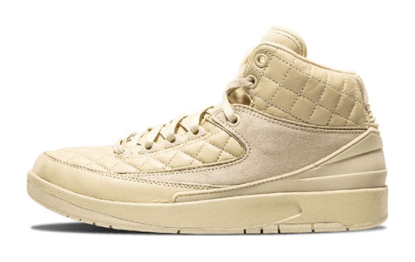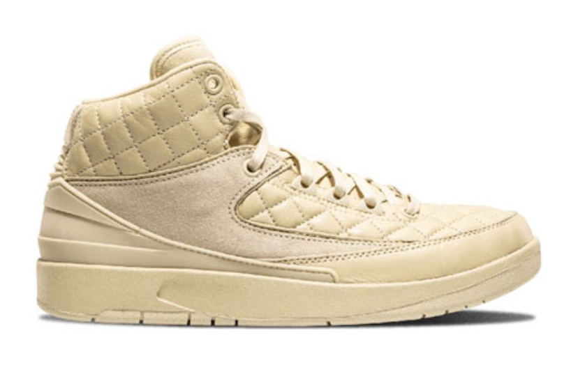 This is the Grade School (GS) version of the Just Don x Air Jordan 2 "Beach" colorway. It mirrors the luxurious aesthetic of the men's shoe, featuring a monochromatic pale tan/cream "Beach" color across its premium quilted leather and suede upper. Metallic Gold accents on the lace tips and branding, along with a hit of University Red on the interior branding, elevate the look. The shoe was released in special packaging, including a collaborative dust bag.