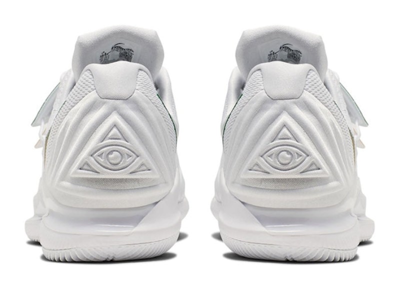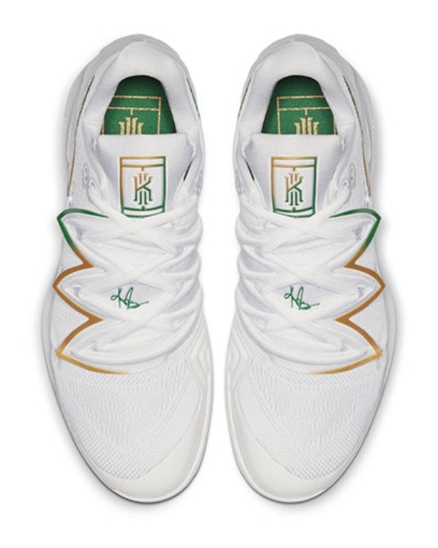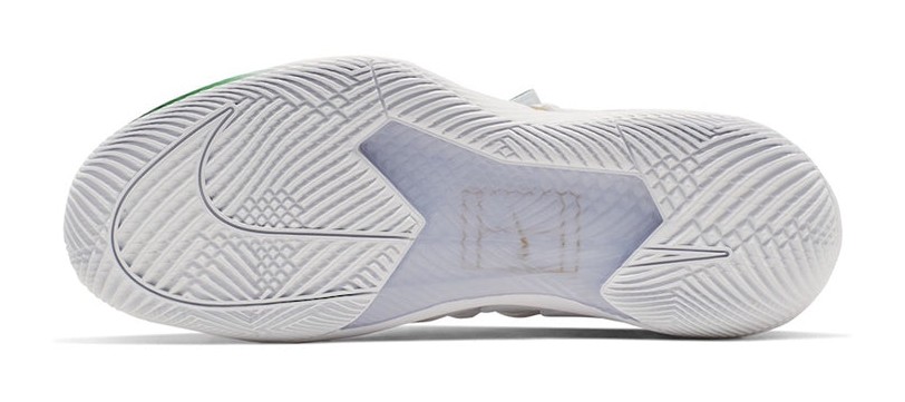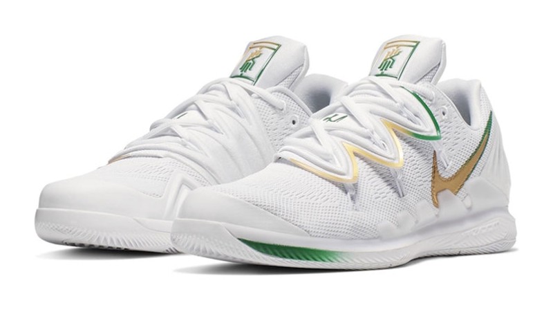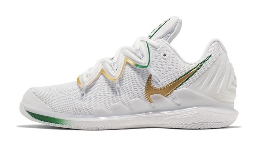 This special collaboration brings together elements of Kyrie Irving's basketball shoe with the performance of the Air Zoom Vapor tennis shoe. This version, released for Wimbledon, features a clean white base with a Venus flytrap-inspired overlay for a locked-down fit. Clover green and metallic gold accents appear on the reversed Swooshes and other details. The design reflects the grass-court theme with a court logo visible through the translucent outsole.