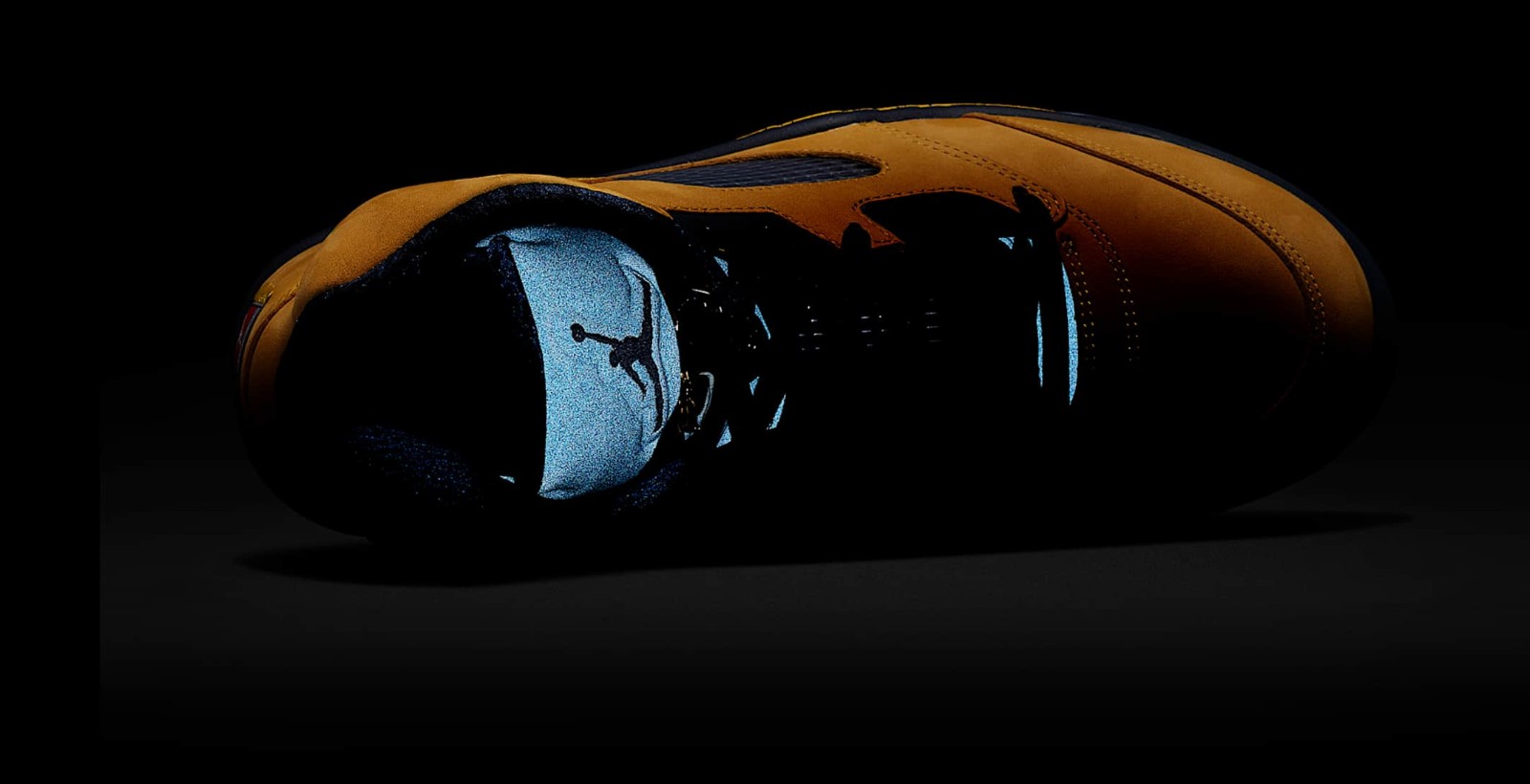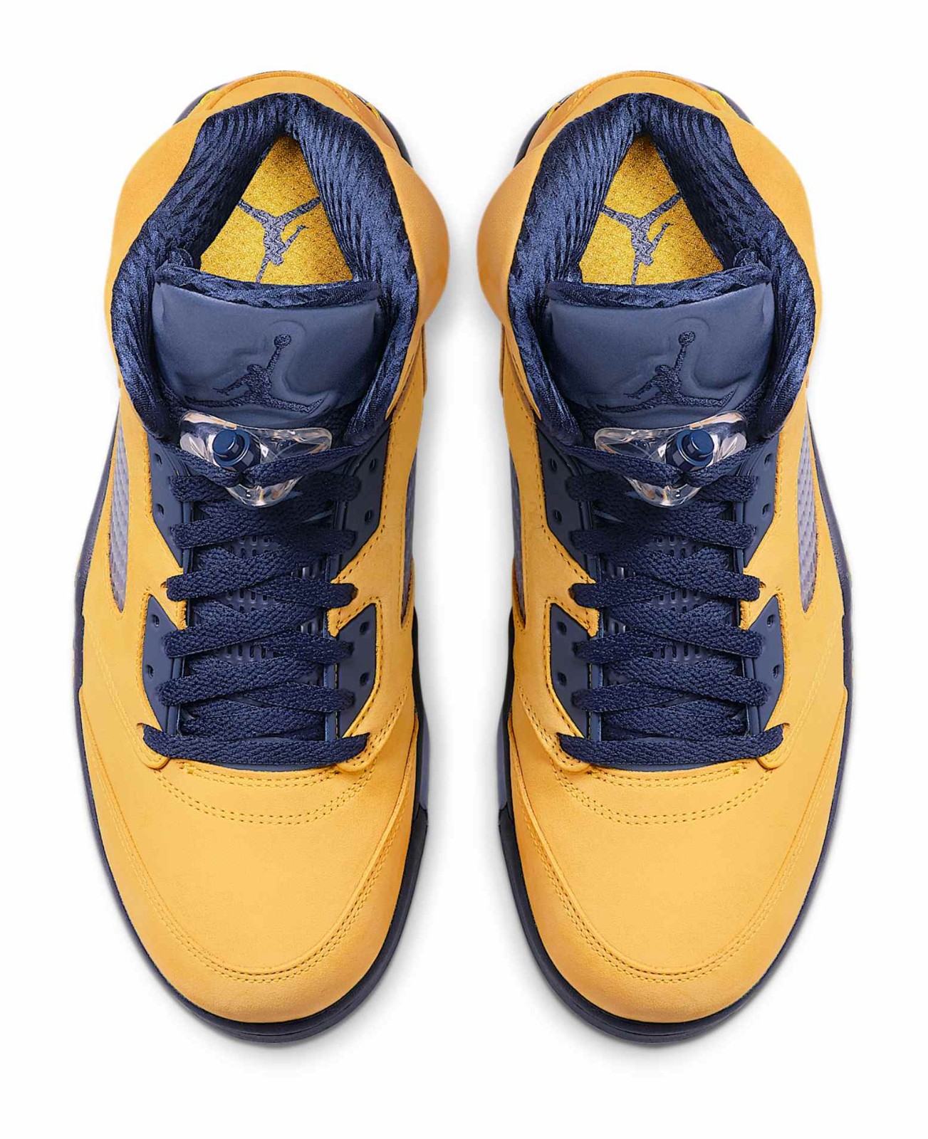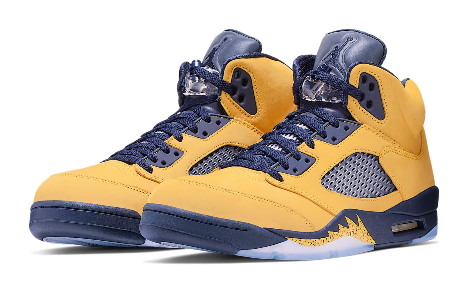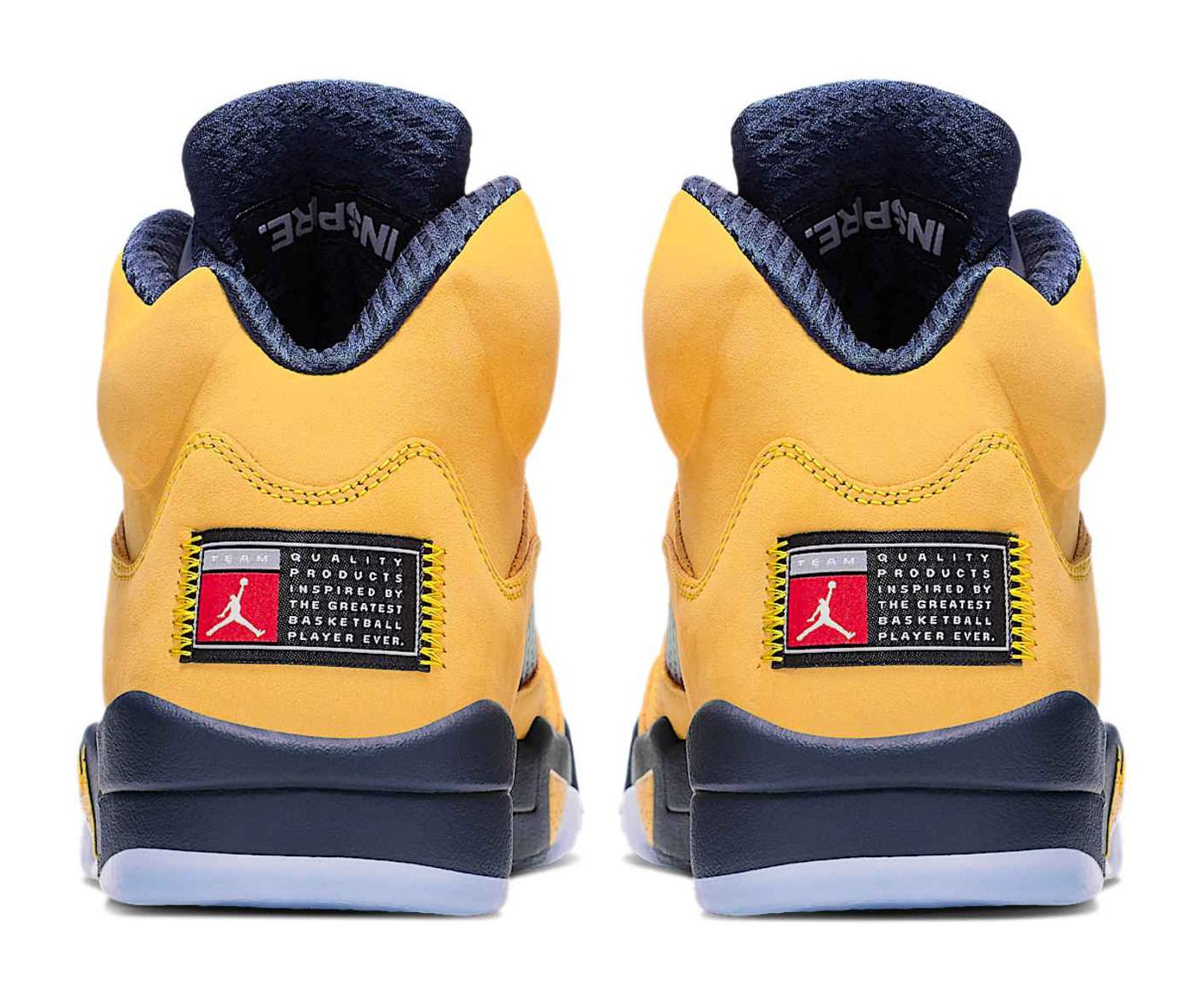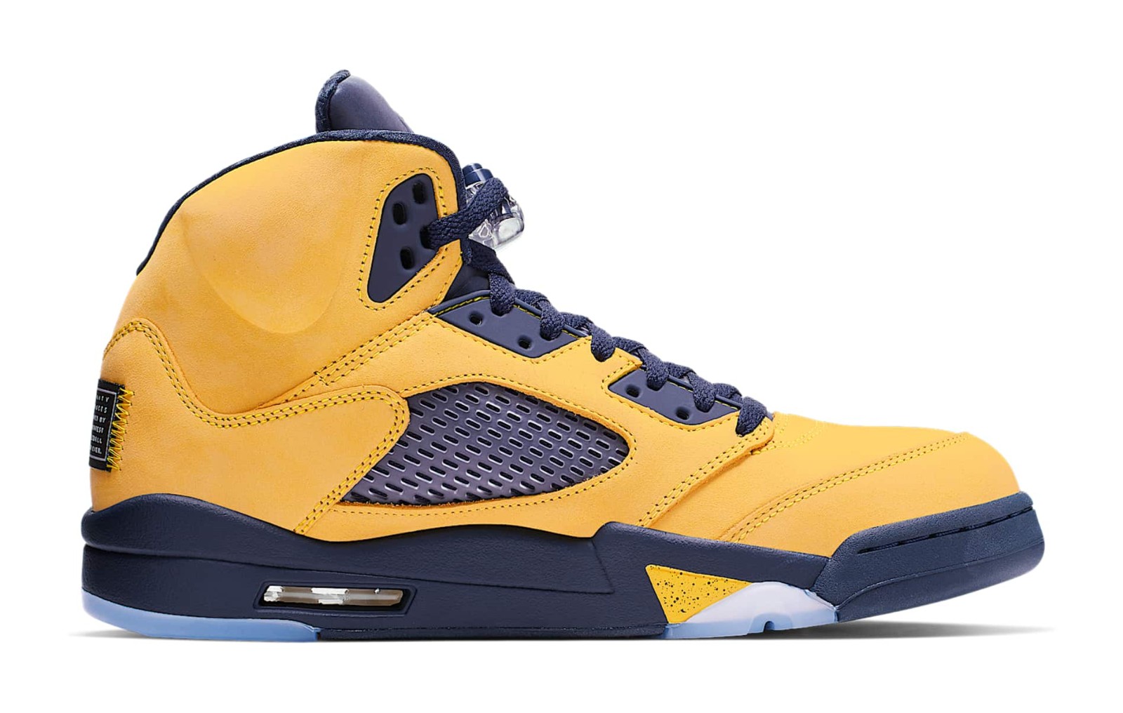 The Air Jordan 5 Retro SP 'Michigan' pays tribute to the University of Michigan Wolverines, one of the schools sponsored by Jordan Brand. The shoe features an upper constructed entirely of bright Amarillo (yellow) nubuck, which is reminiscent of the 'Lightning' Air Jordan 4. College Navy accents are used on the midsole, tongue lining, and laces, completing the Michigan Wolverines team colors. Unique features include a tag stitched onto the heel in place of the usual Jumpman logo that reads "Team Jordan," a reflective tongue, and the word "Inspire" printed on the inner side of the tongue. The midsole features the signature shark-tooth detailing with a yellow speckled pattern.