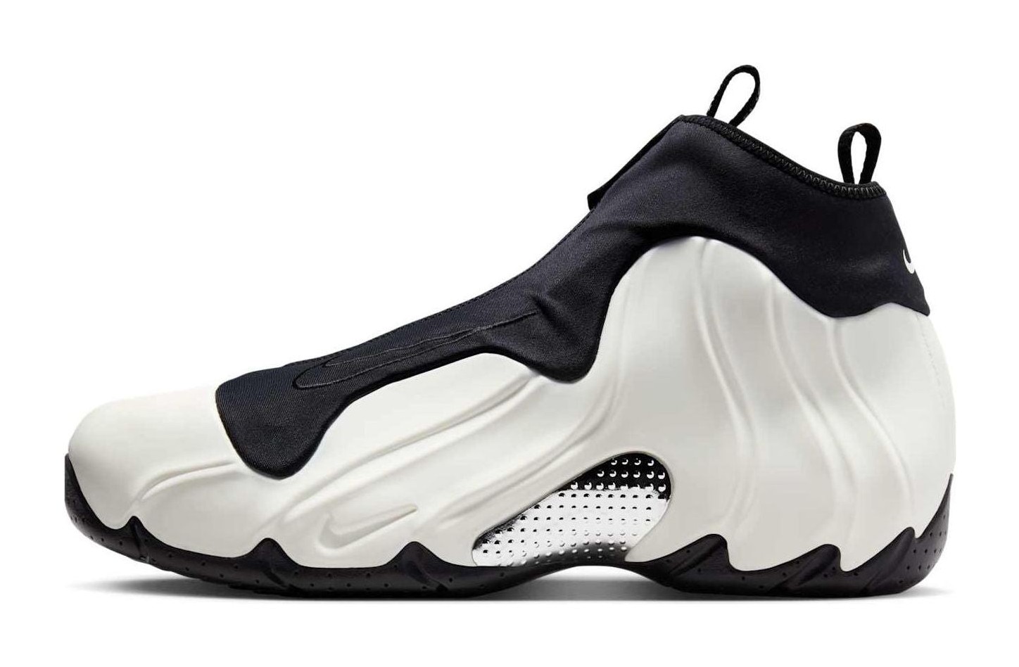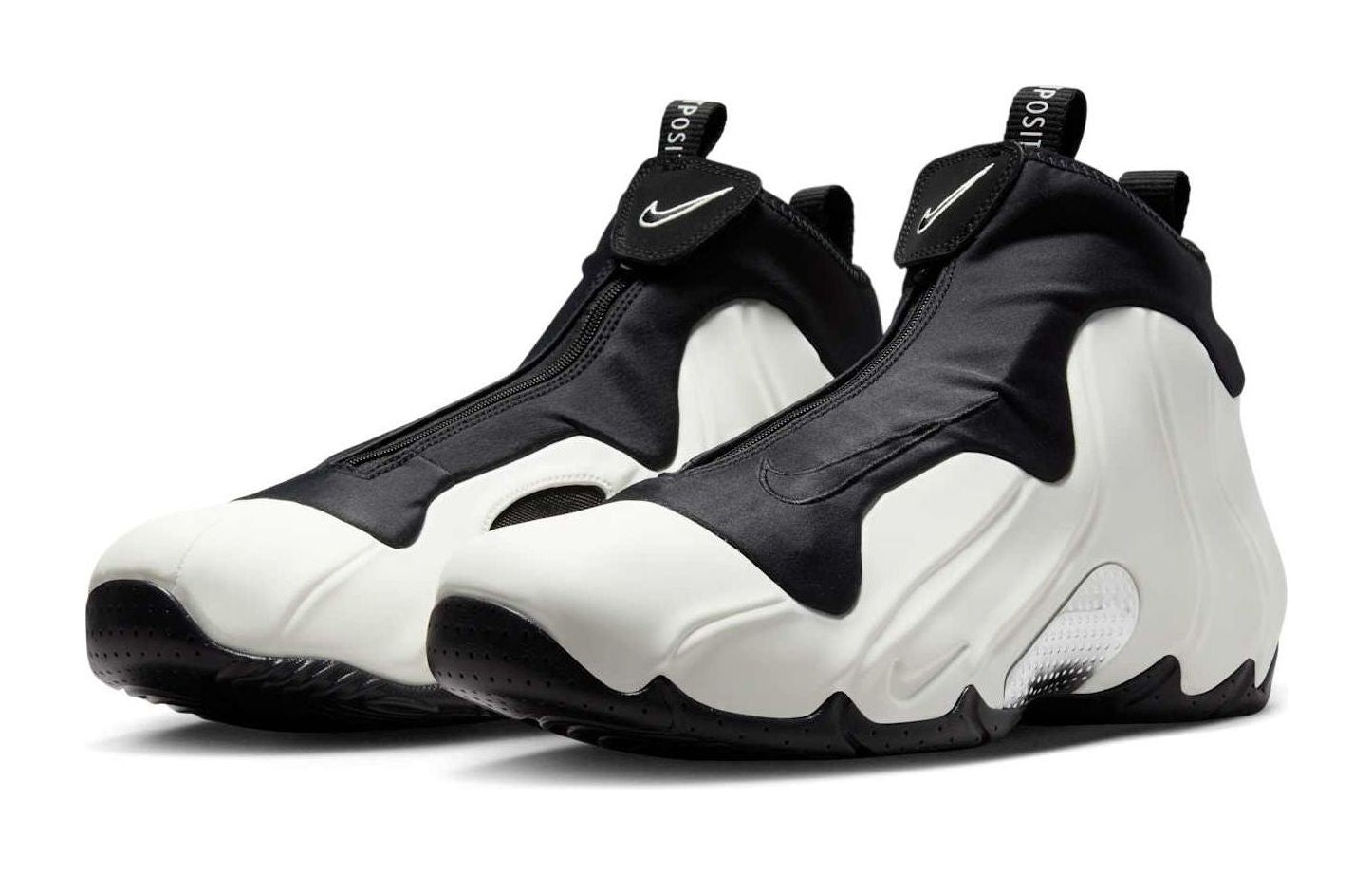 This retro of the classic Flightposite features the iconic liquid-like, molded upper in a smooth "Sail" (off-white) color. It is contrasted with black on the sole, inner sleeve, and zip-up shroud. The design also includes Metallic Silver accents on the lateral midfoot panel. The shoe features a stretchy inner sleeve, a zip-up shroud, and a Foamposite upper for a futuristic aesthetic. It incorporates Zoom Air cushioning for responsive comfort.