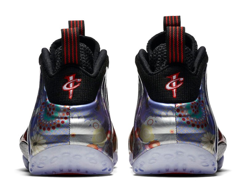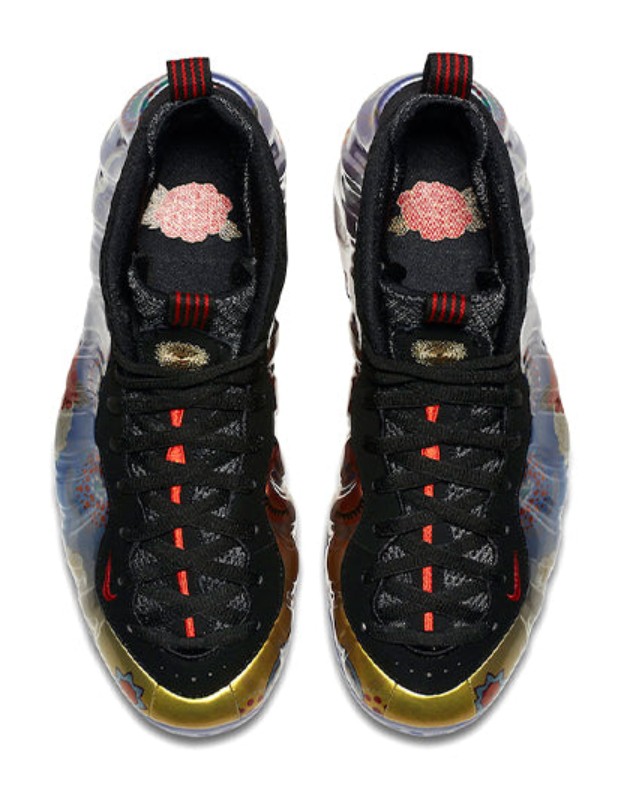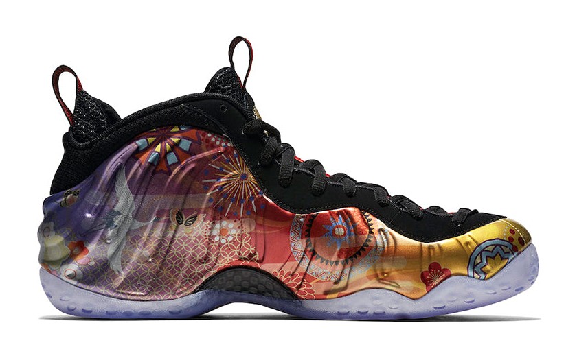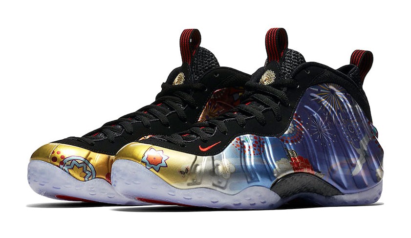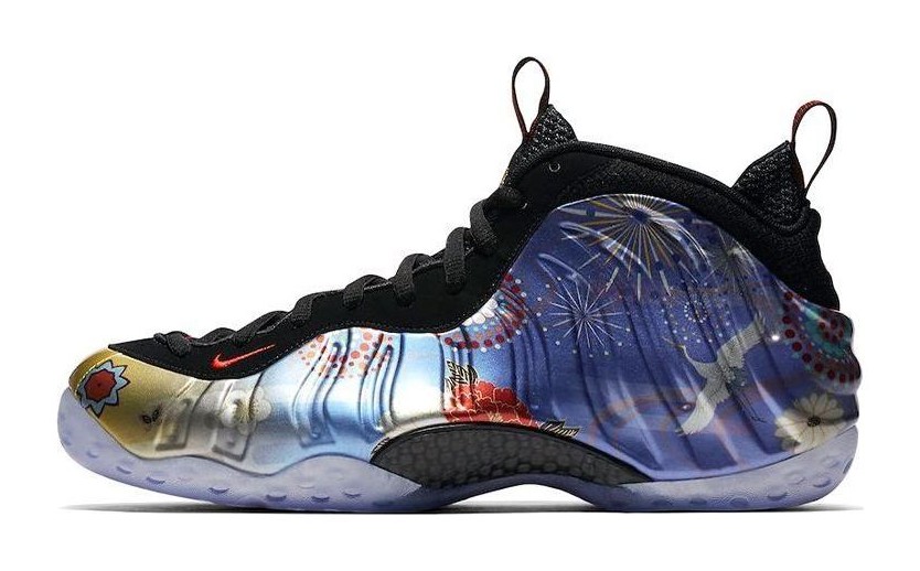 This sneaker features the iconic molded Foamposite shell upper adorned with a vibrant, all-over graphic print of fireworks and floral patterns, inspired by the 2018 Lunar New Year celebrations. The graphic sits on a black Foamposite base, contrasted by black leather eyelets, a black inner bootie, and an icy translucent outsole. Red accents are used for the small Swoosh on the forefoot and branding elements. It includes a black carbon fiber plate in the midfoot for stability.