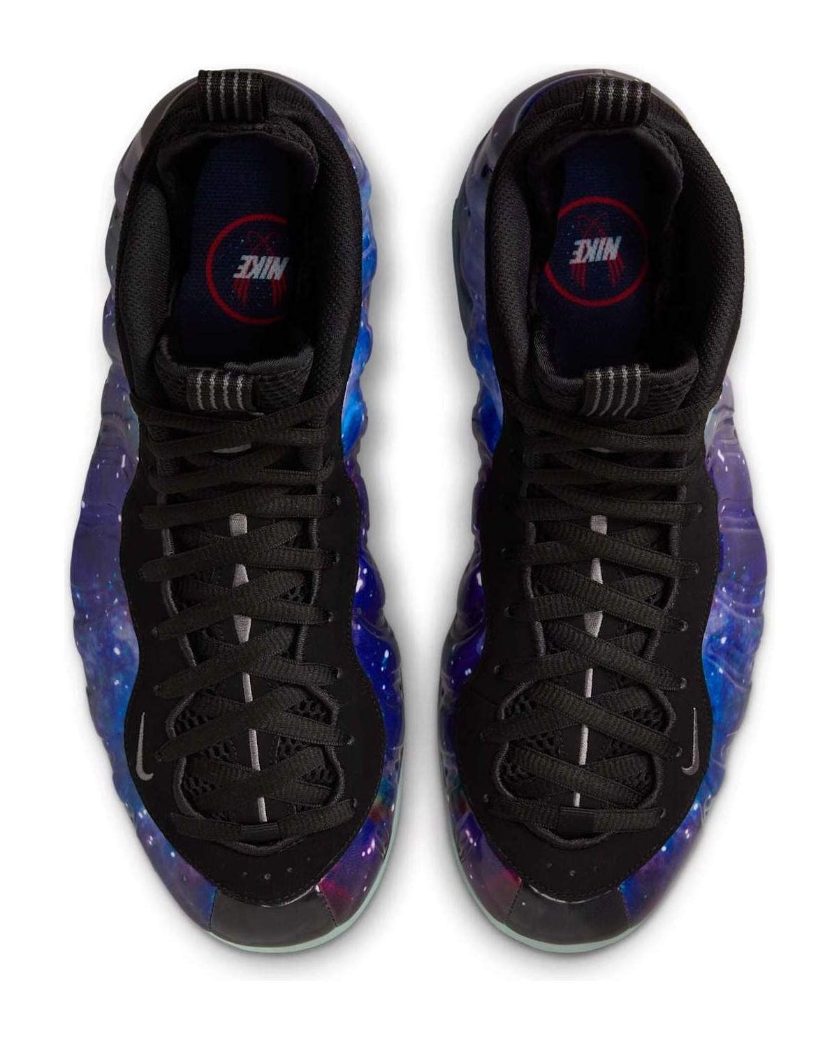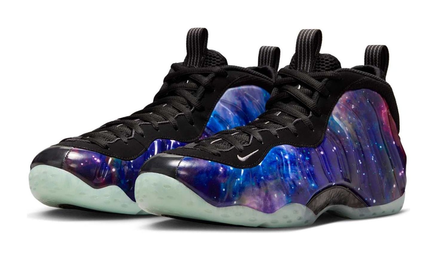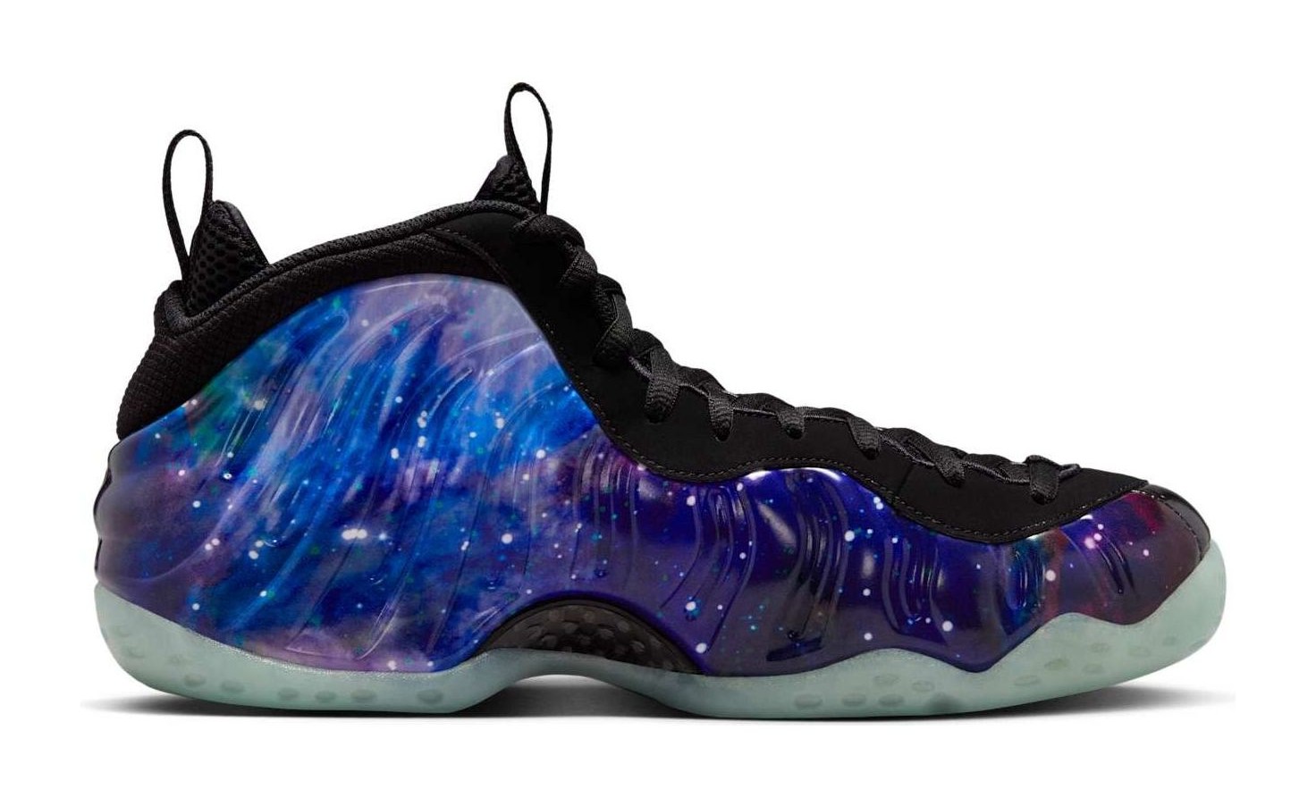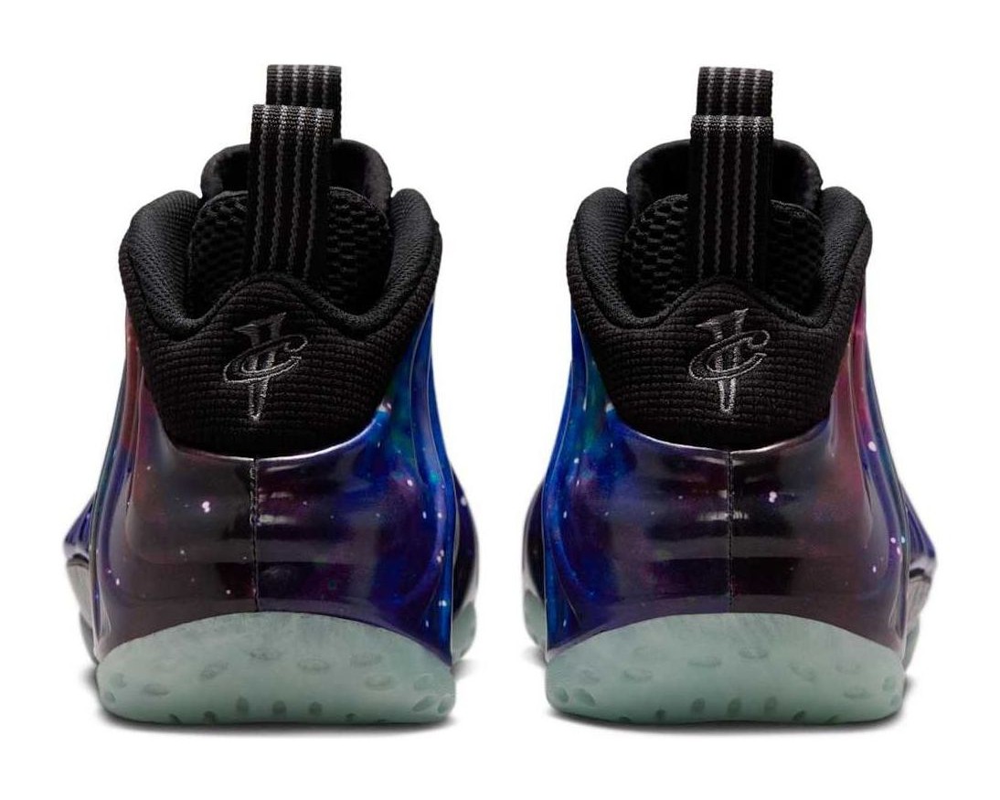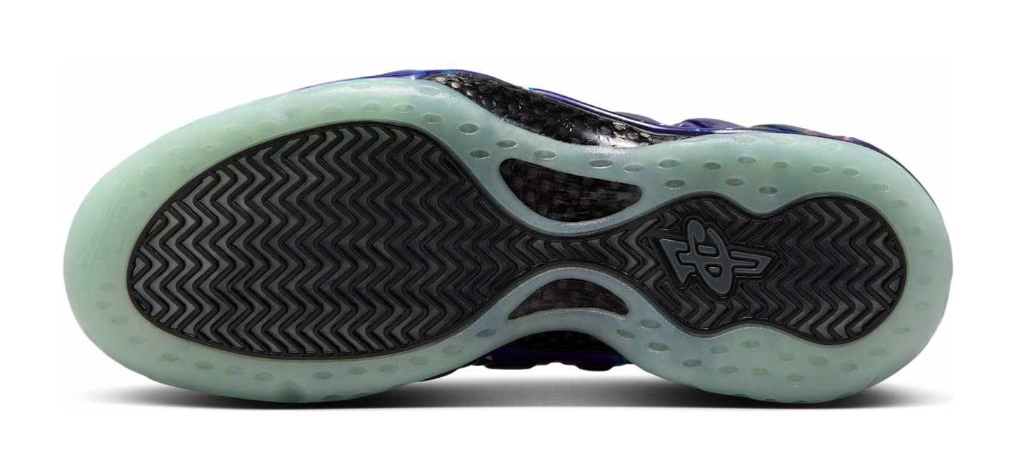 This sneaker is an iconic retro of the legendary 2012 release, featuring a molded Foamposite shell upper with a vibrant, all-over nebula-inspired graphic showcasing swirling patterns of deep blue and violet hues, giving it an out-of-this-world aesthetic. The cosmic upper is contrasted with black nubuck detailing on the collar and eyestay. A key feature is the translucent rubber outsole that glows in the dark. The design is completed with the classic Penny Hardaway "1 Cent" logos on the heel and tongue, and a special "Remove Before Flight" hangtag is included, referencing the shoe's space exploration motif.