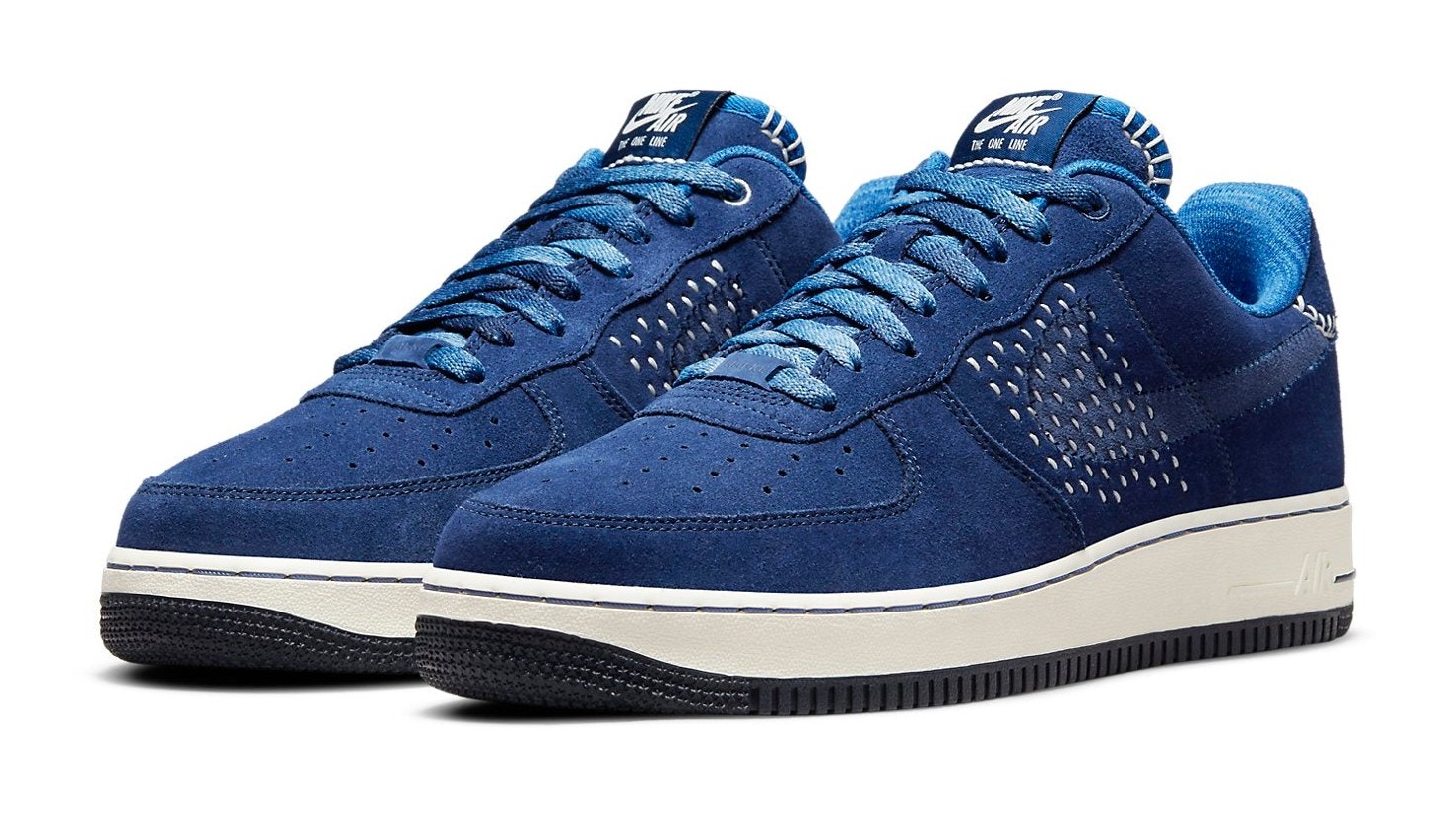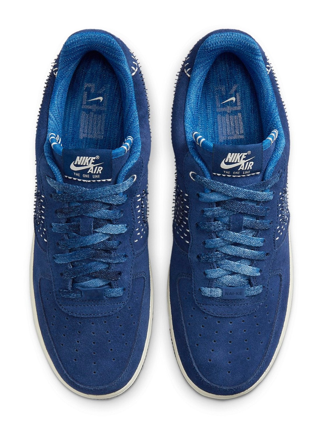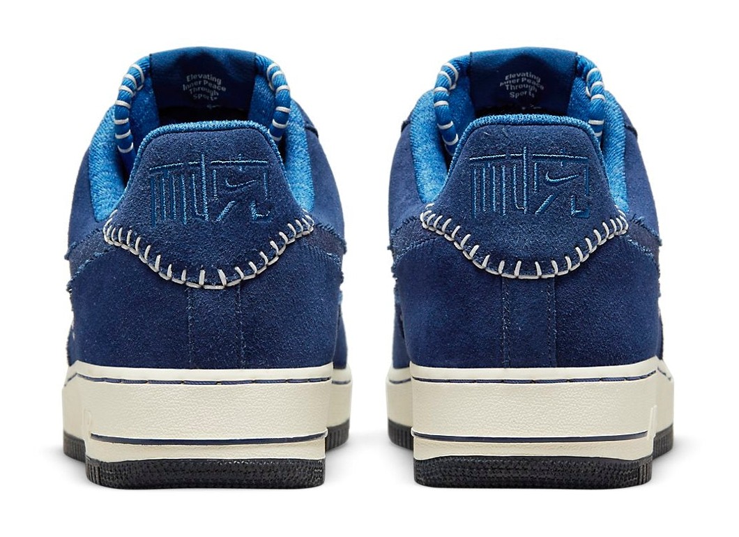 This Air Force 1 is an Asia-exclusive release that pays homage to Nike's "The One Line" collection, which celebrates Nike's early history of production in China. The shoe features a rich, blue suede upper accented with white stitching in the style of the traditional Japanese embroidery technique, Sashiko. The stitching creates a unique "One Stripe" look on the mid-panels in place of the usual Swoosh. The heel panel features embossed Chinese characters, and the lace dubraes are marked with "NAI-KE," which is the phonetic spelling of "Nike" in Chinese. The inner tongue also includes the text "Elevating Inner Peace Through Sports."