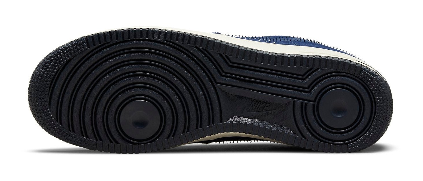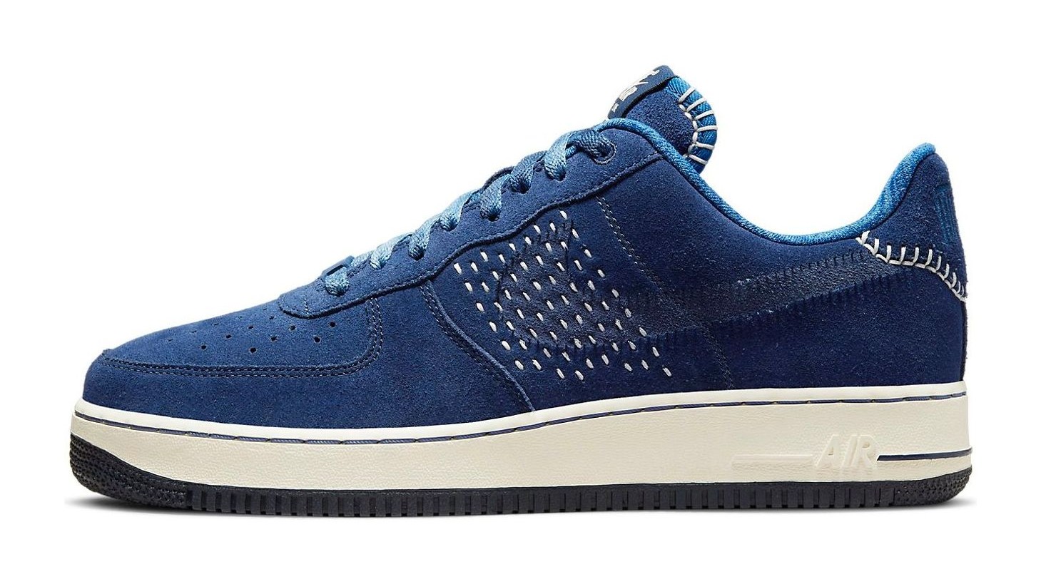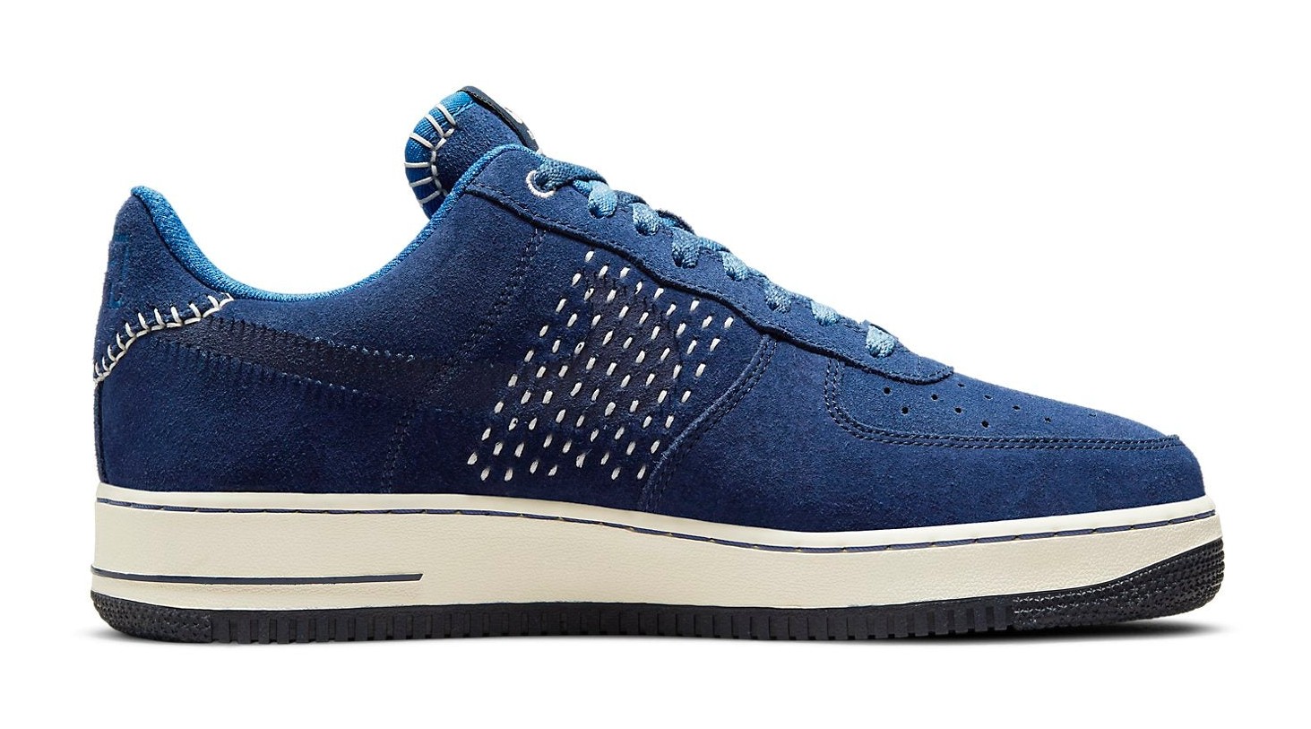 This Air Force 1 is an Asia-exclusive release that pays homage to Nike's "The One Line" collection, which celebrates Nike's early history of production in China. The shoe features a rich, blue suede upper accented with white stitching in the style of the traditional Japanese embroidery technique, Sashiko. The stitching creates a unique "One Stripe" look on the mid-panels in place of the usual Swoosh. The heel panel features embossed Chinese characters, and the lace dubraes are marked with "NAI-KE," which is the phonetic spelling of "Nike" in Chinese. The inner tongue also includes the text "Elevating Inner Peace Through Sports."