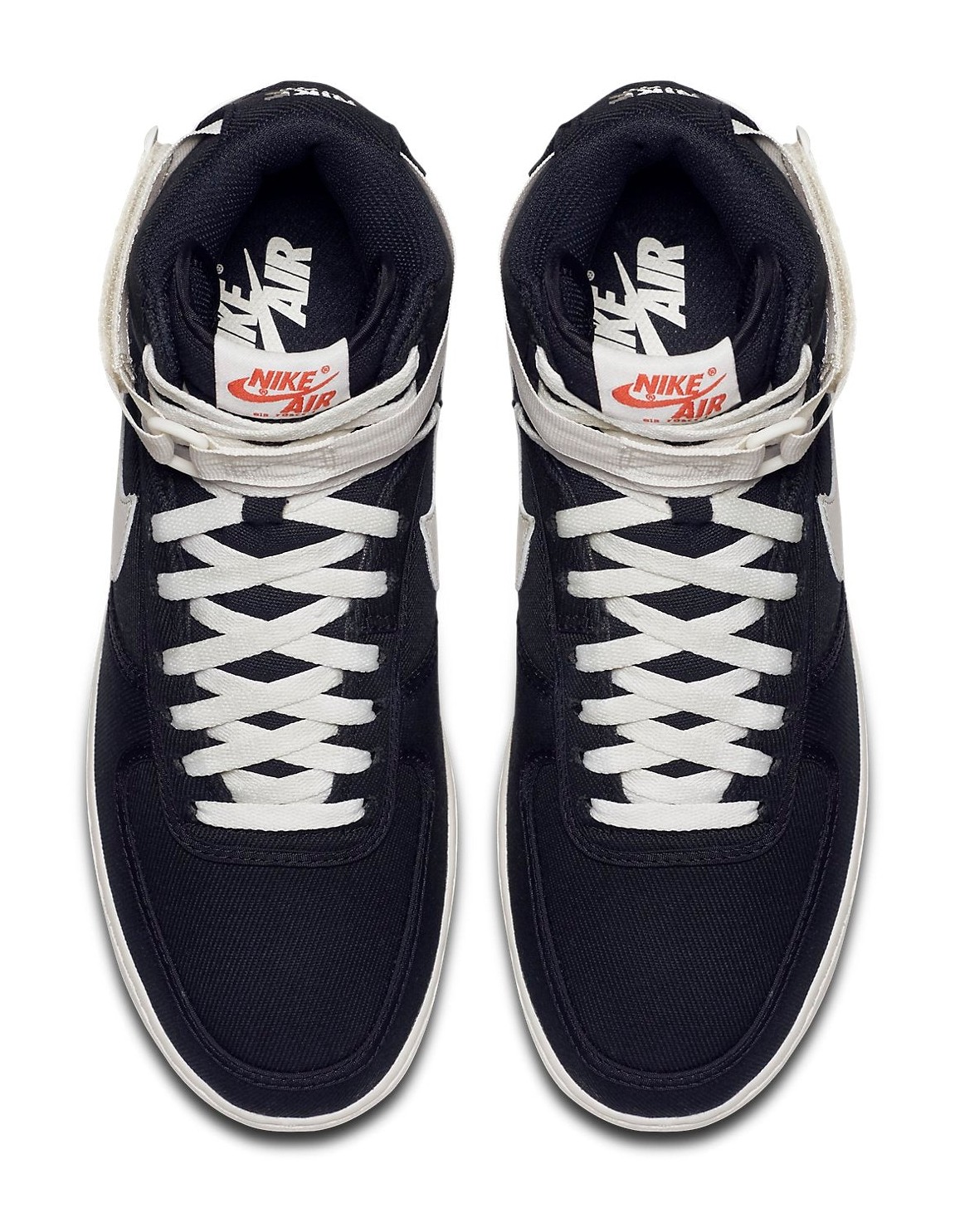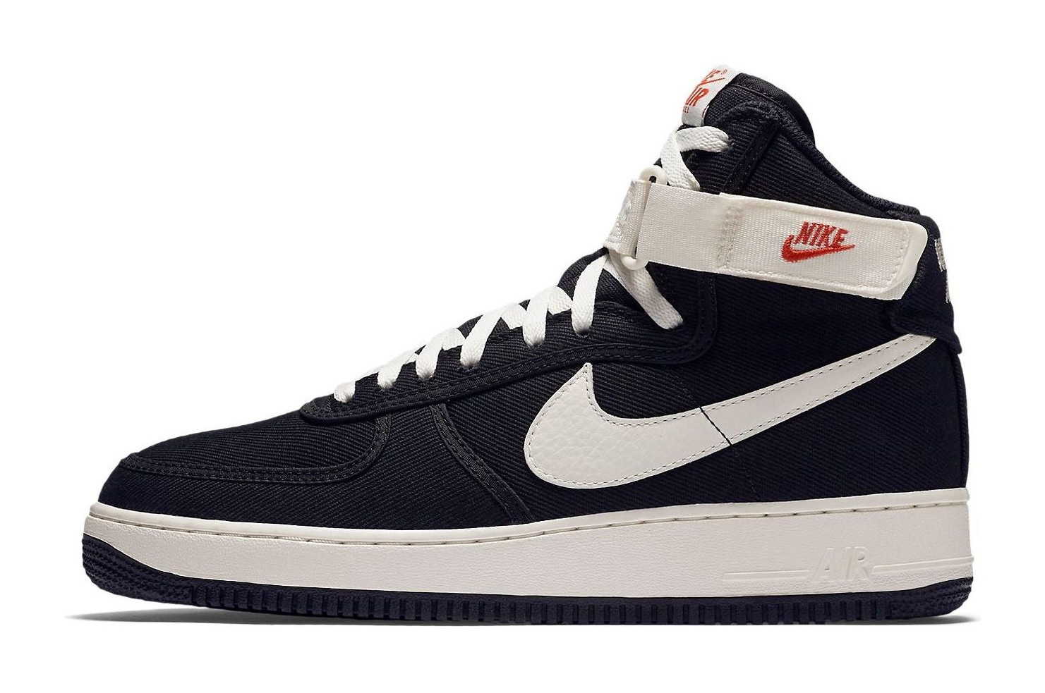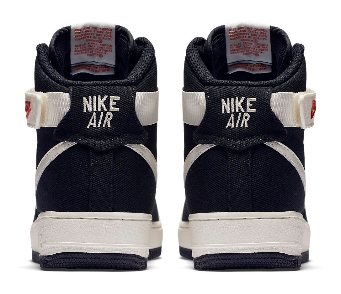 A retro rendition of the classic high-top model, this Air Force 1 replaces the traditional leather upper with a durable black canvas material. The all-black base provides a sleek, monochromatic look, which is sharply contrasted by the 'Sail' (off-white/cream) color used on the midsole and the original-style nylon ankle strap. The design stays true to the OG aesthetic, offering a lightweight and classic silhouette for casual wear.