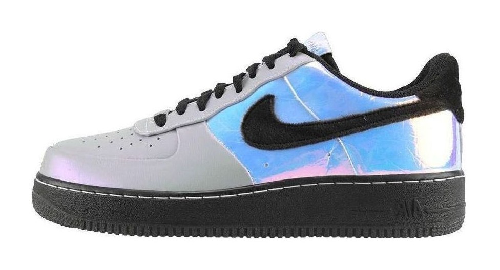 A special edition of the Air Force 1 Low, this "Comfort Premium" model features an iridescent silver-based leather toe box and eyestay, with a striking, color-shifting holographic material used on the side panels that wraps around the heel. The black velour used on the Swoosh, along with the black midsole, inner-lining, and heel-tab, provides a sharp contrast to the bright, light-reflective upper.