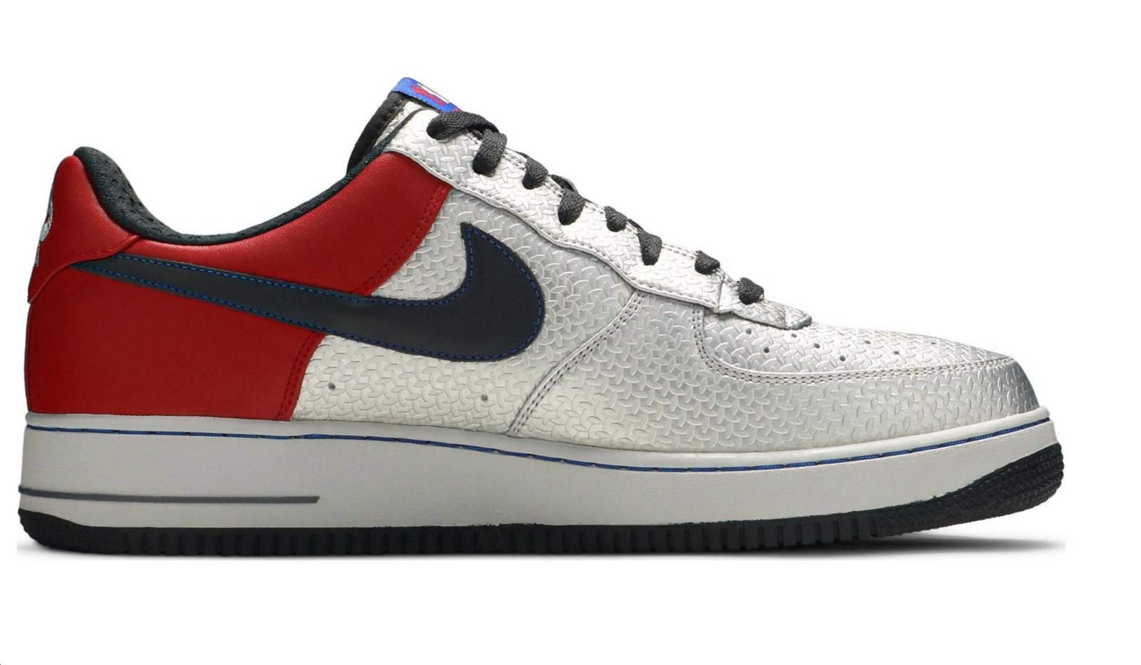 This sneaker, part of the "Original Six" pack, honors Bobby Jones, one of the original basketball players to wear the Air Force 1. It features a metallic silver leather upper with a distinctive diamond plate pattern on the forefoot.