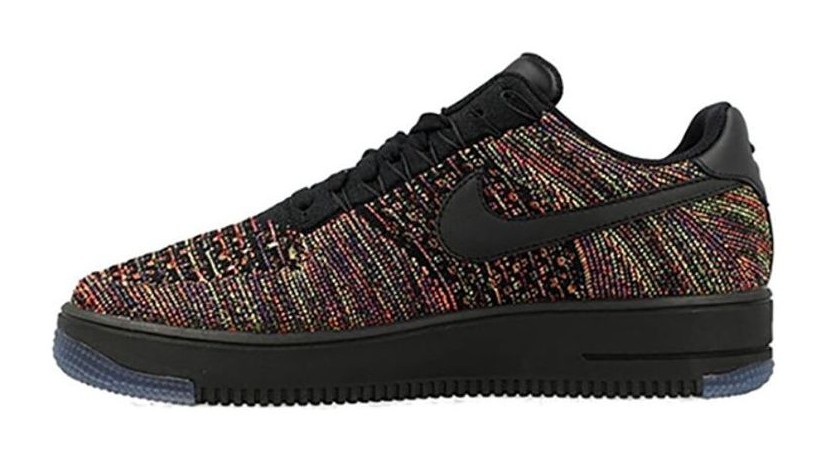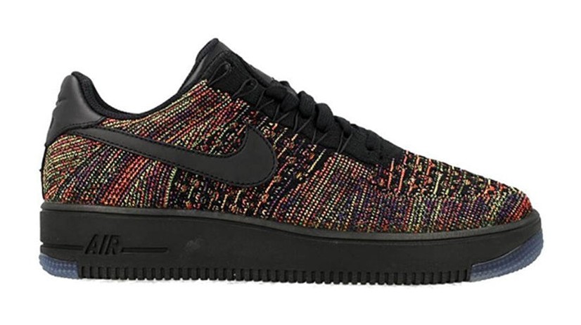 This model is one of the original releases of the ultra-lightweight Flyknit Air Force 1 Low, engineered to be 50% lighter than the original. The upper features a Black-based Flyknit weave interspersed with brightly colored fibers (Multi-Color/Bright Crimson/Court Purple) for a vibrant, patterned look. All other elements, including the leather Swoosh, laces, and the cored-out Ultra sole unit, are finished in solid Black for contrast.