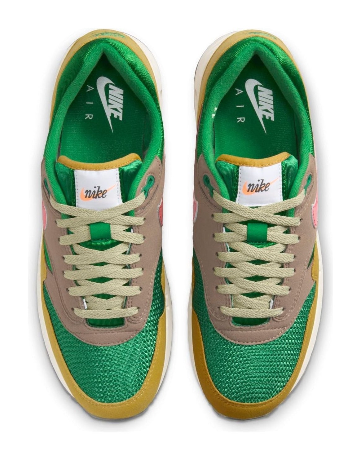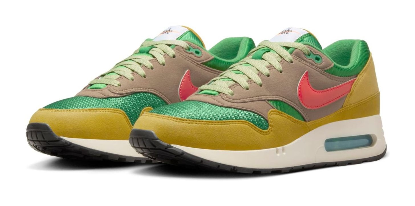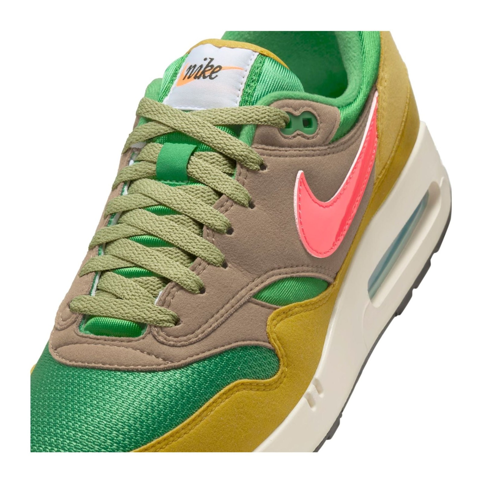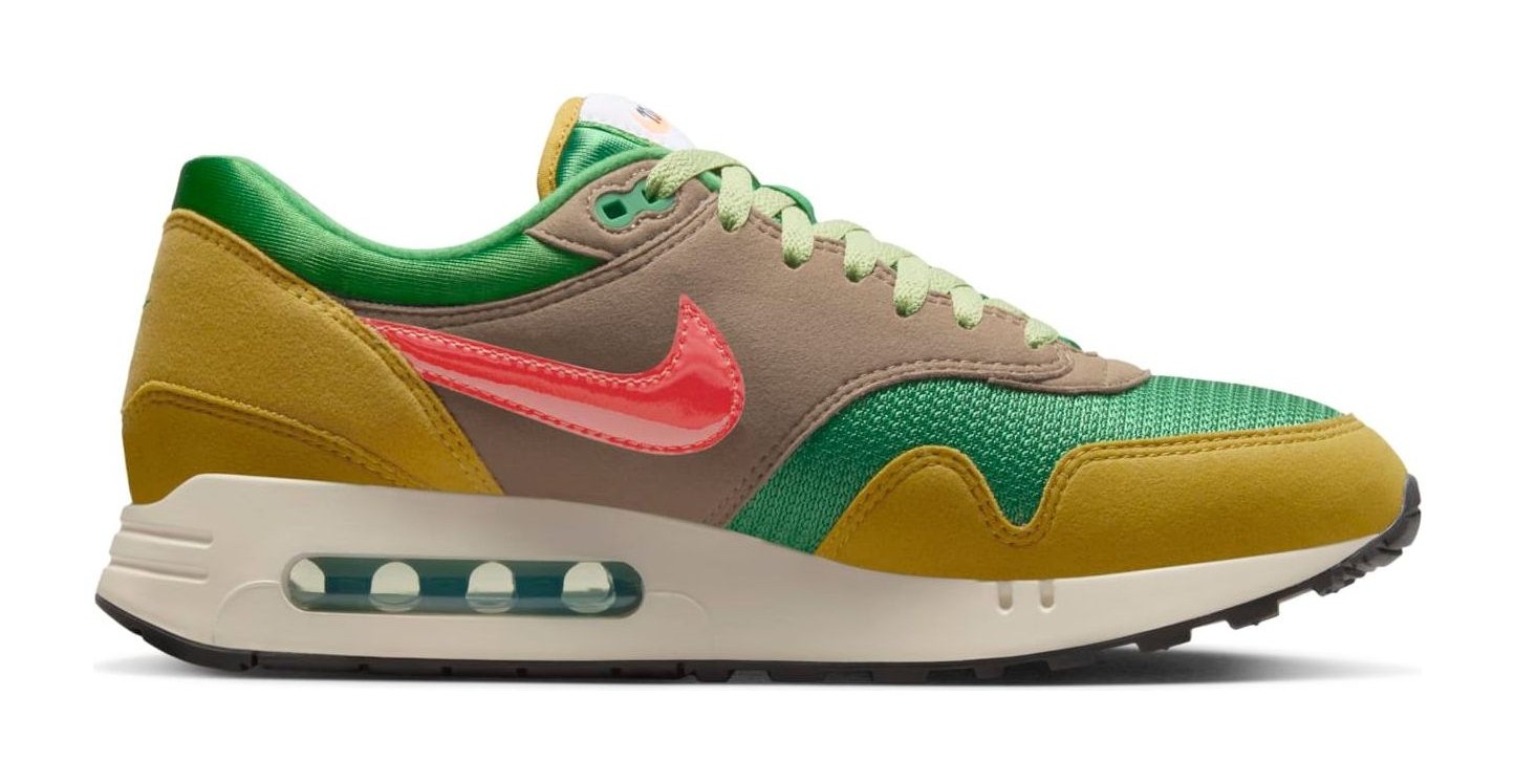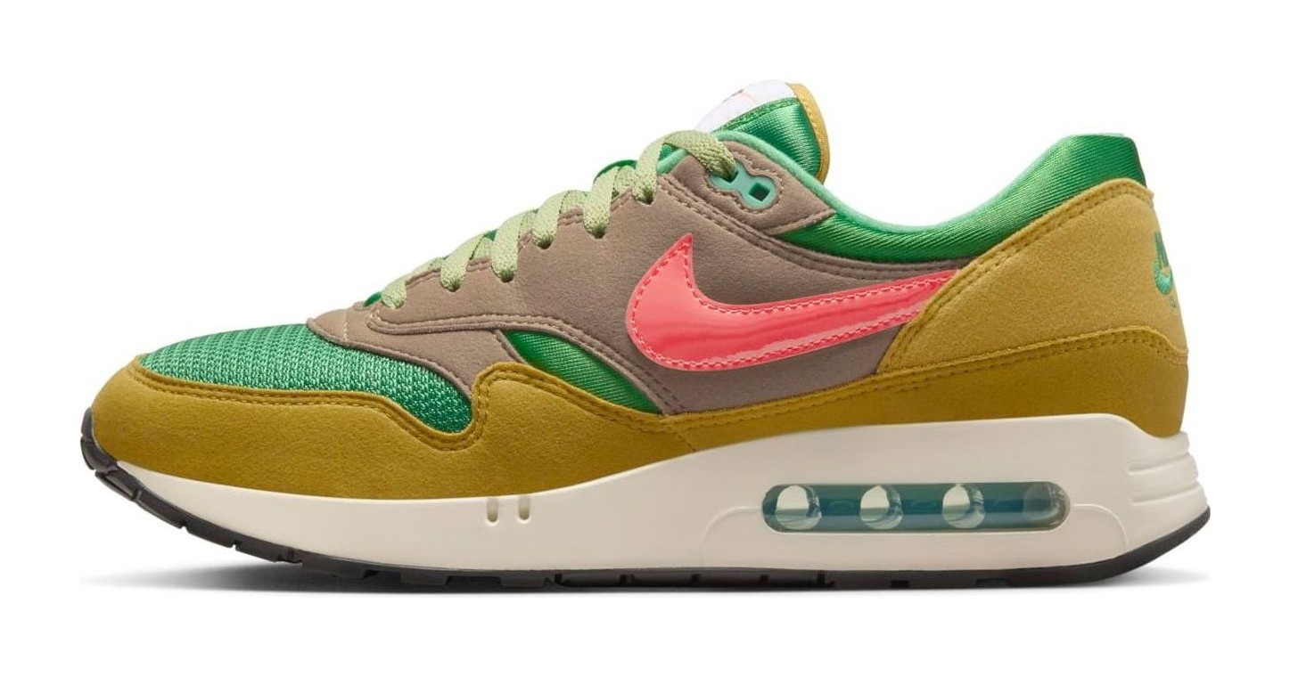 This premium (PRM) release of the Air Max 1 '86 revives the original 1986 'Big Bubble' Max Air unit and is part of the "Powerwall BRS" series, which pays homage to Nike's roots (Blue Ribbon Sports). The shoe features a multi-toned upper with a Classic Green mesh base, suede and leather overlays in Olive Grey and Bronzine, and a contrasting Ember Glow patent leather Swoosh, blending earthy tones with a vibrant pop of color.