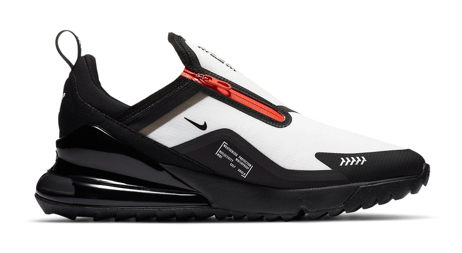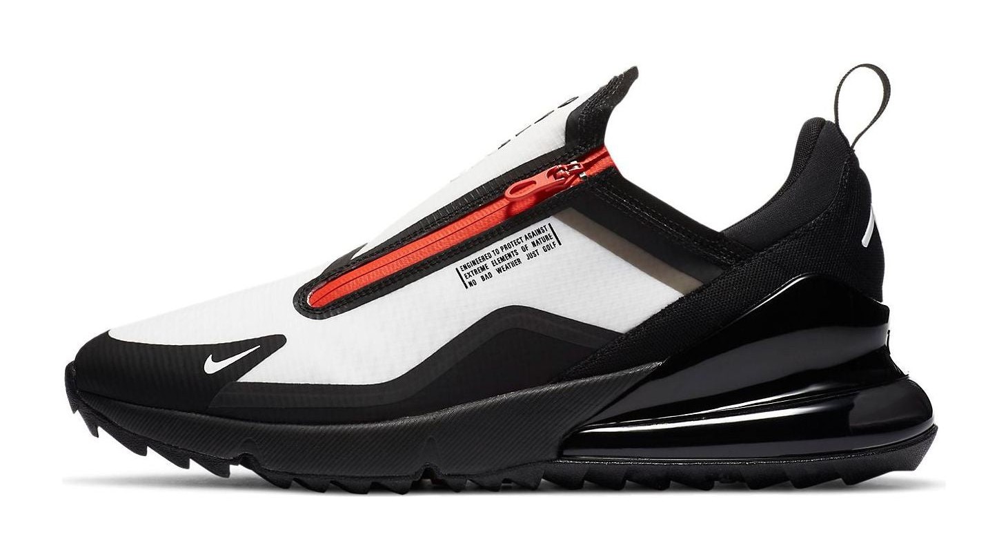 This golf shoe is engineered for performance in wet weather, featuring a water-resistant, all-black upper with a seamless, zippered shroud closure and a durable rubberized mudguard for extra protection. The predominantly dark design is brightly contrasted by bold Team Orange accents, primarily on the zipper and branding. It is built on the familiar Air Max 270 platform, which includes a large Max Air unit in the heel for comfortable cushioning and an integrated, spikeless traction pattern on the outsole for grip on the course.