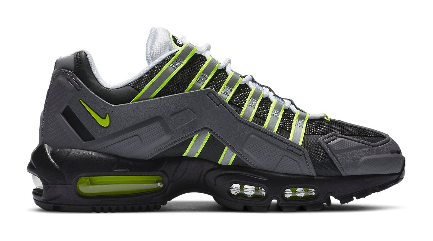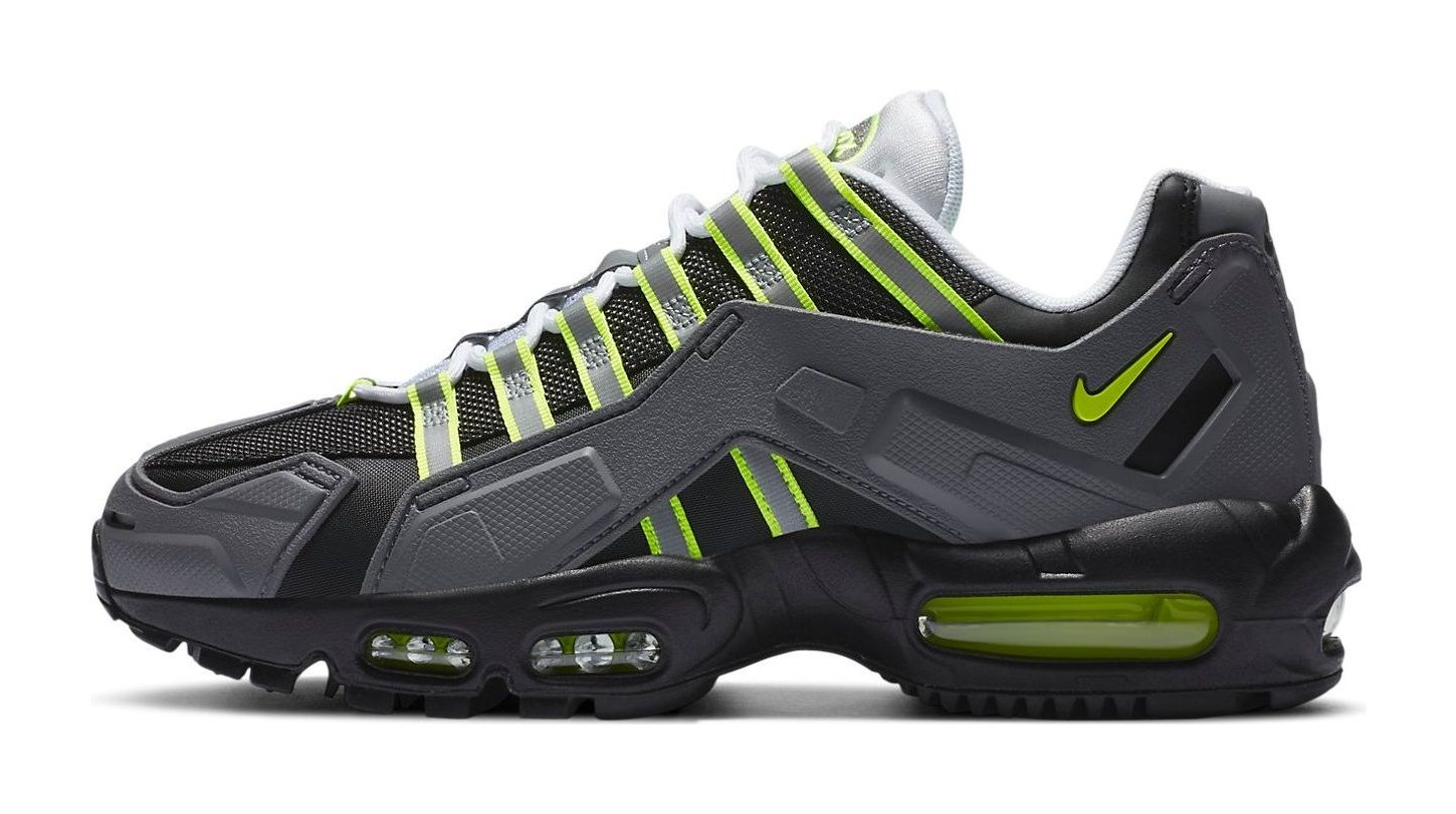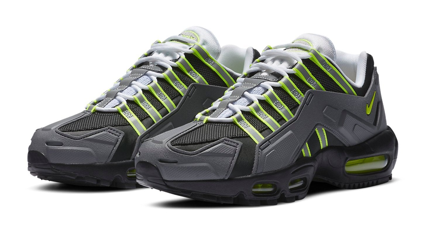 This shoe is a rugged, "indestructible" (NDSTRKT) interpretation of the iconic Air Max 95 "Neon" colorway. The upper is heavily reinforced with a molded TPU cage and rubberized overlays in black and Medium Grey, offering enhanced durability and a utilitarian look. The classic "Neon Yellow" (or Volt) accents are strategically placed on the webbed lace loops and the visible Max Air units, maintaining the original color DNA while creating a tough, futuristic aesthetic.