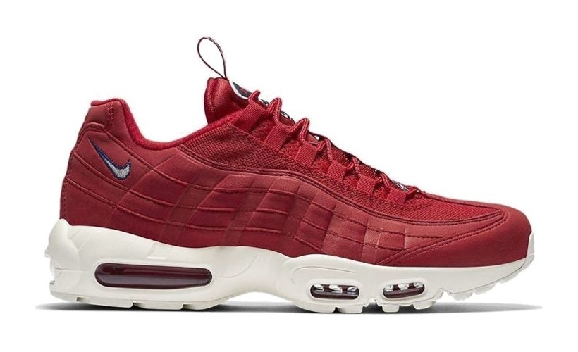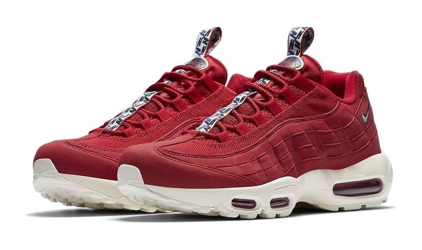 This special edition Air Max 95 is part of the "Pull Tab Pack," featuring a tonal upper constructed from mesh, leather, and suede, all primarily drenched in "Gym Red." Its key feature is the unique, oversized pull tab on the tongue, which is patterned with repeating "N" logos in black and "Gym Blue." The tonal red upper is set atop a clean, off-white "Sail" midsole, creating a patriotic red, white, and blue color scheme, and incorporates red visible Max Air cushioning units.