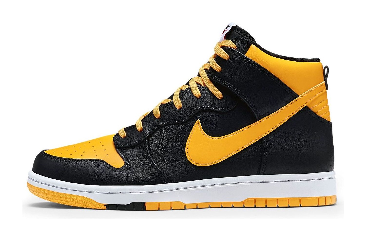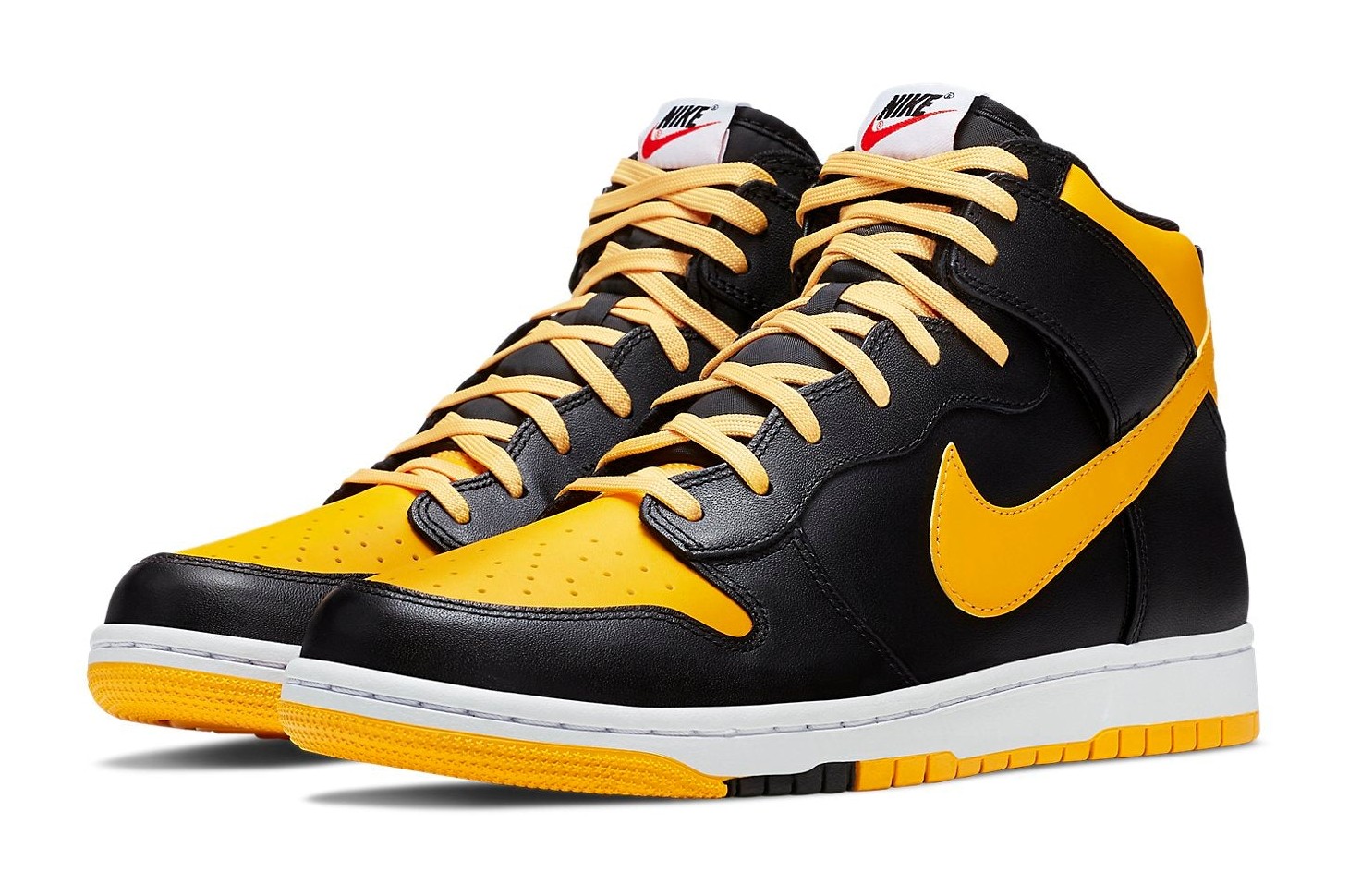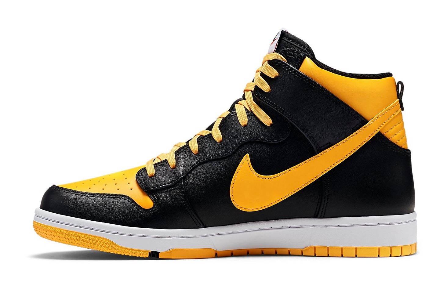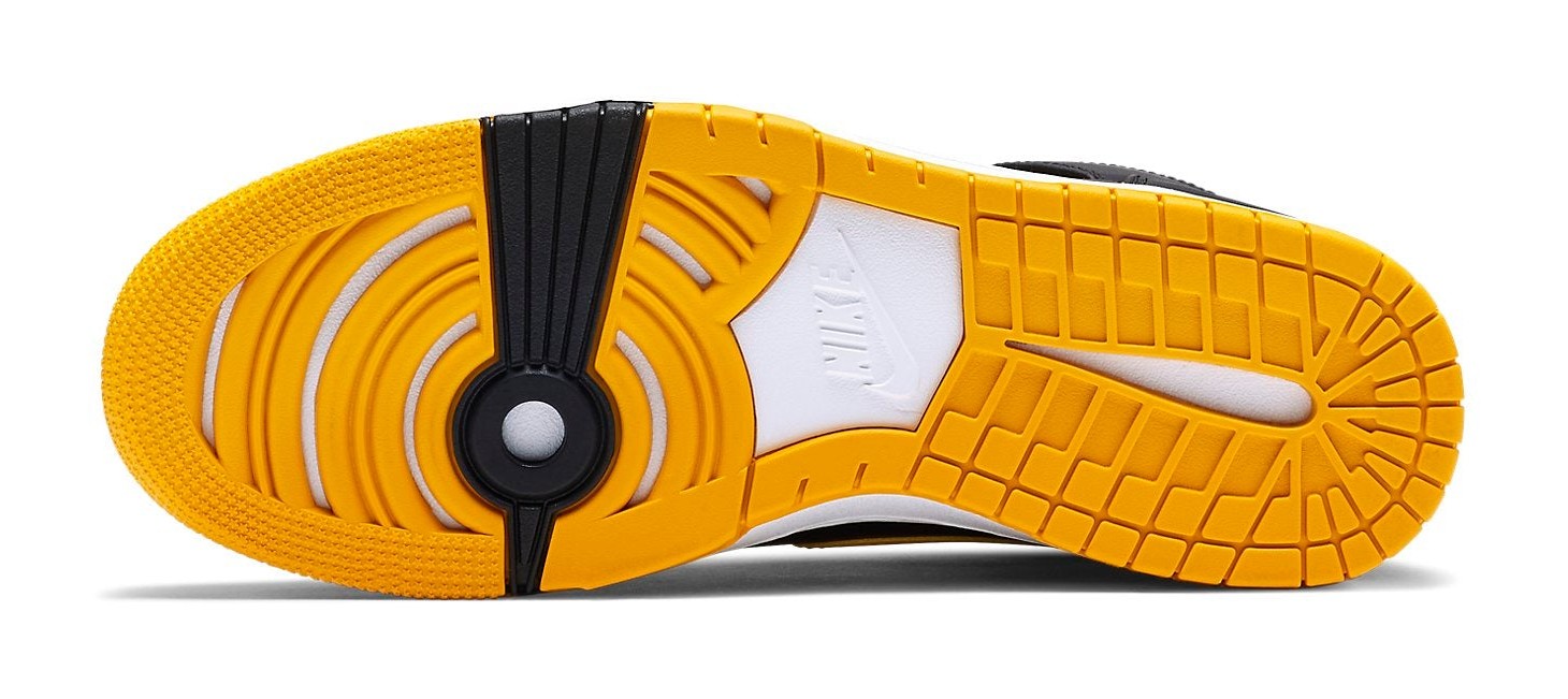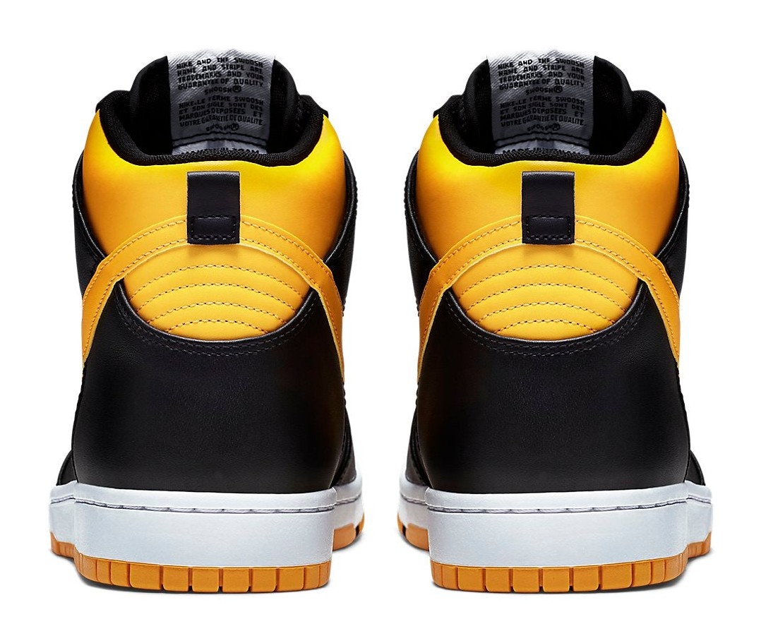 The shoe features a black and yellow/gold color-blocking on the modernized Dunk Comfort design, which provides extra cushioning and a slightly lighter feel than the original Dunk.