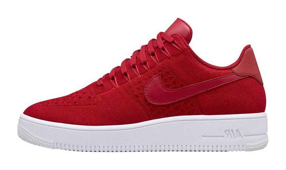 This is a premium, lightweight iteration of the classic Air Force 1 Low, featuring a vibrant, predominantly Gym Red Flyknit upper which reduces the overall weight by about 50% compared to the original. It features tonal red leather accents on the heel tab and tongue for a premium touch, and sits atop a contrasting white Ultra sole with cored-out sections for further weight reduction.