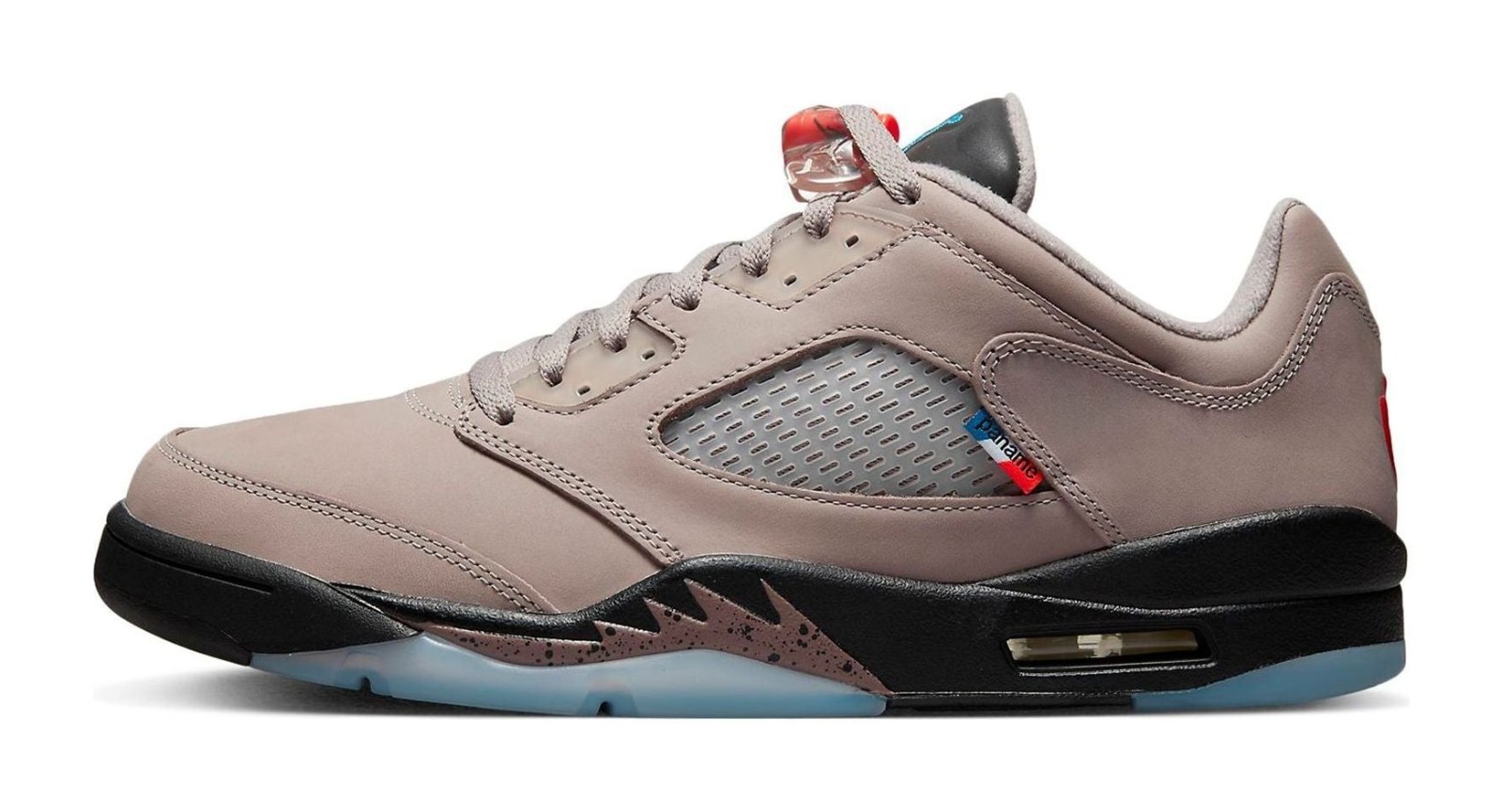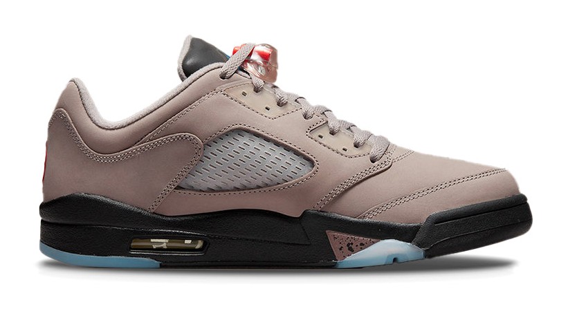 The Air Jordan 5 Retro Low x PSG 'Paname' is the latest collaboration between the Jordan Brand and the French football club Paris Saint-Germain. The shoe features a premium suede upper in a neutral "Pumice" (gray/tan) color, contrasting with a black leather tongue. Key collaborative details include a red, white, and blue "PANAME" tag (a nickname for Paris) on the side panel, and a subtle co-branded wax seal stamp on the heel. The black midsole with its speckled 'shark teeth' is visible over an icy-blue translucent outsole, which also features a visible PSG logo. The inside of the tongue features the phrase "ICI C'EST PARIS" ('Here is Paris') split into two patches. The design is inspired by the quality and sophistication of Parisian fashion.