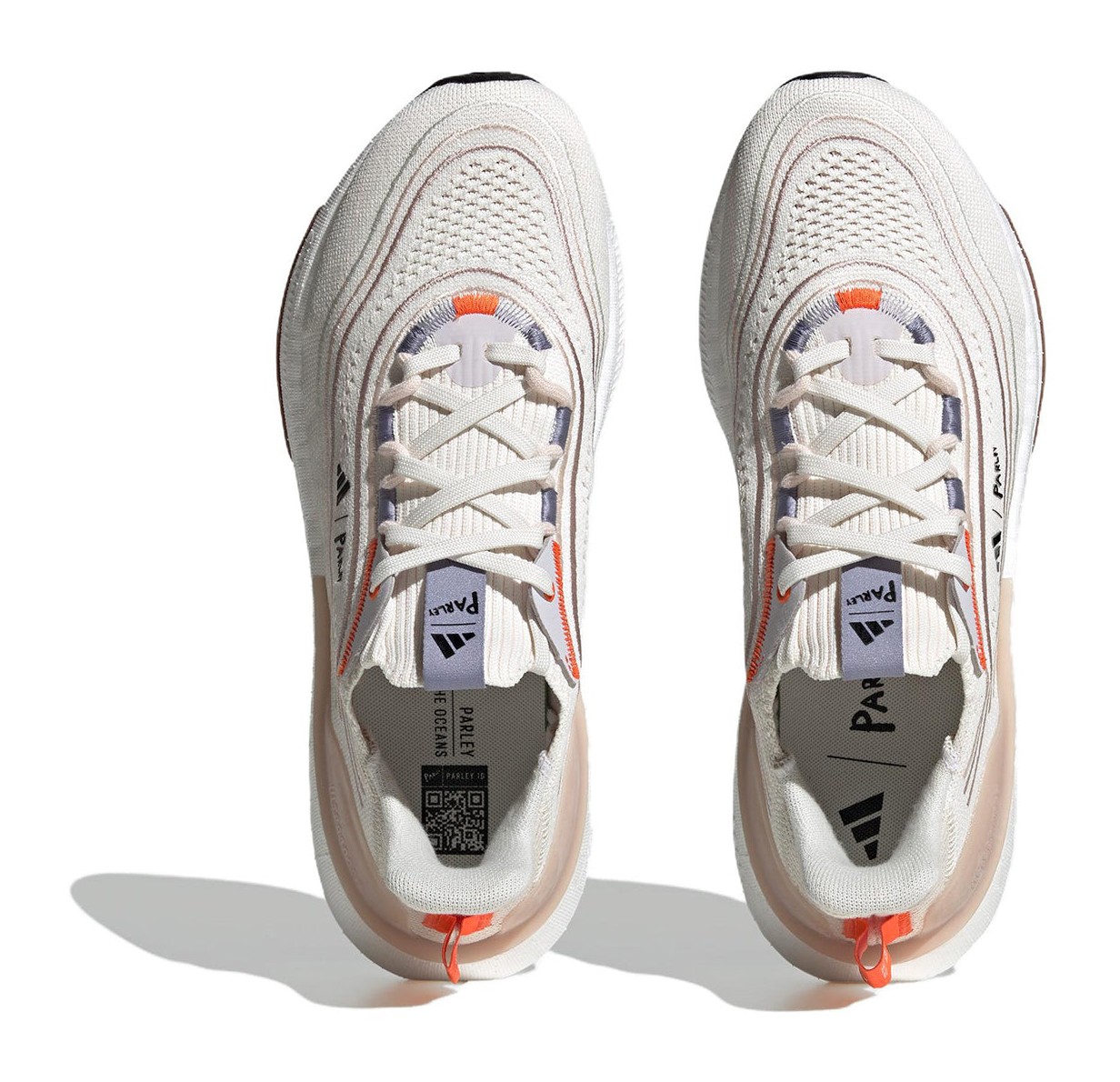 This is a performance running shoe featuring the new, 30% lighter Light BOOST midsole and the energy-optimizing Linear Energy Push (LEP) system. The textile upper, made with Parley Ocean Plastic and recycled polyester, uses a minimal "Non Dyed" color approach—a very light off-white or cream base—combined with accents of Core Black and Wonder Taupe on the knit, heel counter, and Continental™ Better Rubber outsole. The colorway's neutral, earth-toned look reflects its sustainable material composition, which boasts a minimum of 10% less carbon emissions compared to a previous version.