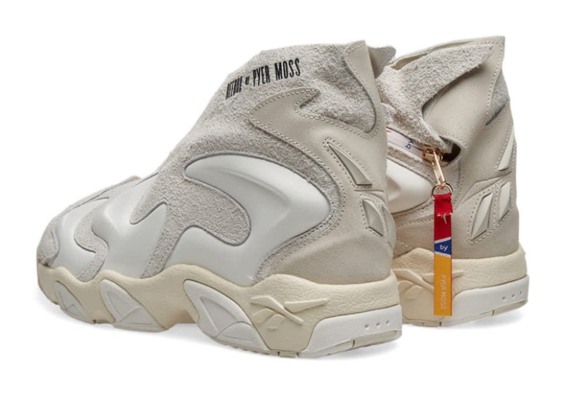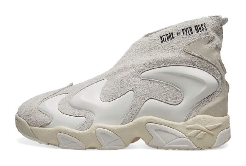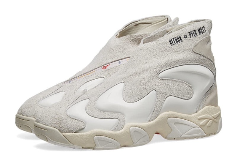 The Reebok Mobius Experiment 3 (EF4639) "Chalk White" is a luxury collaboration with New York-based label Pyer Moss, led by designer Kerby Jean-Raymond. The sneaker reworks a 90s basketball silhouette with a distinctly futuristic and elevated fashion approach. It features a high-cut design with a neoprene inner bootie and an upper constructed from chalk-colored suede and contoured leather overlays that create a flowing, flame-like effect around the shoe. The monochrome palette is accented with a subtle gold metallic detail on the branding. The shoe is built on a supportive EVA midsole that houses Reebok's Hexalite cushioning for comfort.