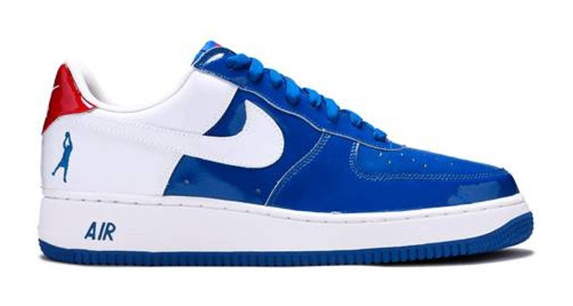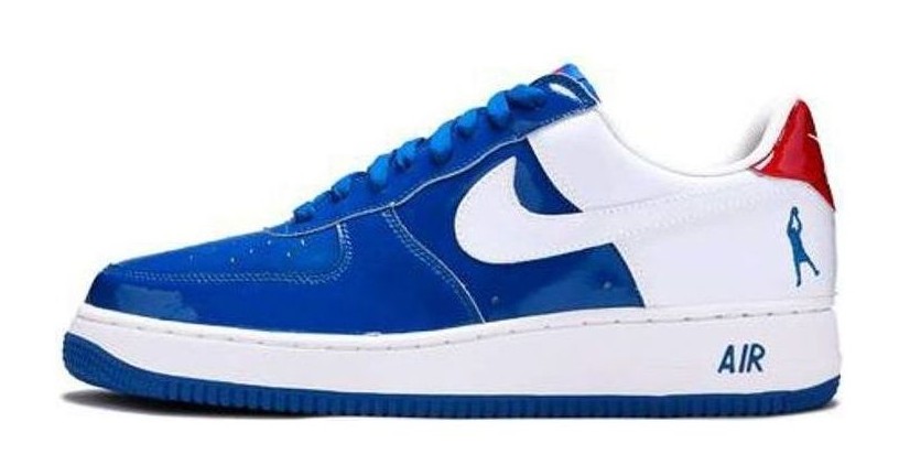 This sneaker is a signature edition for NBA legend Rasheed Wallace, featuring a glossy patent leather upper finished in the colors of the Detroit Pistons. The forefoot and quarter panel are rendered in a bold Blue Jay color, contrasted by a White heel panel and Swoosh. A vibrant Varsity Red heel tab completes the team colors, and the heel is marked with Wallace's personal logo depicting his signature fadeaway jump shot.