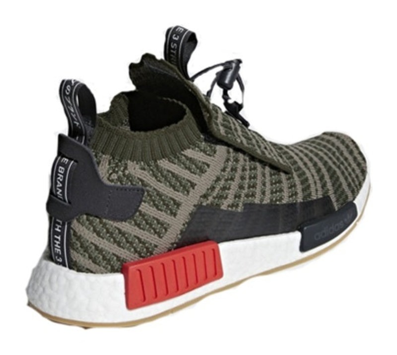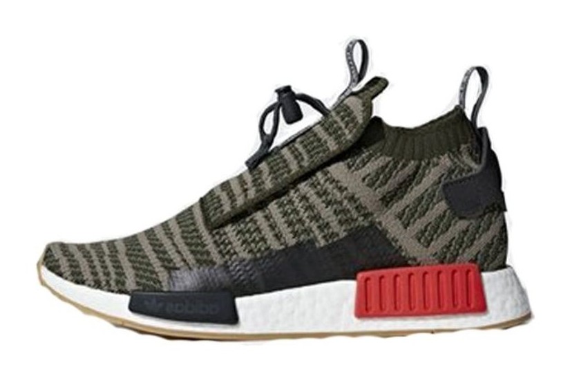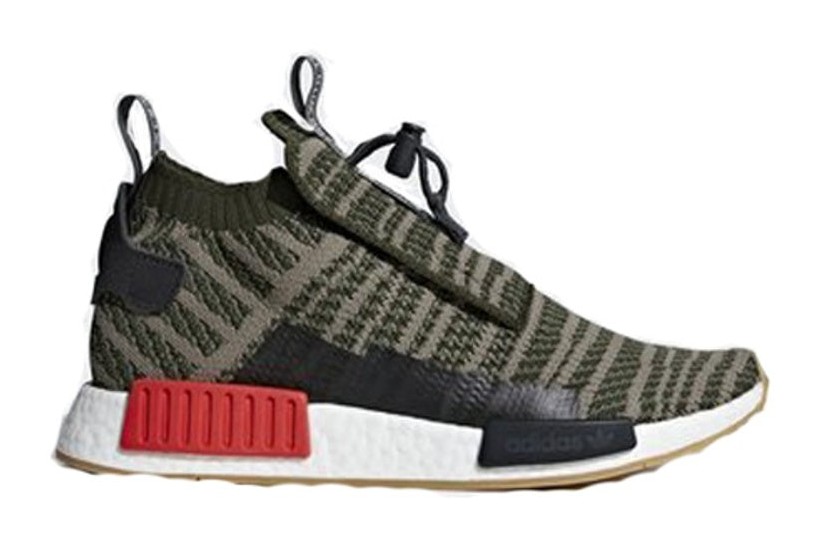 A military-inspired colorway of the outdoor-ready NMD_TS1. The Primeknit upper is finished in a deep olive-green Night Cargo, with subtle accents of Base Green and grey Steel woven throughout. The shoe features the TS1's unique construction, including a quick-lacing system with a toggle, a foldable tongue flap, and a leather heel patch. The tonal upper is contrasted by a white Boost midsole with a red rear EVA plug and a black forefoot plug.