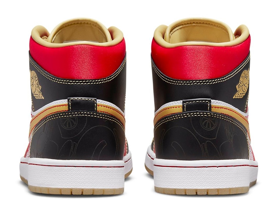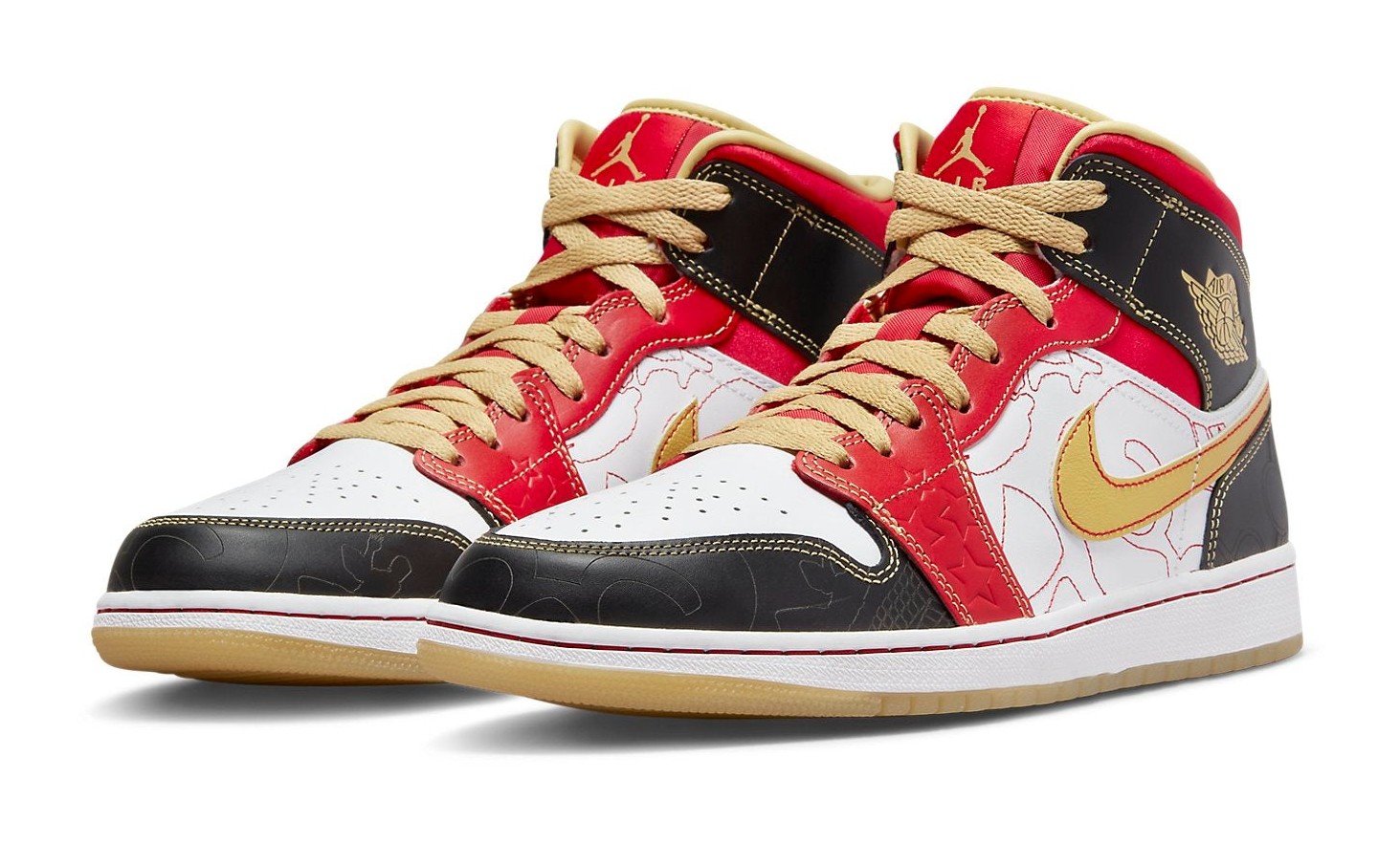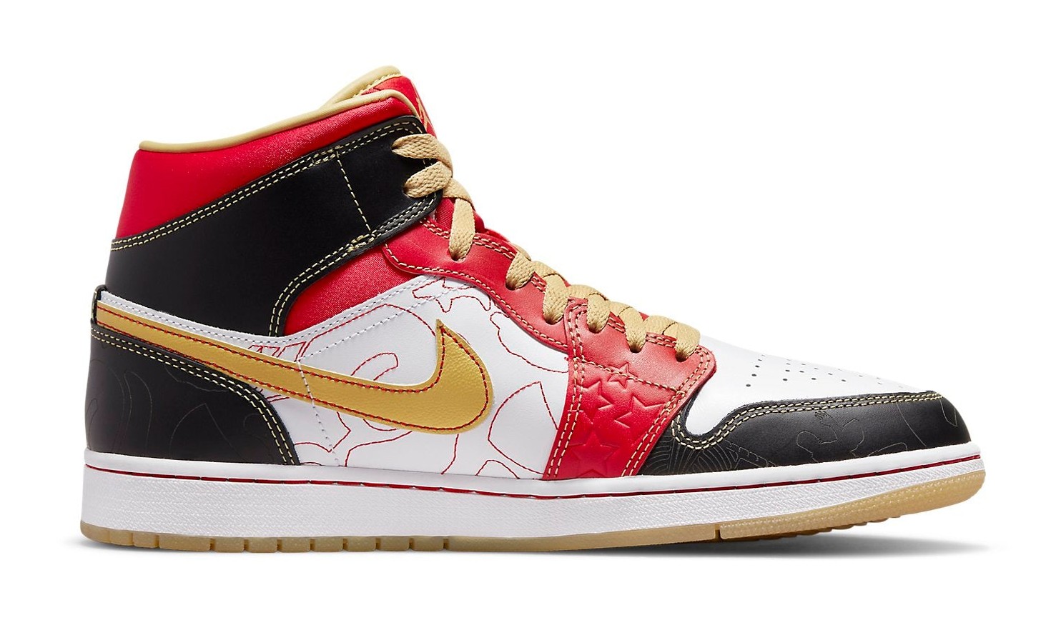 This sneaker is a recreation of the highly sought-after 2007 Air Jordan 1 "XQ" (Xing Qi, meaning "Exciting" or "Wonderful") which was a China-exclusive release. The upper features a dynamic, patchwork-like color blocking of White leather on the toe box and mid-panel, contrasted by overlays in Sport Red and Black. The design is rich with detail, including laser-etched or embossed star patterns on the red panels and decorative stitching in Gold Dust. Gold accents are used on the leather Swoosh, the laces, and the Air Jordan Wings logo on the collar. The shoe sits on a white midsole and is finished with a translucent Gum rubber outsole, referencing its premium and exclusive heritage.