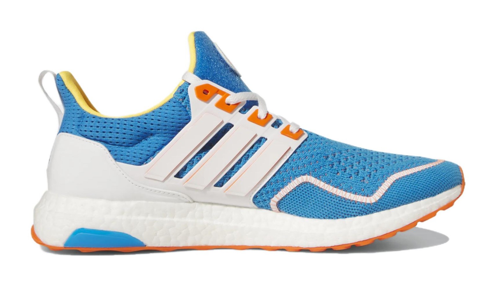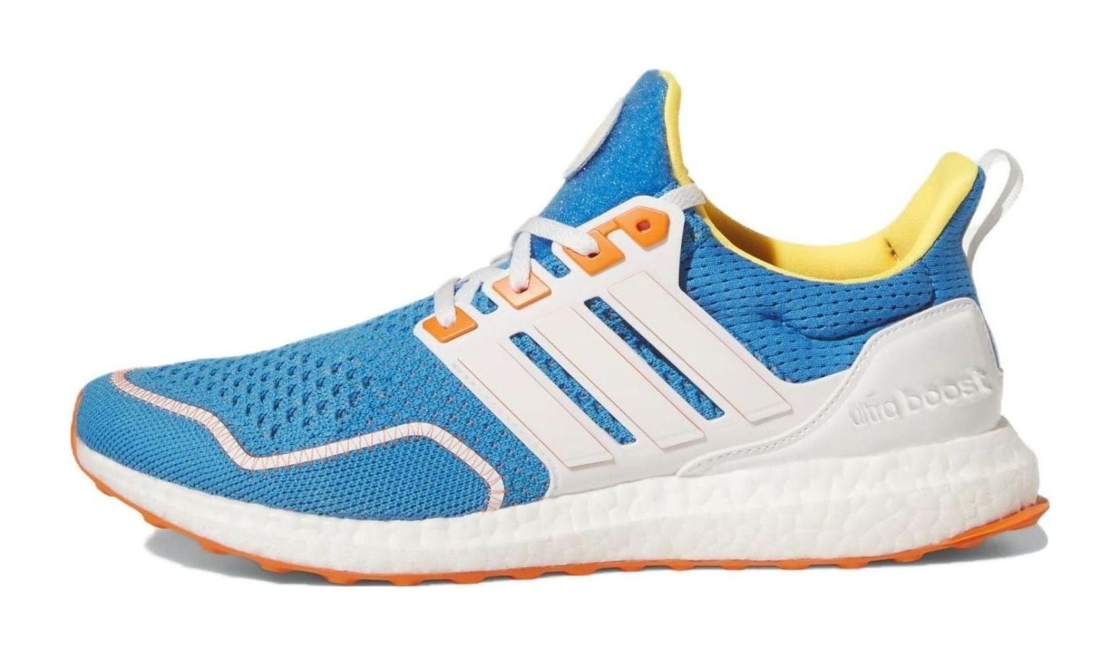 This men's Ultraboost 1.0 features a bright blue Primeknit upper with accents of cloud white and orange. The responsive Boost midsole is colored white for energy return with every step. The durable Continental™ rubber outsole provides enhanced traction, while the Primeknit upper offers a supportive, sock-like fit.