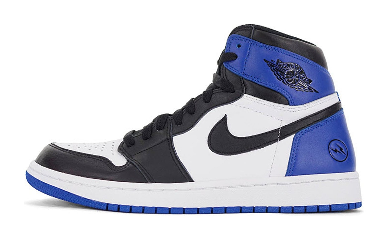This highly exclusive sneaker is based on the iconic Air Jordan 1 "Black Toe" color-blocking but uses the signature colors of Hiroshi Fujiwara's Fragment Design. The upper is made of premium leather in a tri-color scheme: Black on the forefoot overlays, Swoosh, and collar; clean White on the toe box and mid-panel; and a vibrant Sport Blue (Royal Blue) on the ankle collar and heel. The defining feature that sets this collaboration apart is the debossed Fragment Design lightning bolt logo on the lateral heel. The suffix "-040F" specifically indicates the incredibly rare Friends & Family edition, though the visible appearance is nearly identical to the general release.