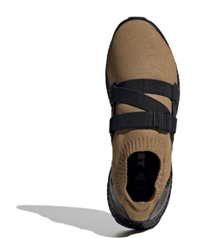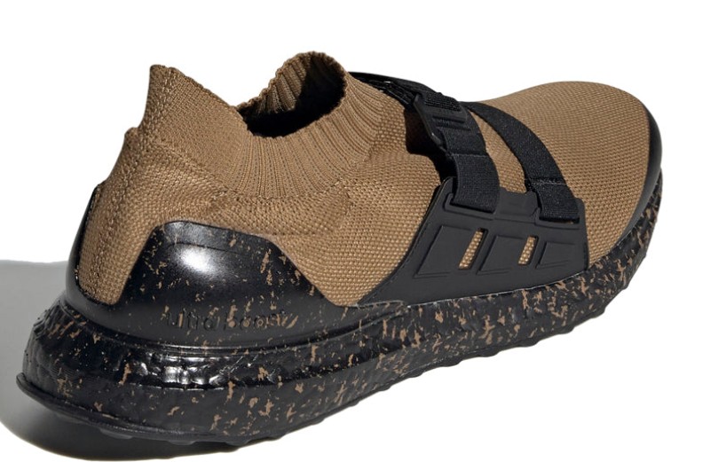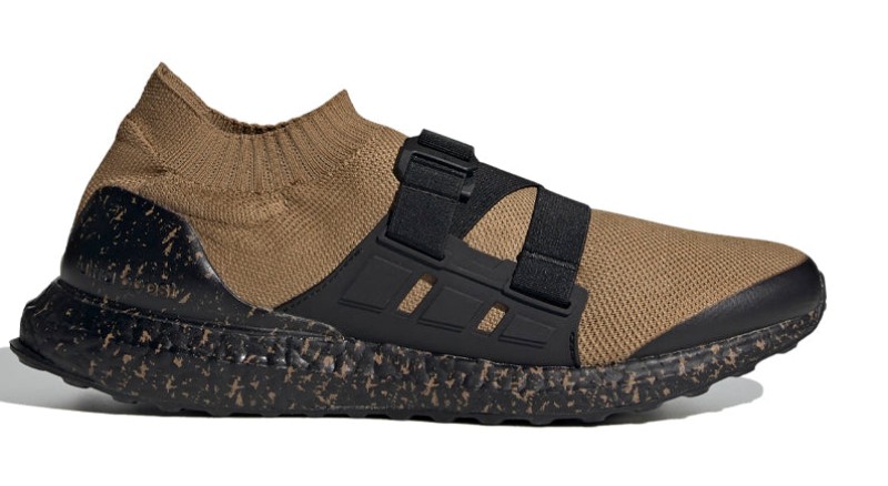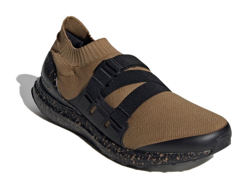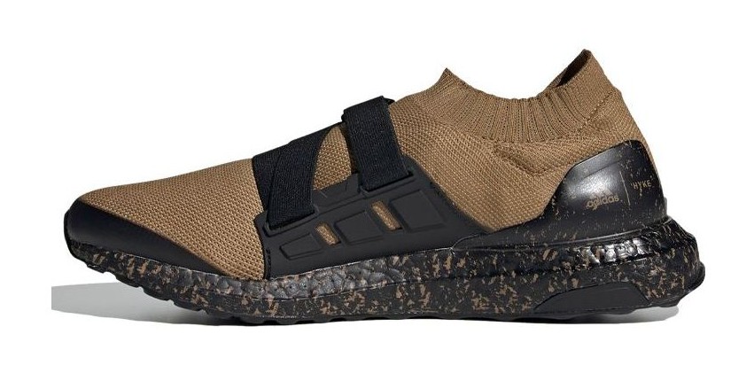 This design, a result of the collaboration with Japanese label HYKE, features a Primeknit upper in a rich "Supplier Colour," which is a deep brown or tan. The UltraBoost AH-001 removes traditional laces in favor of two adjustable midfoot straps for a secure, utilitarian fit. The rubber outsole and Boost midsole are held in Core Black. A defining characteristic of this colorway is the marbled detailing visible on the heel counter and across the Boost midsole, giving the high-performance cushioning a distinct, textured look.
