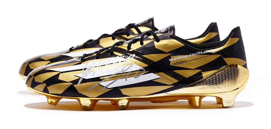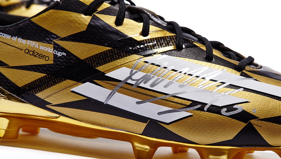 These limited edition James Rodriguez miadidas f50 adizero boots were created to honor his six goals in Brazil and Colombia's historic run to the World Cup quarter-finals. Only six signed pairs of this gold and black exclusive were produced, featuring custom top goalscorer detailing on the side and the goal count on the tongue.