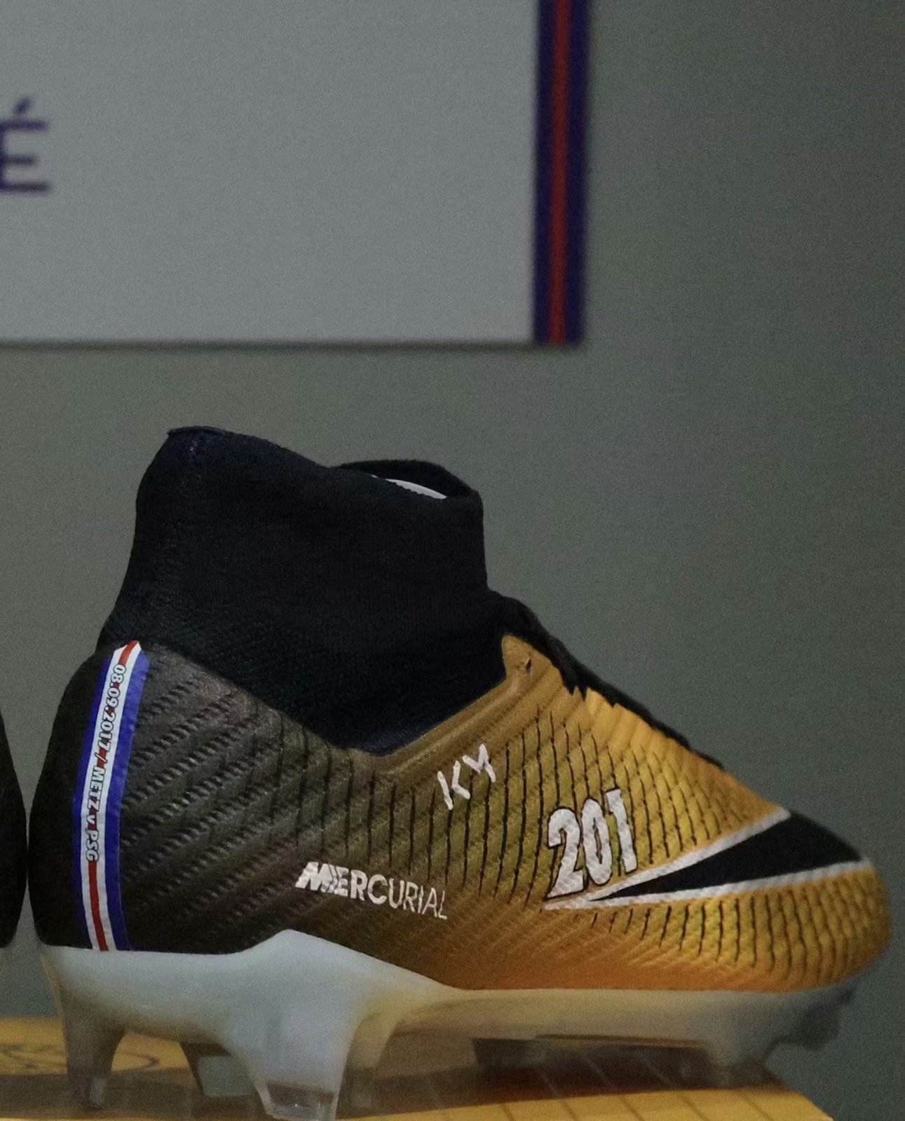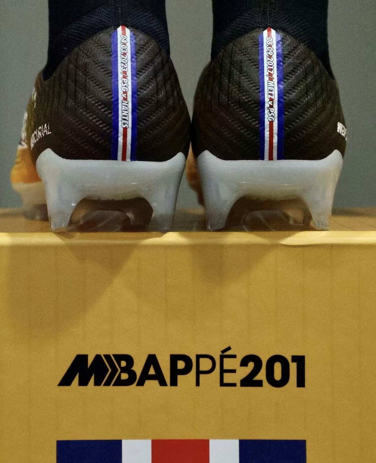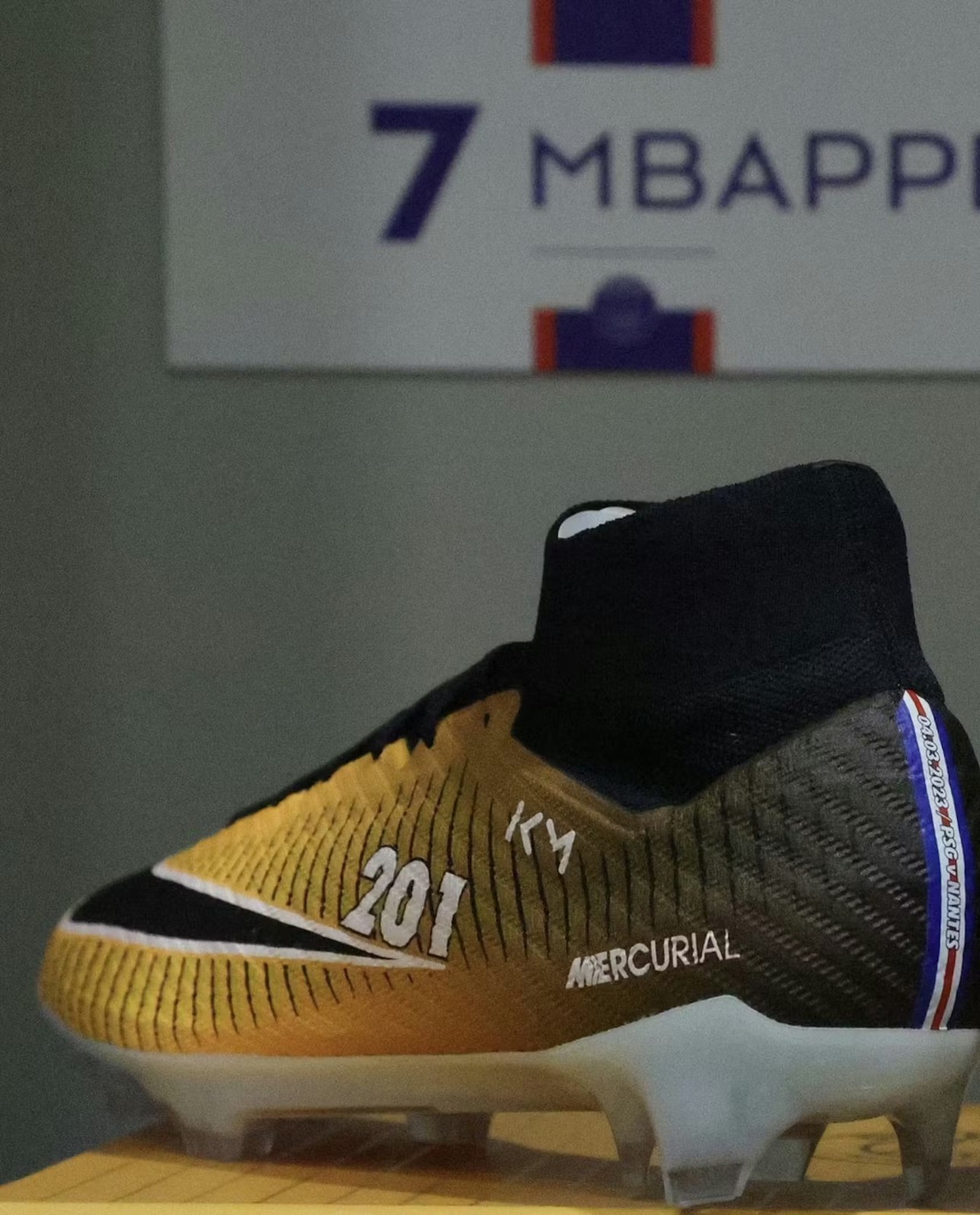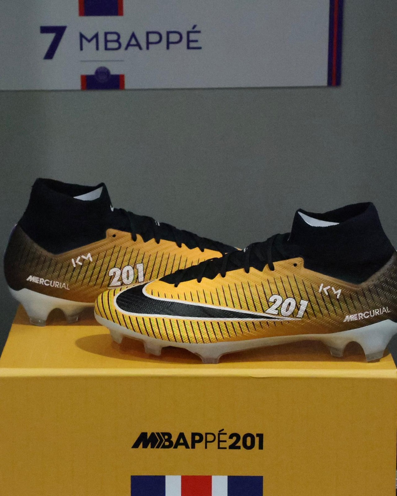 Kylian Mbappé received custom Nike Mercurial boots in 2023 that blend the modern Superfly 9 technology with the 2017 Lock In Let Loose colorway to celebrate his status as the all-time leading scorer for Paris Saint-Germain. These exclusive cleats feature a Dynamic Fit collar and commemorative details including the number 201 and the dates of his most significant club milestones.
