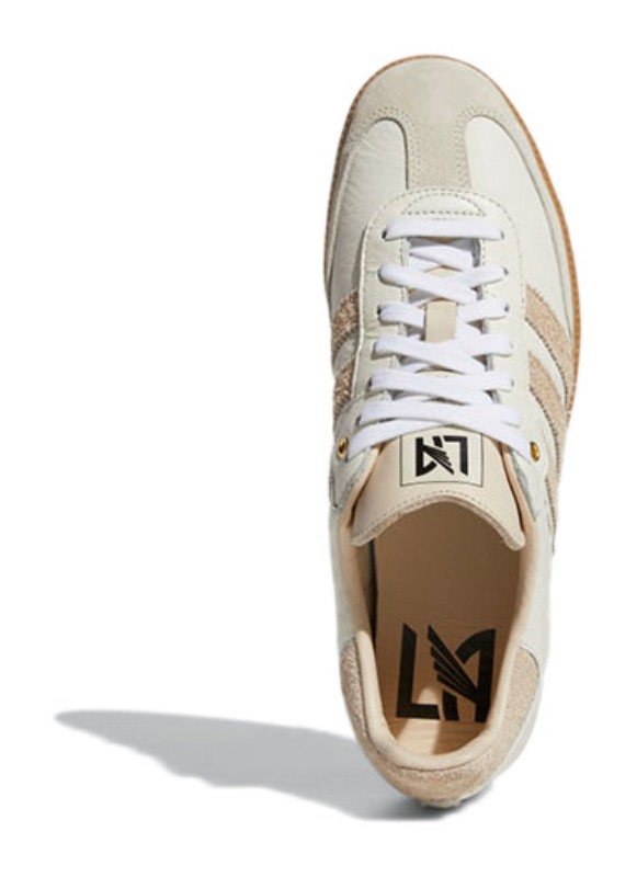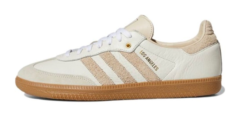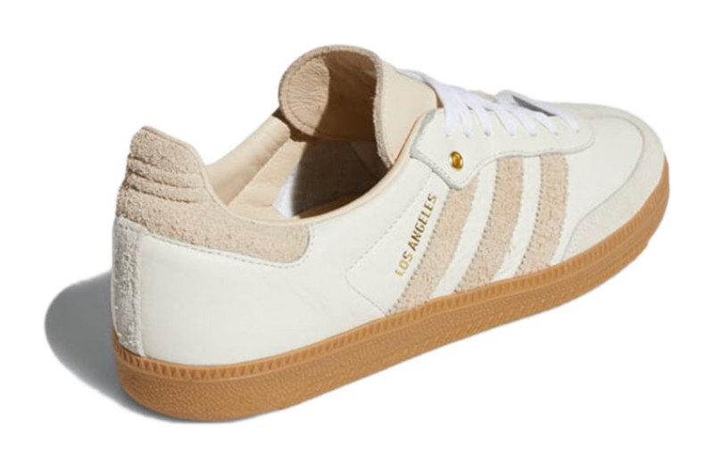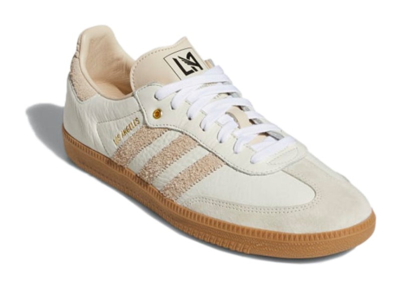 This collaboration with the Los Angeles Football Club (LAFC) features an upper constructed from premium Off White and Linen colored leather and suede, providing a neutral, lifestyle-focused aesthetic. The shoe incorporates LAFC's team colors and branding through subtle details, most notably the Gold foil text on the lateral side near the three stripes and the LAFC crest that is featured on the tongue. It is finished with the classic Gum rubber outsole.