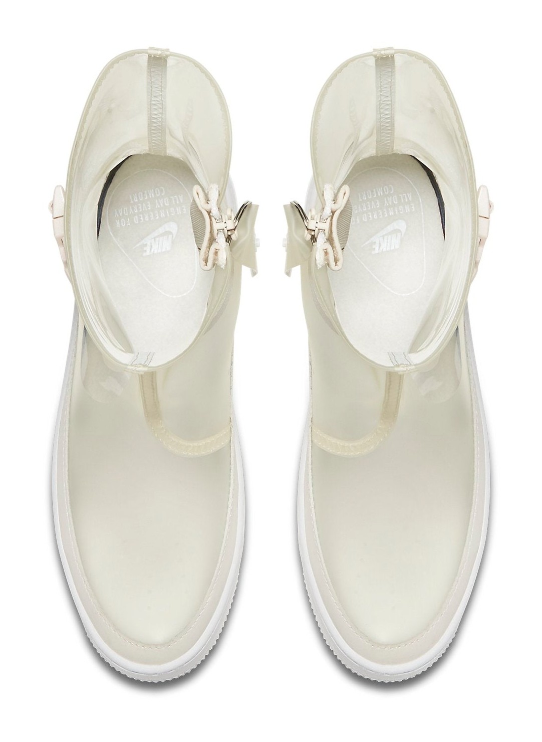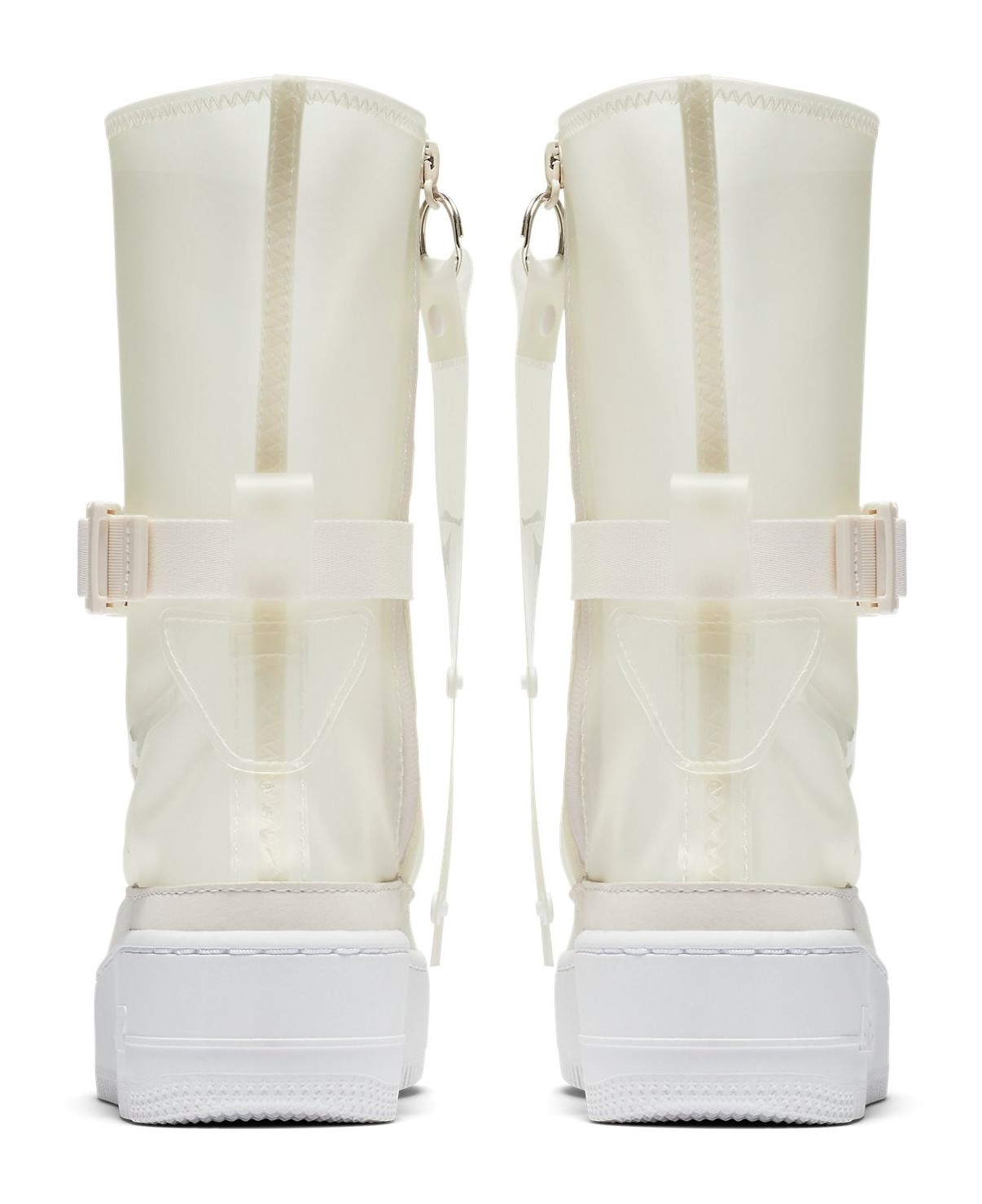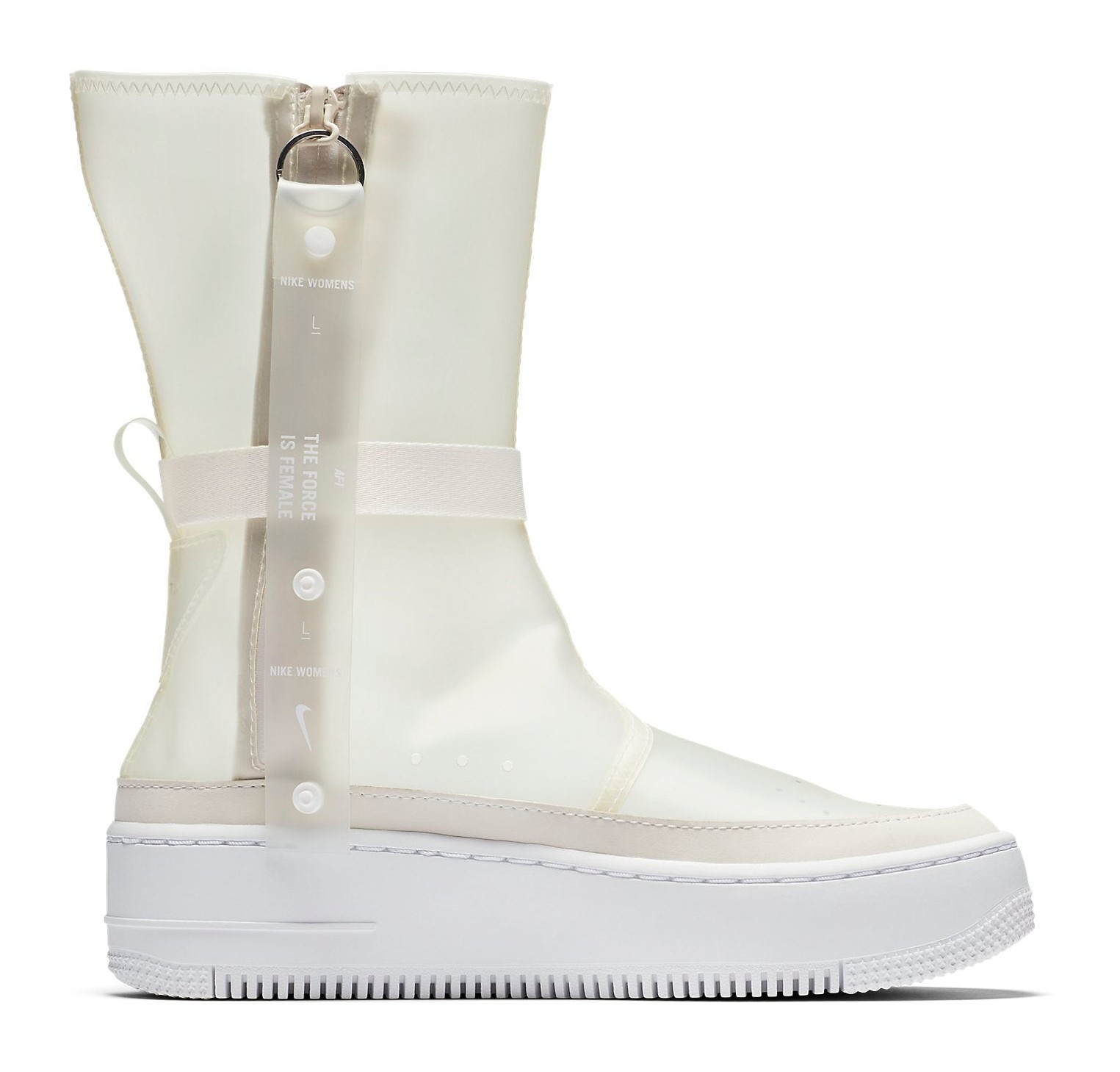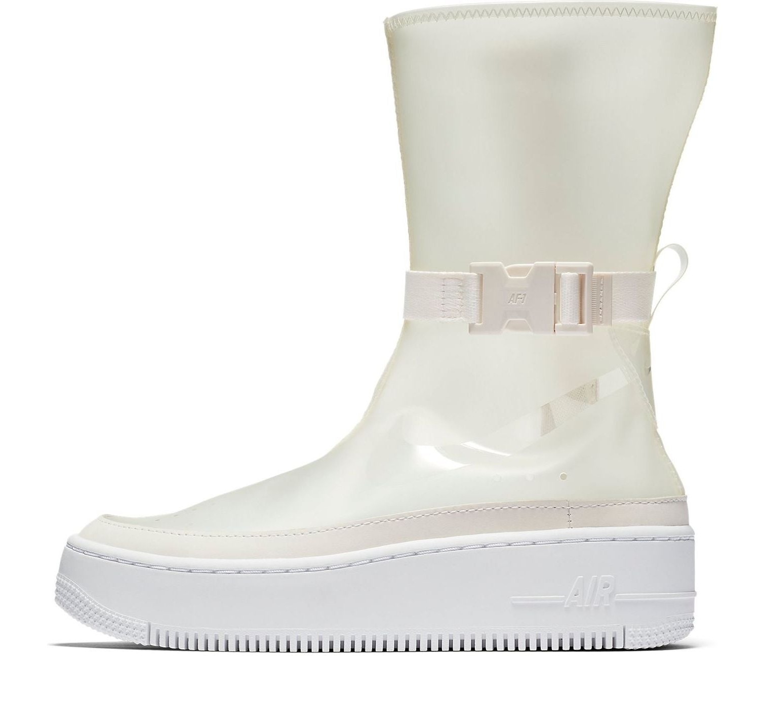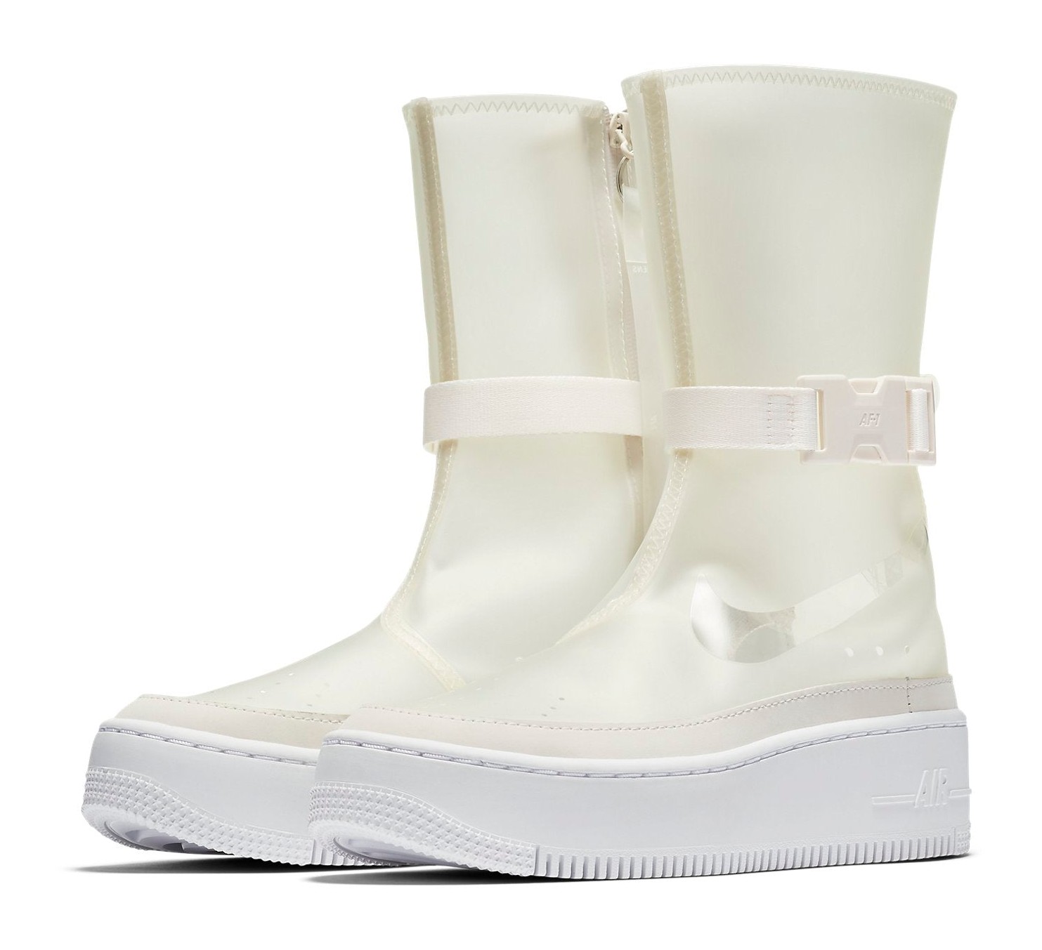 This is a high-top, sneaker-boot hybrid model designed for women, built on the elevated platform sole of the Air Force 1 Sage line. It features a unique, translucent/clear upper in the Phantom color, which appears as a pale beige or white. It includes lux details like a sleek, full-length medial side zipper for easy on/off and a buckled ankle strap for a secure, utilitarian look, transforming the classic AF1 silhouette into a weather-ready boot.