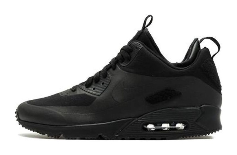 This shoe is a winterized "Sneakerboot" edition of the Air Max 90, featuring a higher profile, inner bootie construction, and seamless, rugged textiles to offer protection in cold weather. The colorway is a sleek, monochromatic "Triple Black." Its key distinguishing feature is the "Patch" element, which includes Velcro on the tongue area designed to be customized with an accompanying set of 22 interchangeable patches referencing the history and landmarks of the Air Max lineage.