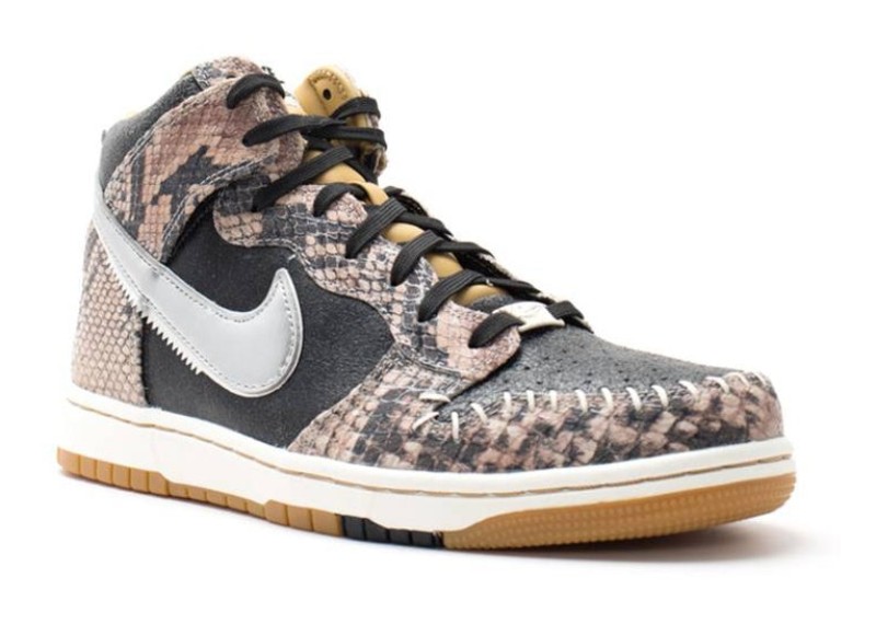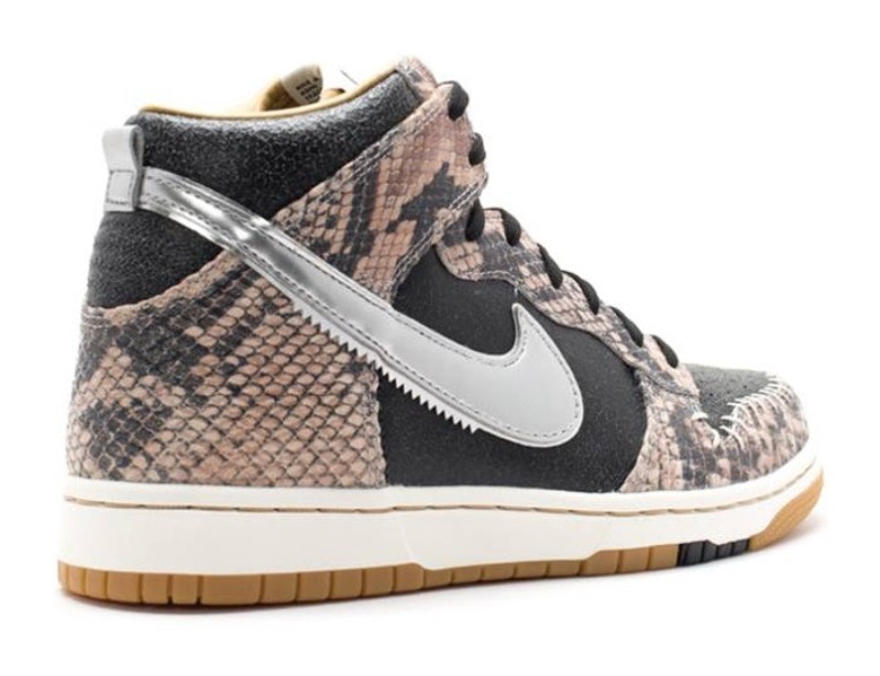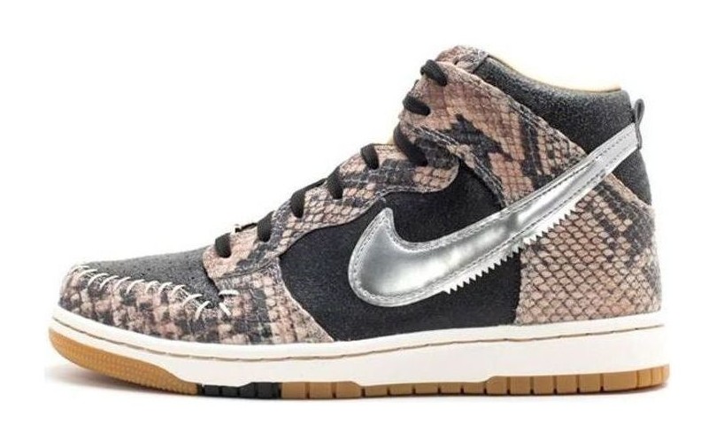This model is an iteration of the classic Dunk High that features CMFT (Comfort) upgrades, including a revamped, more flexible collar and an OrthoLite sockliner. The Premium QS release features a distinctive black upper with panels composed of leather stamped with a subtle, yet prominent, snakeskin texture. Accents include the white/Sail midsole for a vintage contrast and a Metallic Silver Swoosh. The premium construction and animal-print texture give the classic silhouette a luxurious, modern edge.