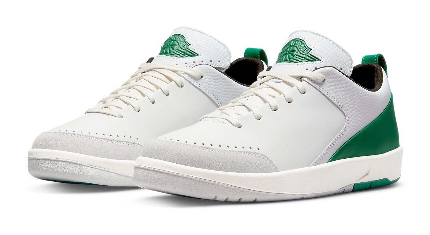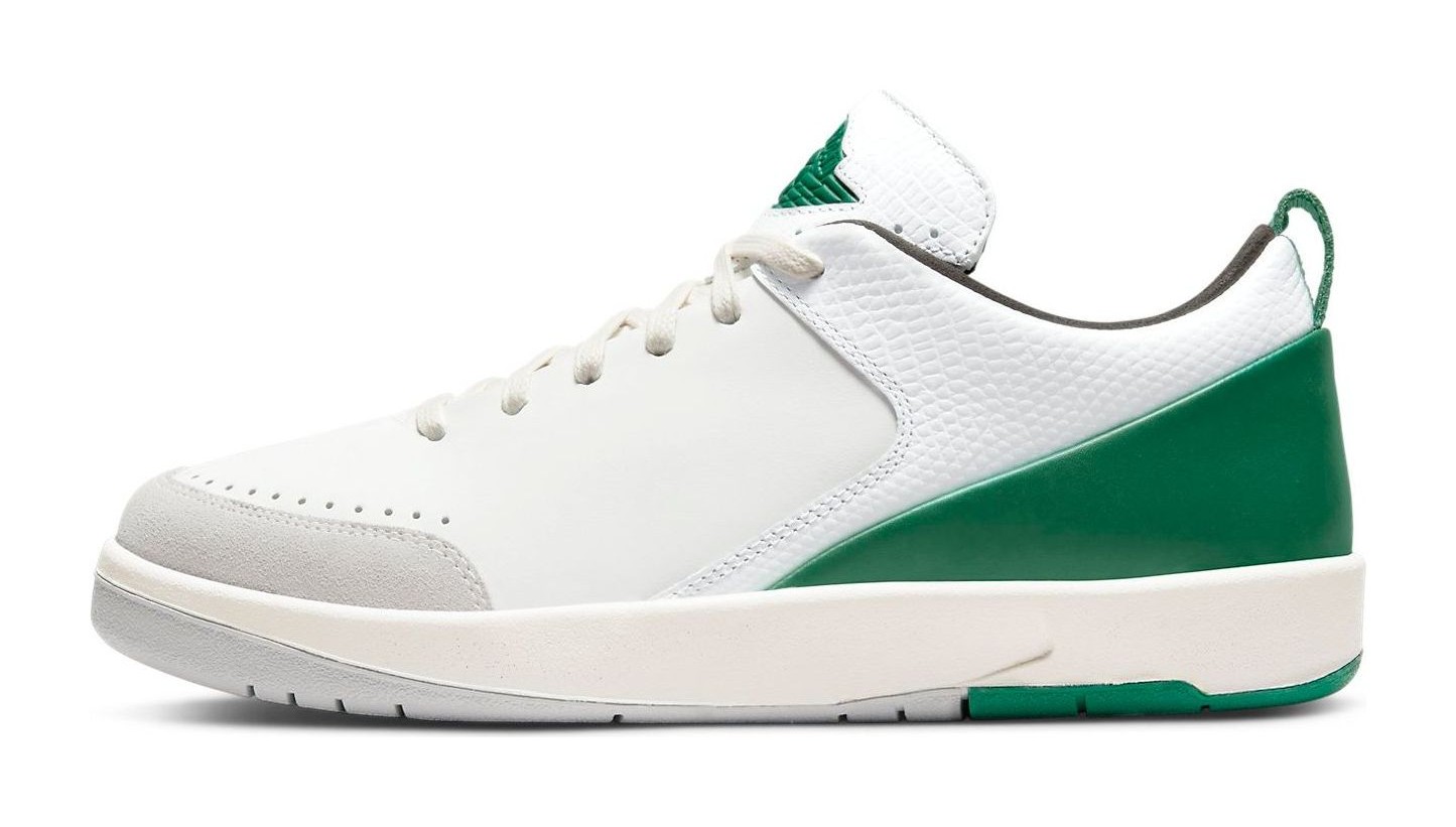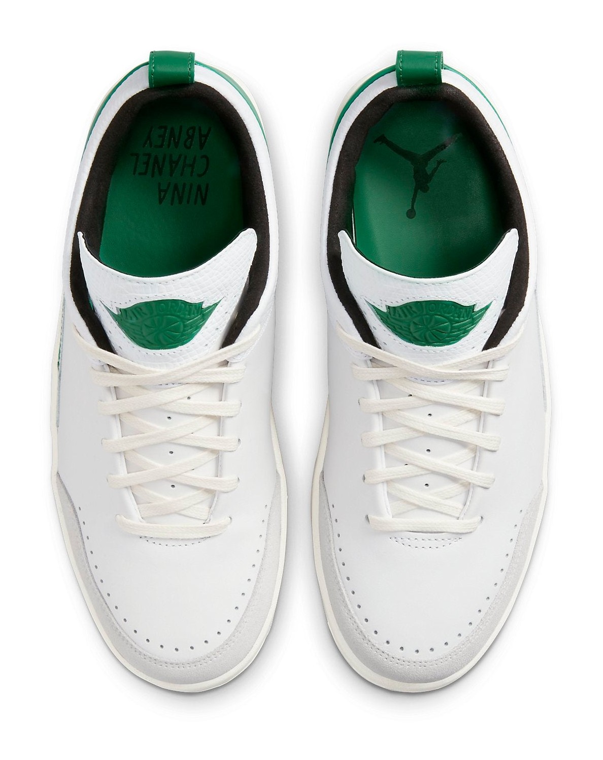 This sneaker is a clean, contemporary take on the Air Jordan 2 Low designed in collaboration with pop-surrealist artist Nina Chanel Abney. It features a primarily White premium leather upper with textured overlays and a grey suede toe wrap. The design is accented with striking Malachite (a deep, vibrant green) on the heel panel, piping, and the updated heel pull tab. The midsole uses a Sail (off-white) color to give the shoe a subtle vintage aesthetic. The sneaker comes with an oversized, special hangtag featuring one of Abney's illustrations and includes custom insoles with mismatched branding.