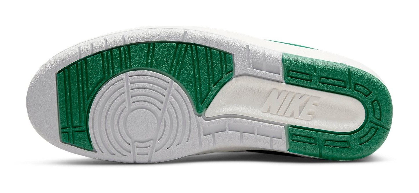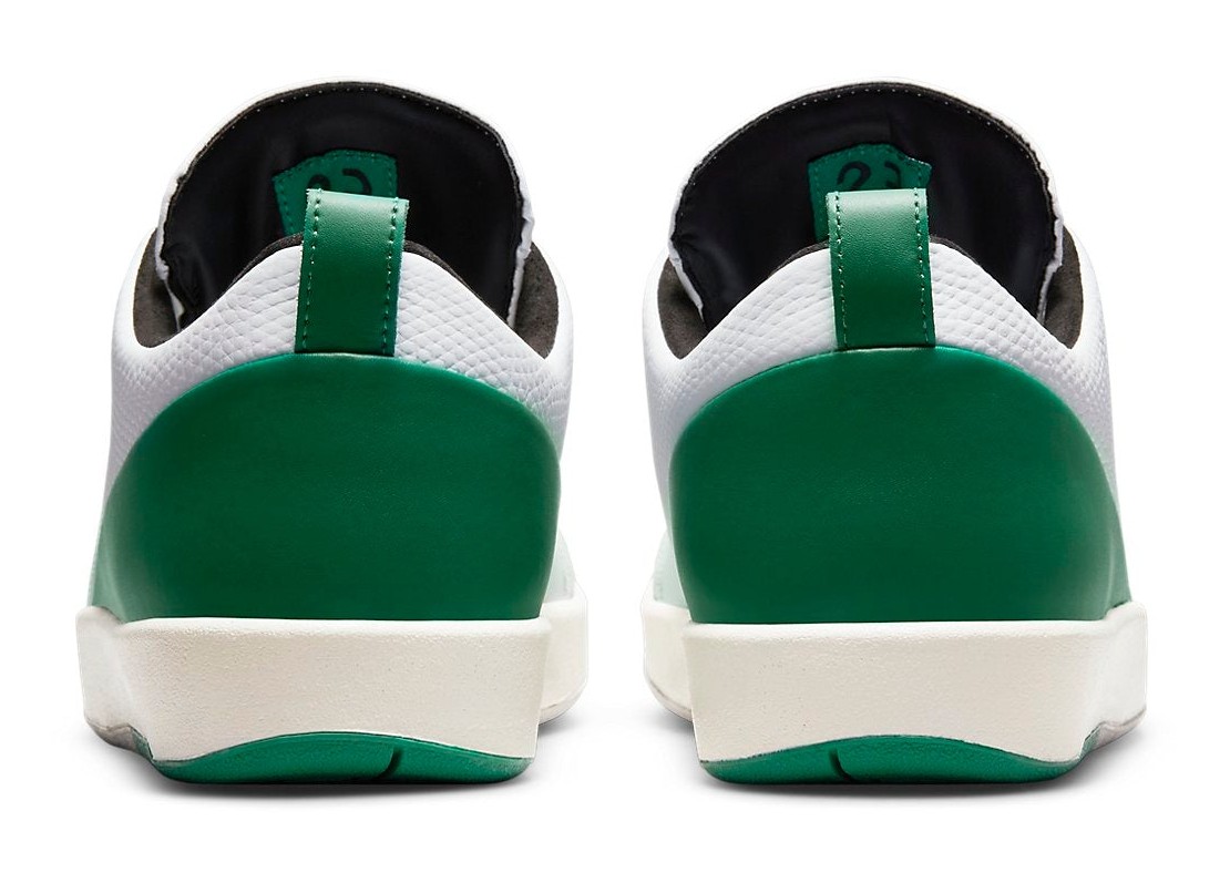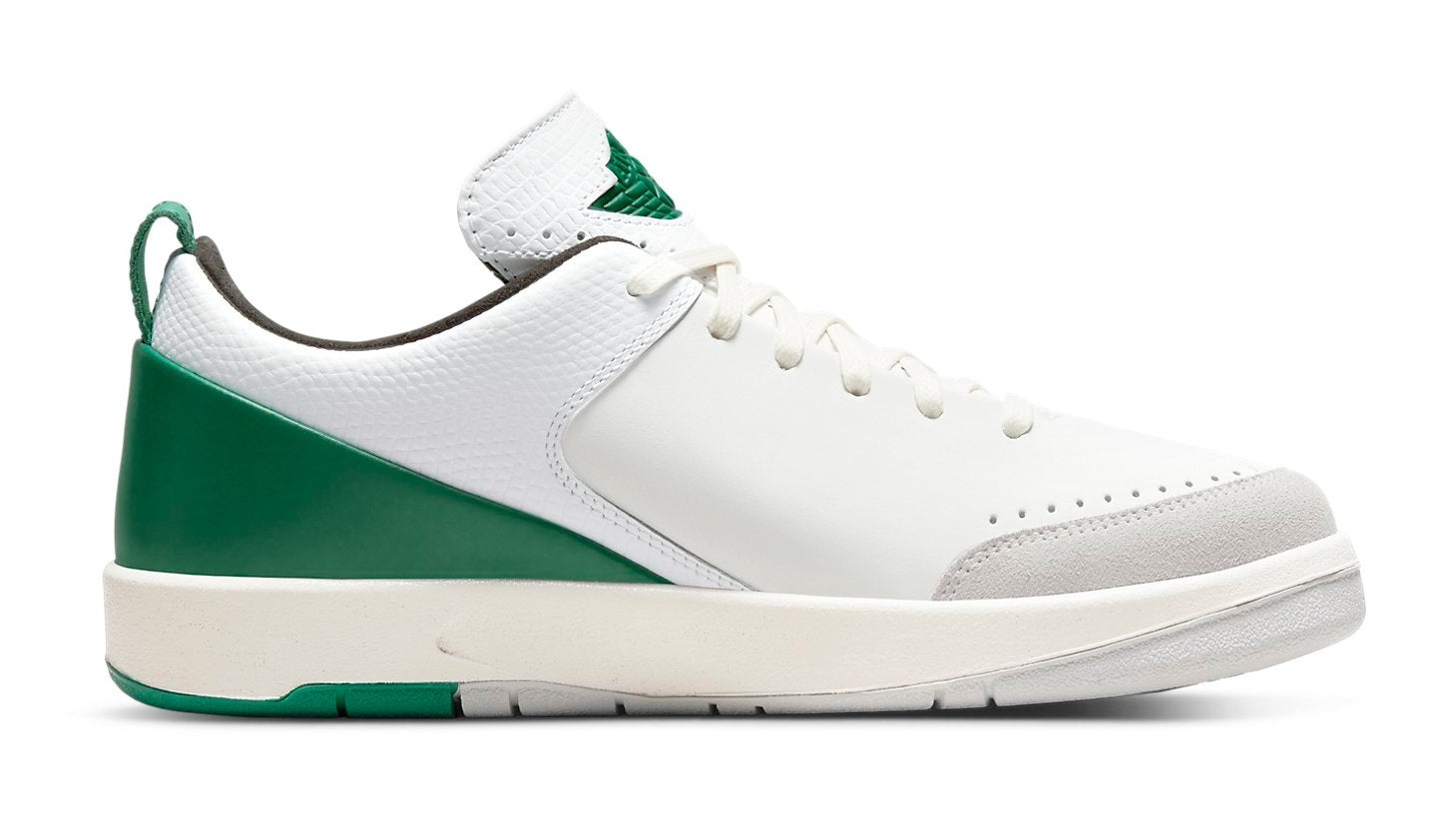 This sneaker is a clean, contemporary take on the Air Jordan 2 Low designed in collaboration with pop-surrealist artist Nina Chanel Abney. It features a primarily White premium leather upper with textured overlays and a grey suede toe wrap. The design is accented with striking Malachite (a deep, vibrant green) on the heel panel, piping, and the updated heel pull tab. The midsole uses a Sail (off-white) color to give the shoe a subtle vintage aesthetic. The sneaker comes with an oversized, special hangtag featuring one of Abney's illustrations and includes custom insoles with mismatched branding.