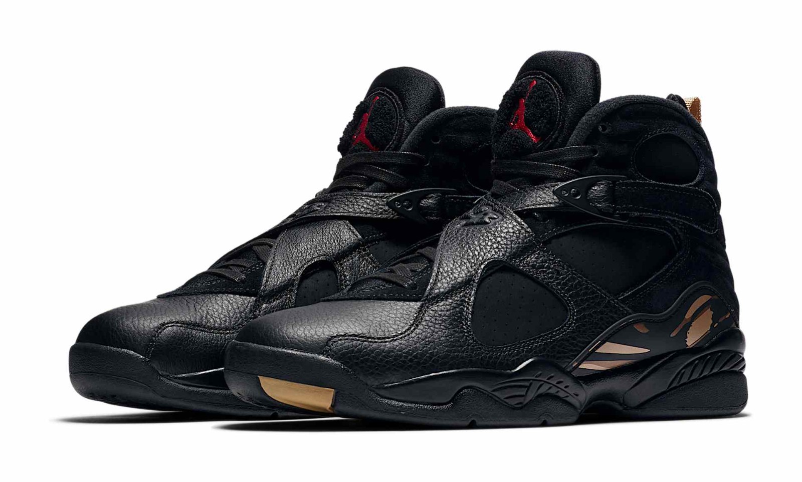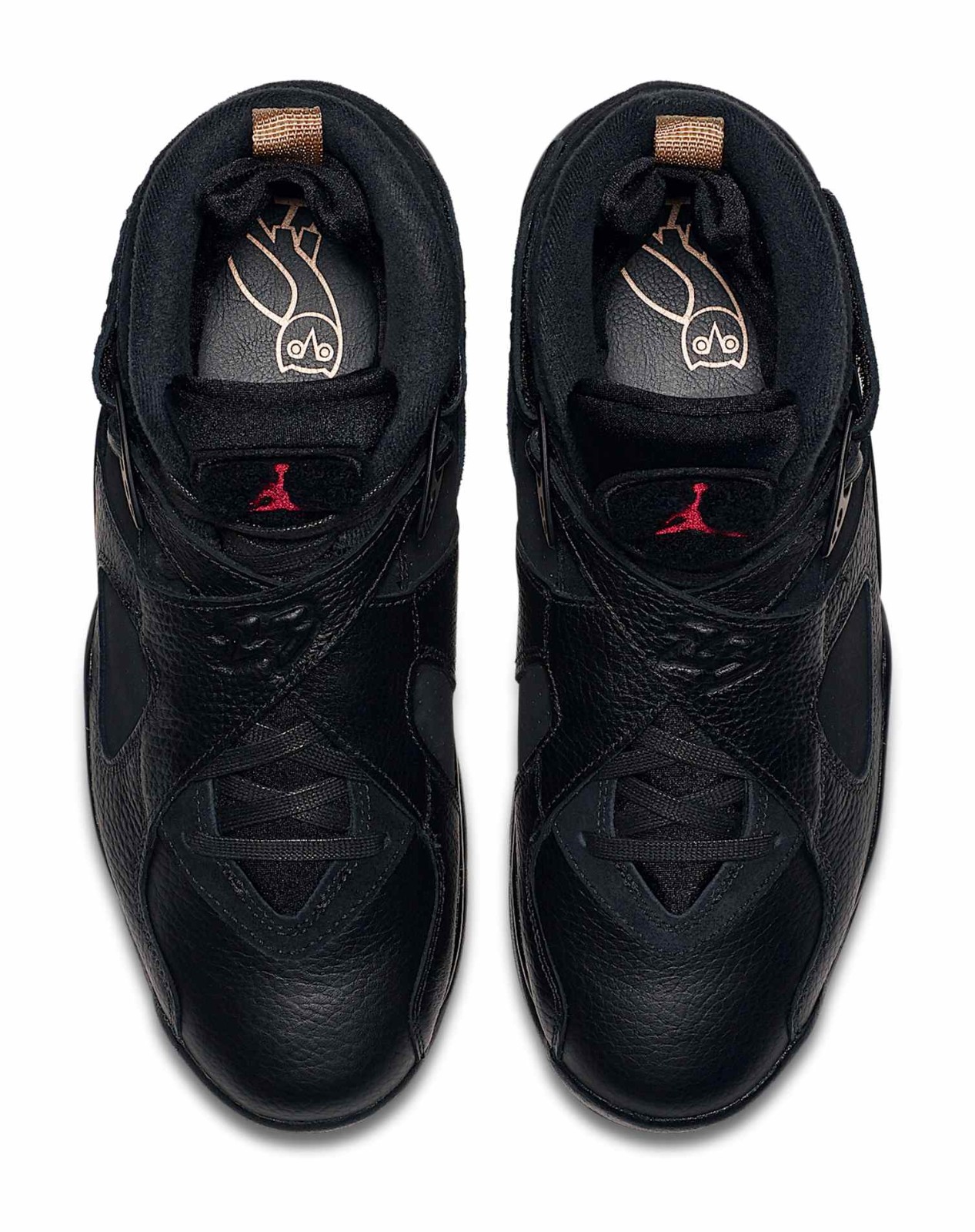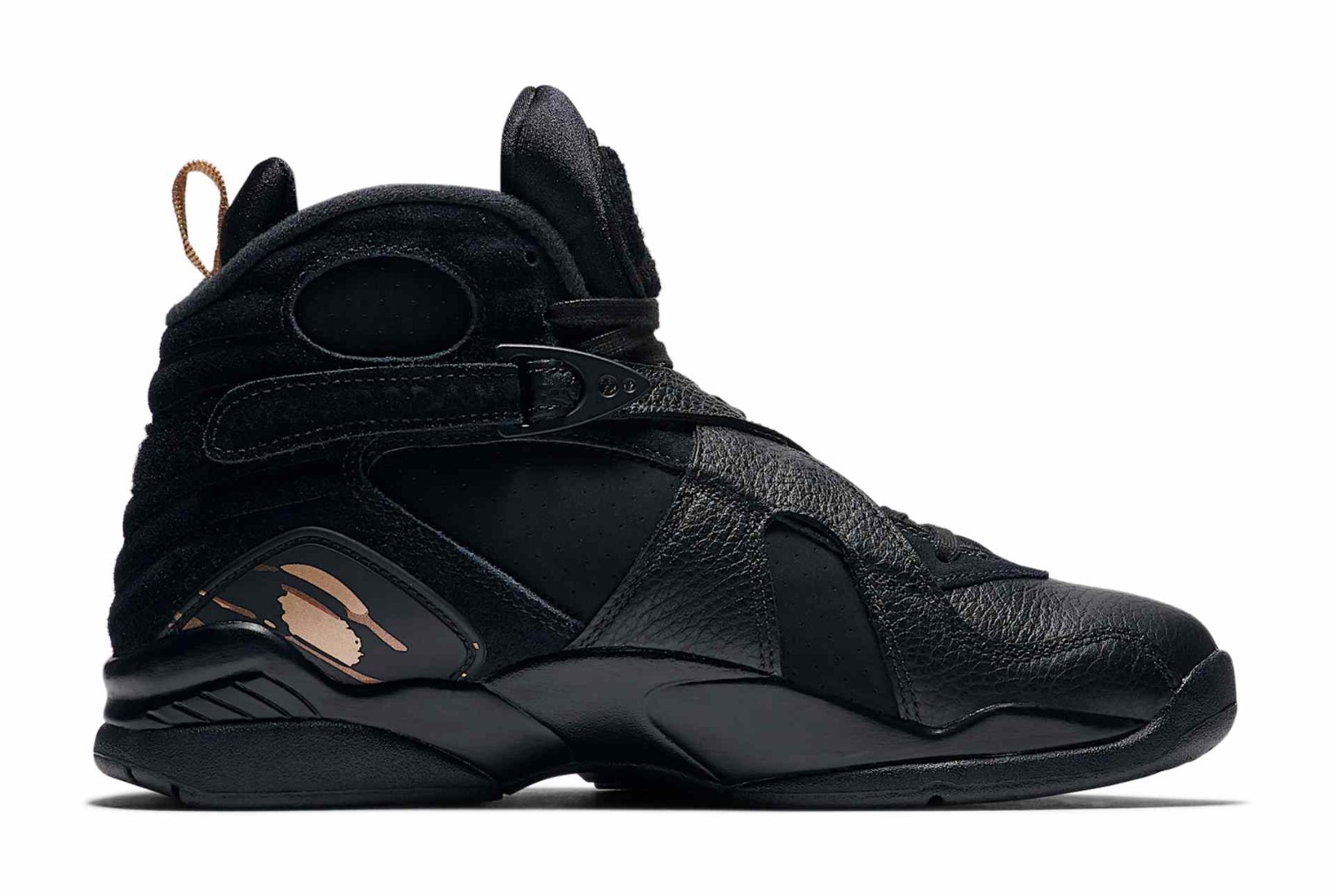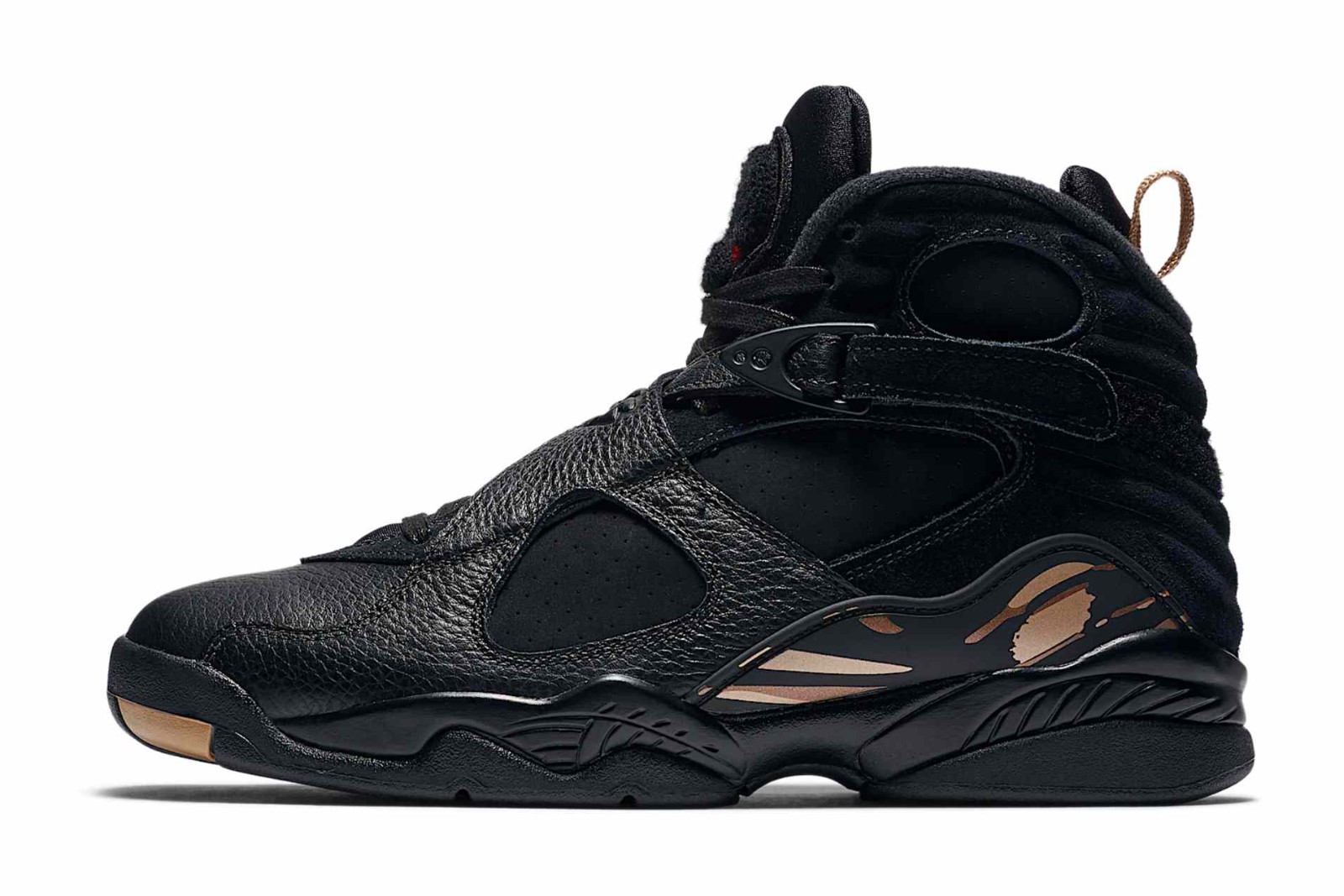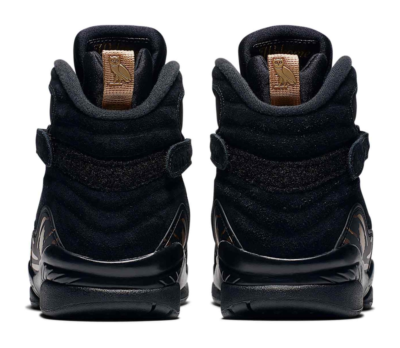 This model from the Jordan Brand is the official black colorway from the collaboration with Canadian rapper Drake's brand, October's Very Own (OVO). It uses the Air Jordan 8 silhouette, which Michael Jordan wore when he won his third NBA Championship. The shoe features a luxurious upper constructed primarily from Black leather and nubuck. Signature OVO details include the Metallic Gold accents on the Jumpman logo and the unique Owl logo (OVO's mascot) printed on the pull tabs on the heel. The black midsole is speckled with gold, and the shoe's inner lining and heel graphics utilize a pop of Varsity Red and Blur (a purplish-blue hue) from the original AJ8 design. The model comes with special OVO-branded packaging and insoles.