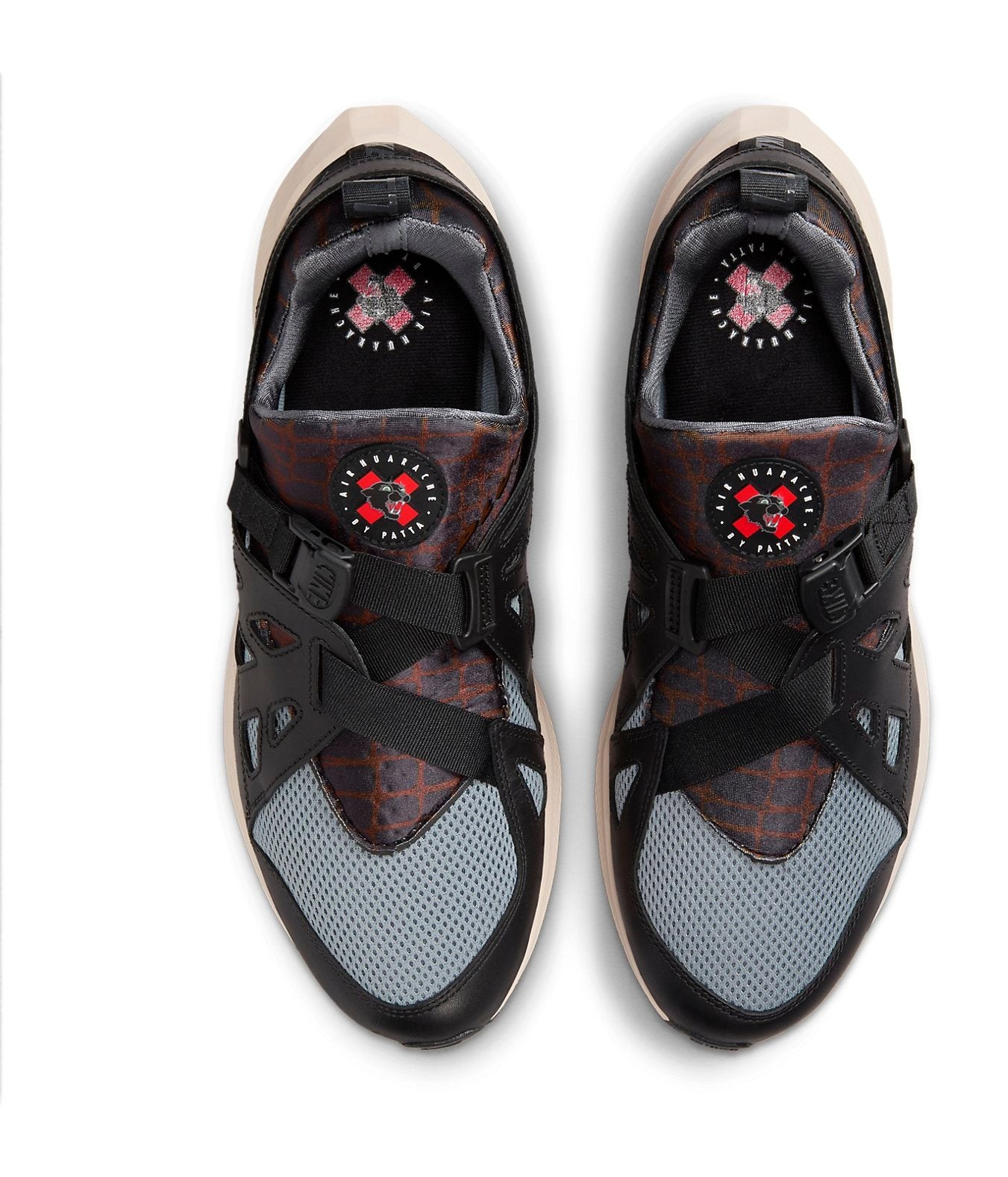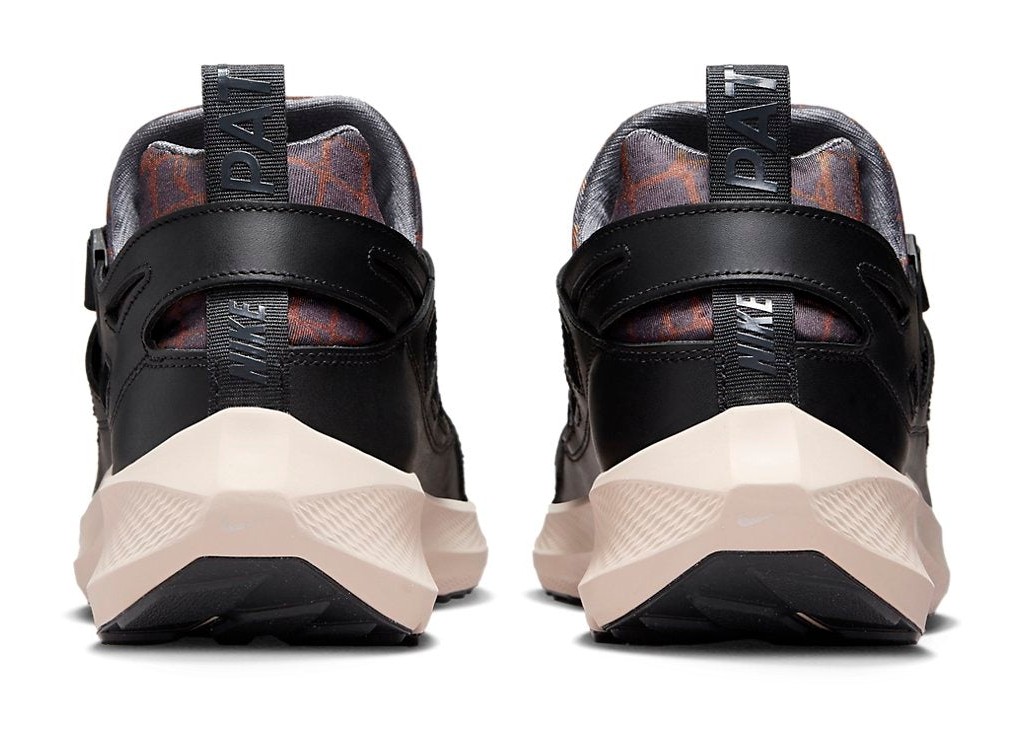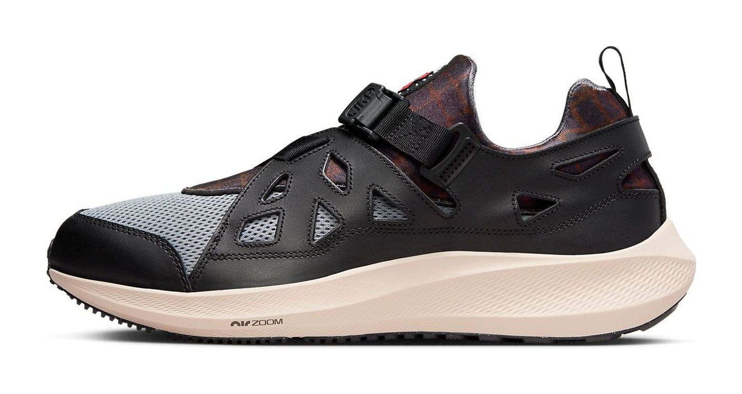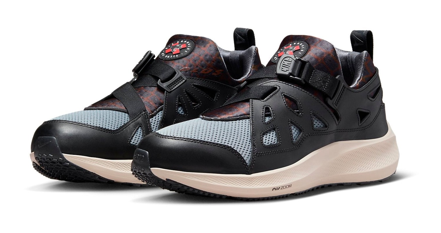 A hybrid model blending the upper of the Air Huarache Plus with the tooling of the modern Pegasus 40. The upper features a base of breathable Cool Grey mesh overlaid with large panels of Black leather. The signature neoprene inner bootie is accented with dark patterns, and the lacing is replaced with a cinched, adjustable strap system for a custom fit. The shoe rests on a thick, performance-focused midsole in Sanddrift (sail/off-white) that houses Nike React foam and Zoom Air units for superior comfort and a progressive look.