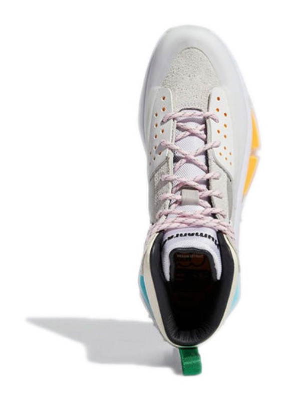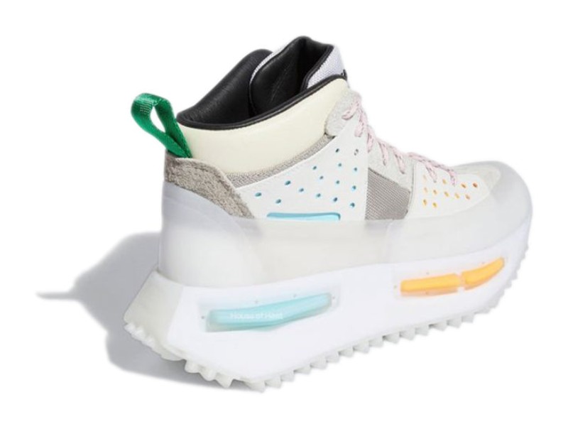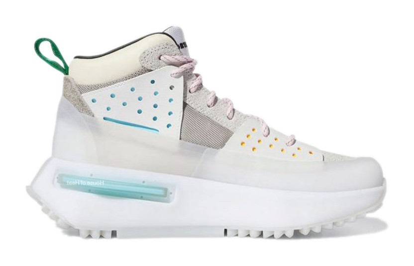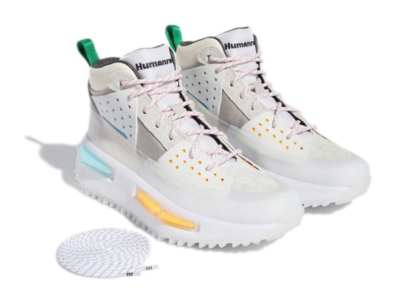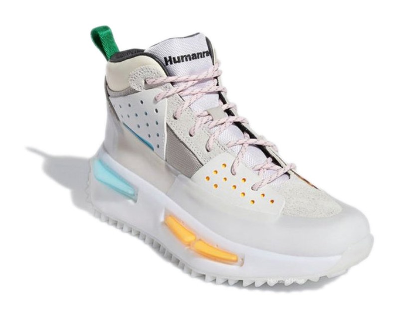 This was the debut colorway for the collaboration between adidas and Pharrell Williams' Humanrace on the NMD S1 RYAT silhouette, which blends trail-ready utility with futuristic street style. The high-top, boot-inspired upper is primarily a clean Core White and Cream White, constructed from a mix of textile, suede, and ballistic mesh. The shoe features a distinctive rubberized mudguard and toe cap for durability. Subtle accents of Clear Pink and orange appear on the TPU plugs embedded in the chunky sole unit and the outsole, adding a pop of color to the otherwise neutral design. The shoe incorporates a full-length BOOST midsole for superior cushioning.