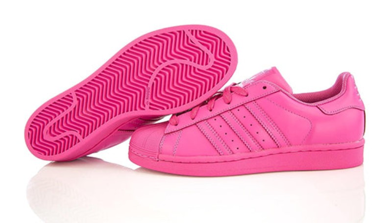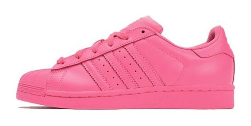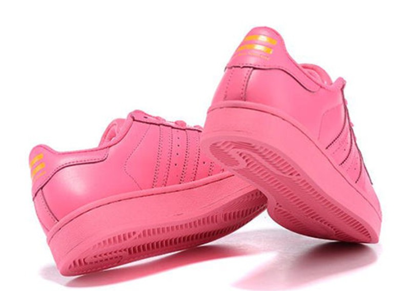 Part of the large "Supercolor" collection with musician Pharrell Williams, this men's sneaker is presented in a bright, monochromatic Semi Solar Pink. The entire leather upper, laces, sole, and classic shell toe are rendered in the same vibrant color.