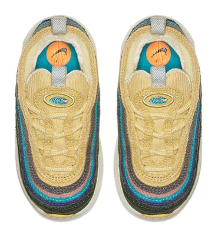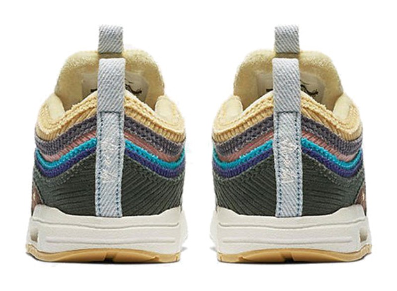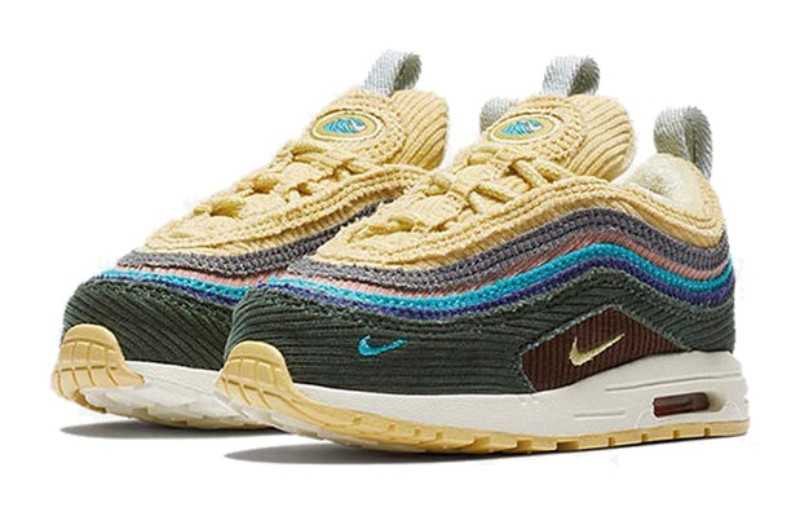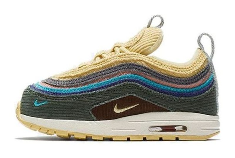 This is the toddler version of the famous Air Max 1/97, a hybrid model combining the upper of the Air Max 97 with the sole unit of the Air Max 1. The upper is constructed entirely from multicolored, vertically-striped corduroy in a mix of bright colors and earth tones, including shades of light blue, yellow, green, pink, and grey. It features a visible Air Max 1 unit and the corduroy material is designed to fray and age beautifully, which was a key feature of the full-size shoe designed by Sean Wotherspoon, the winner of the 2017 Vote Forward contest.