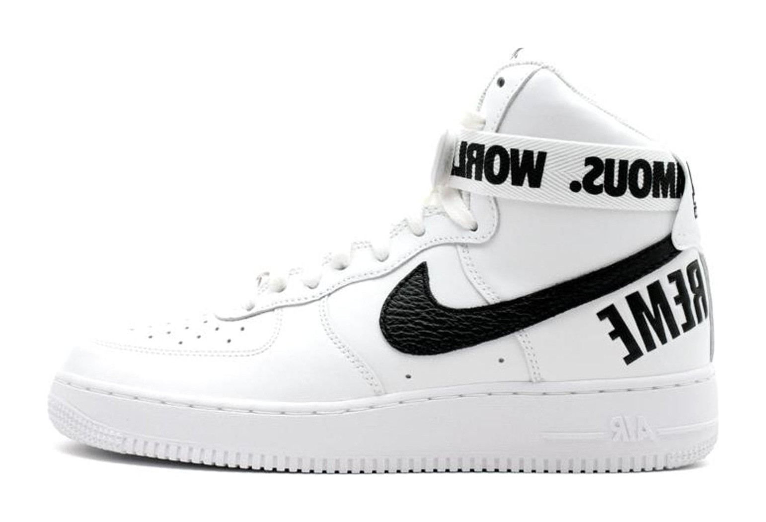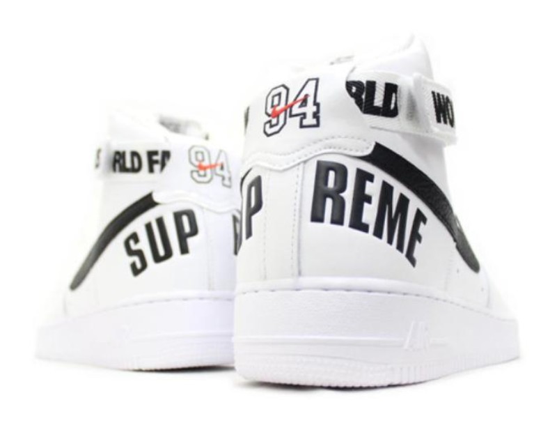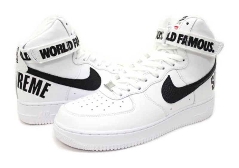 This sneaker features a predominantly White colorway, constructed with a premium white leather upper and subtle contrasting black accents. It is instantly recognizable as a collaboration with Supreme due to the bold branding elements, including the phrase "World Famous" emblazoned across the ankle strap. The large Nike Swoosh is made of a pebbled leather texture, and the iconic Supreme arc logo is featured prominently on the back heel. The shoe also includes a small "94" logo on the heel patch, a nod to the year Supreme's first store opened.