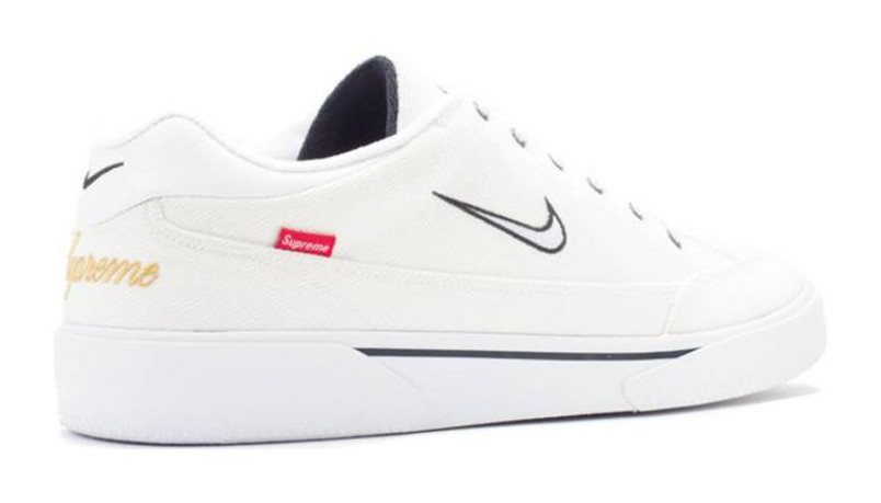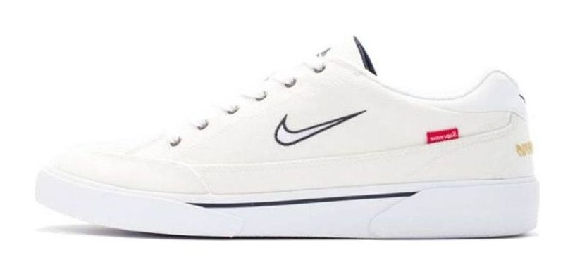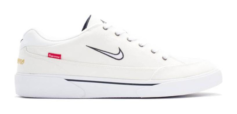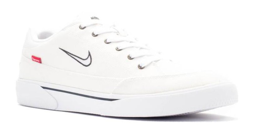 This sneaker is a reimagining of the classic GTS tennis shoe for the skate market, released as a collaboration with Supreme. It features a primarily white herringbone canvas upper with contrasting Dark Obsidian accents. The design is finished with a small, embroidered Supreme logo on the heel, a small Nike Swoosh, and a vulcanized sole.