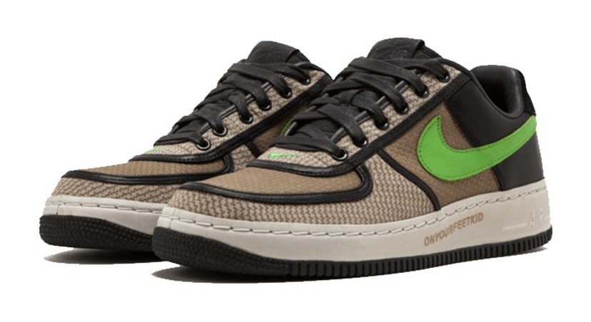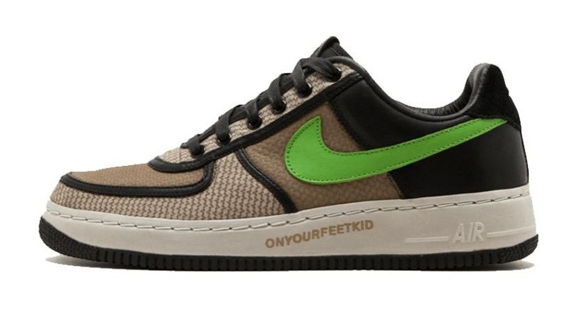 Part of the rare "Insideout Priority" series and a collaboration with Undefeated. This Air Force 1 Low features a unique mix of materials and colors, including a brown jacquard-patterned textile on the quarter panels, black suede on the heel, and a vibrant 'Green Bean' leather for the Swoosh. Black leather piping provides contrast across the design, and the shoe famously features the "ONYOURFEETKID" text printed on the midsole, a nod to the collaborative nature and exclusivity of the release.